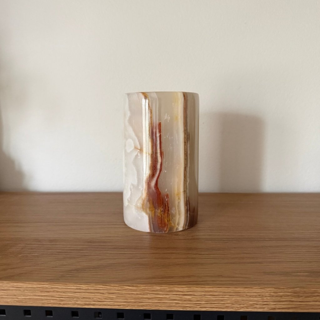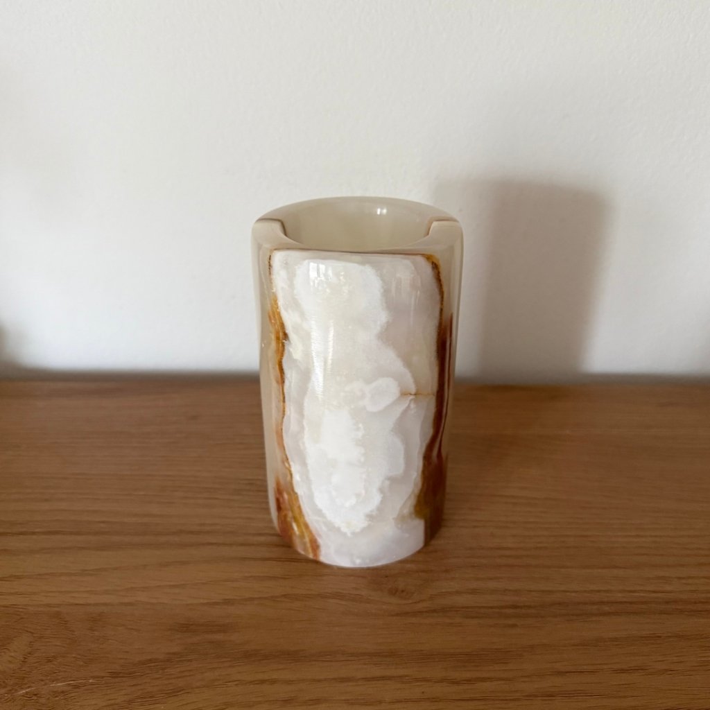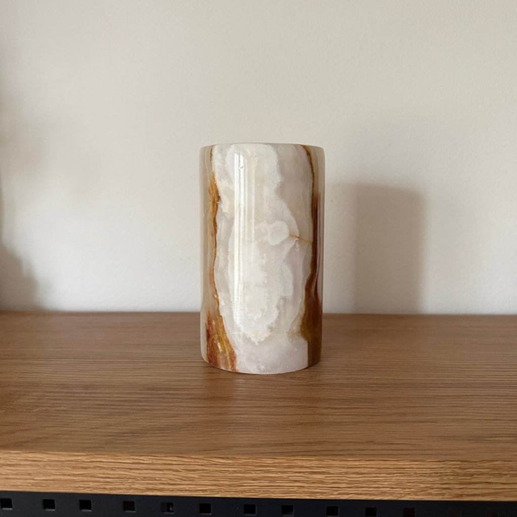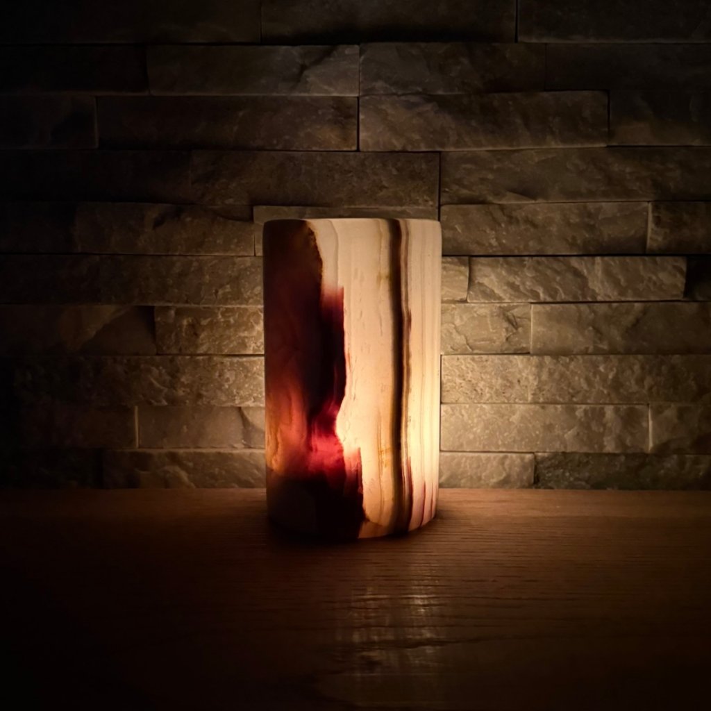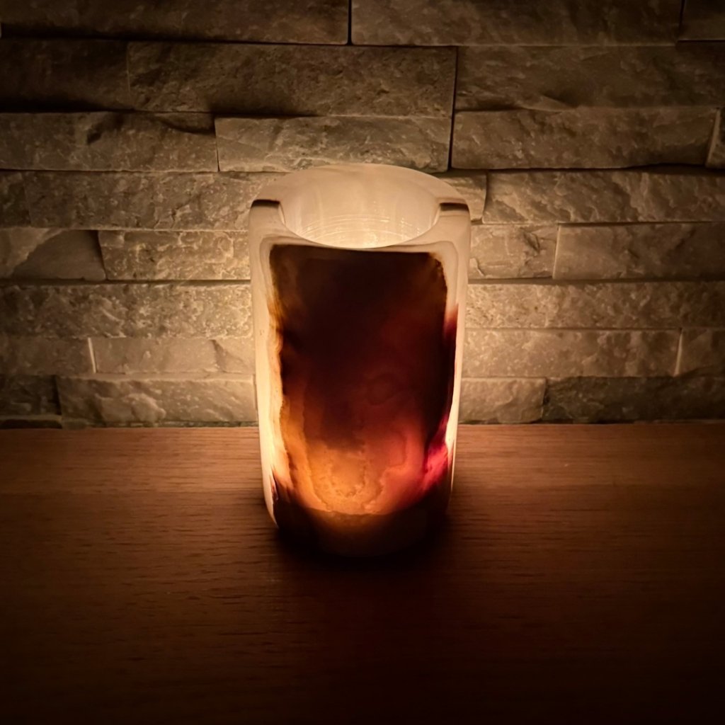 Svícen je vyroben z přírodního aragonitu, známého také jako pákistánský onyx. Tento kámen vyniká pevností, jemným leskem a přirozenou kresbou, která vznikala po tisíce let. Kupujete přesně ten svícen, který vidíte na fotografiích, žádný náhodný výběr, ale konkrétní originální kus.