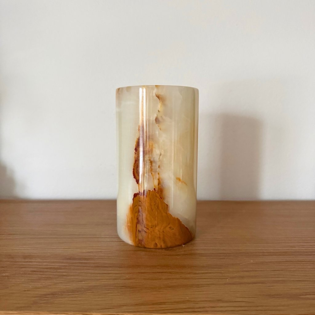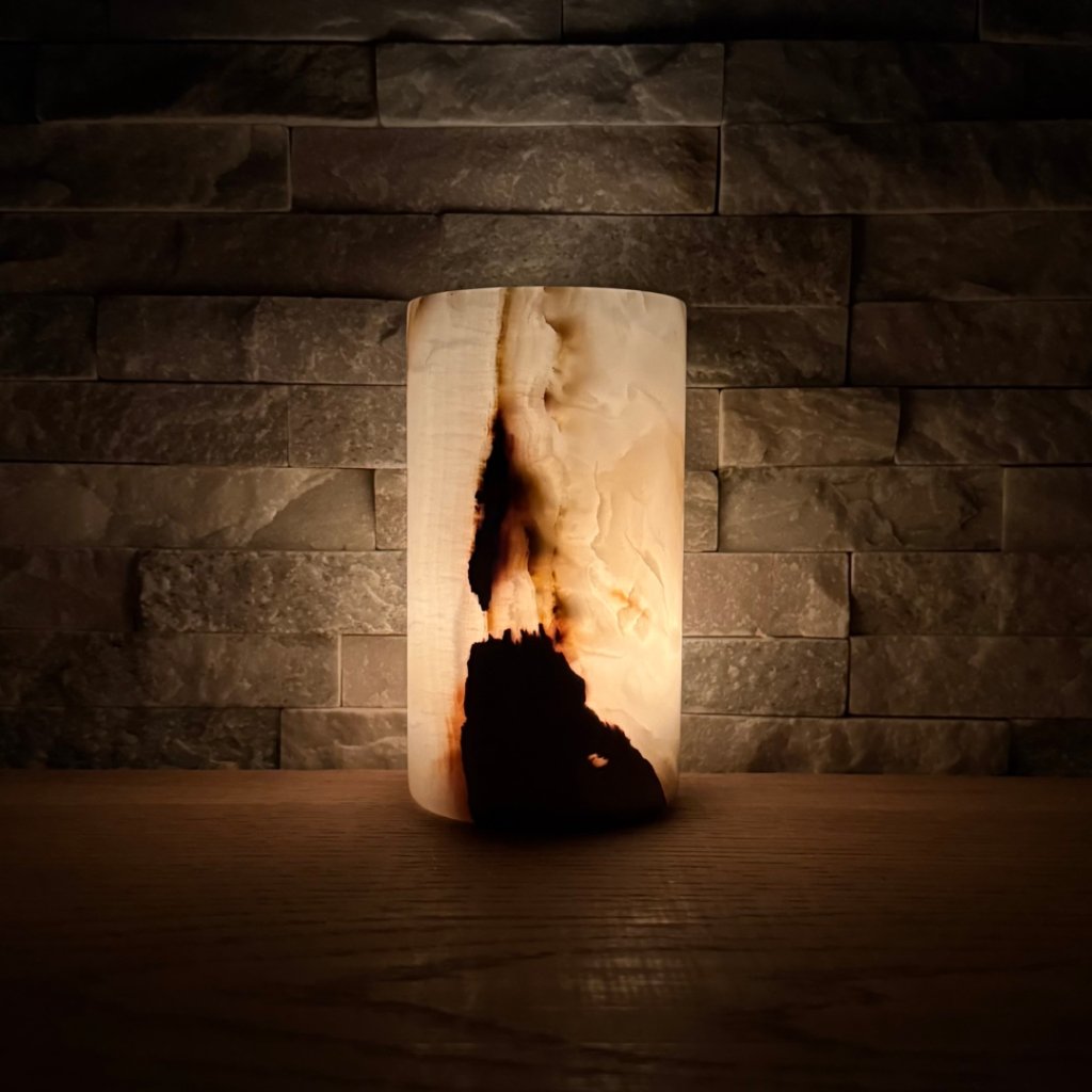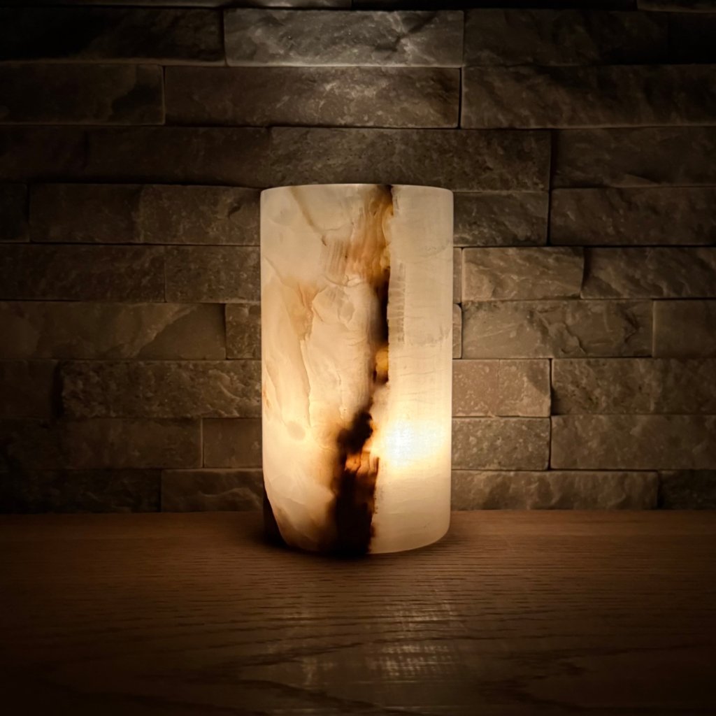 Svícen je vyroben z přírodního aragonitu, známého také jako pákistánský onyx. Tento kámen vyniká pevností, jemným leskem a přirozenou kresbou, která vznikala po tisíce let. Kupujete přesně ten svícen, který vidíte na fotografiích, žádný náhodný výběr, ale konkrétní originální kus.