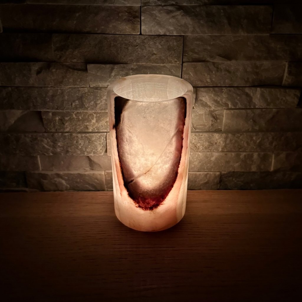 - Krásný ve dne, ještě hlubší večer – denní světlo ukáže kresbu kamene, zapálená svíčka jí přidá hloubku, teplo a klidnou atmosféru.