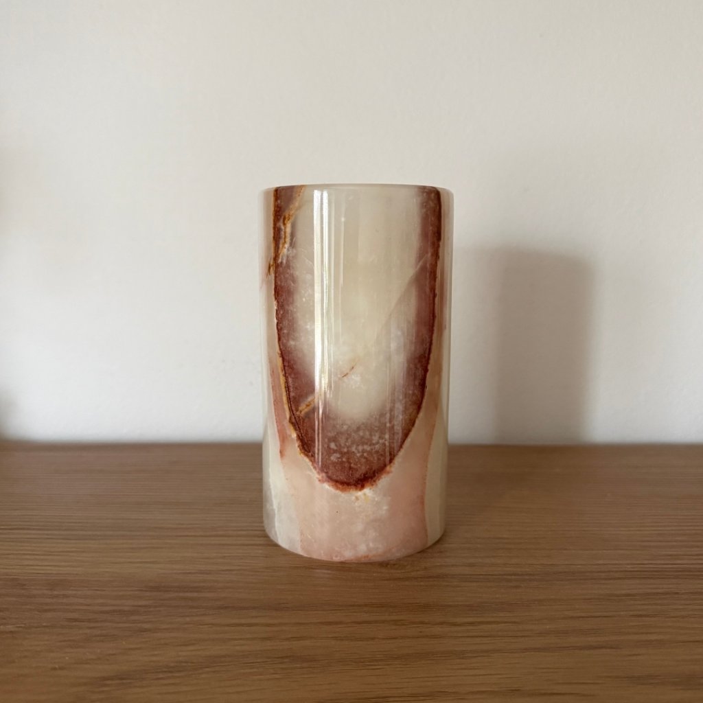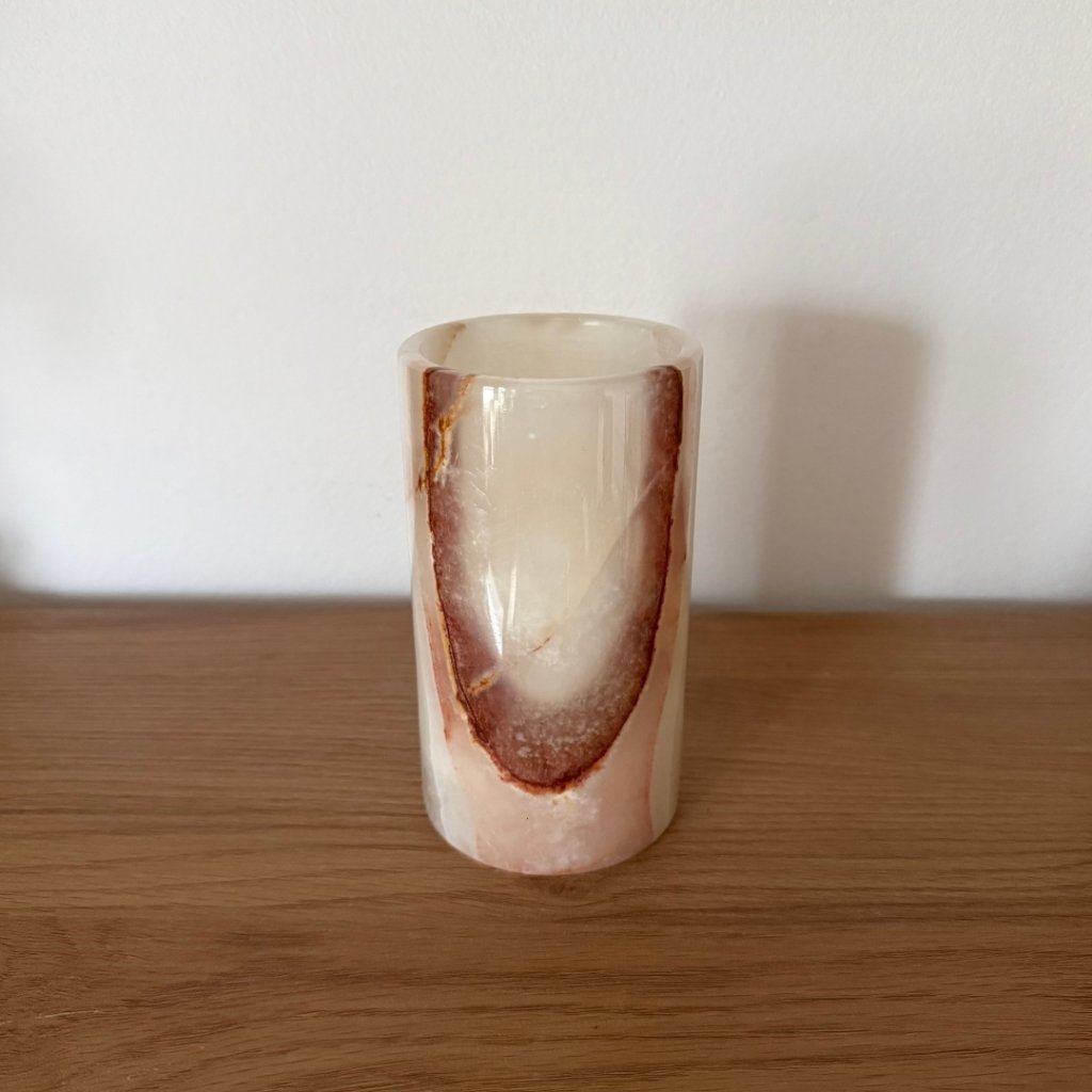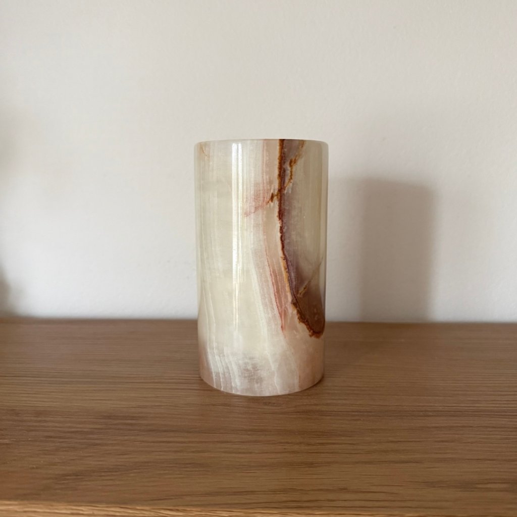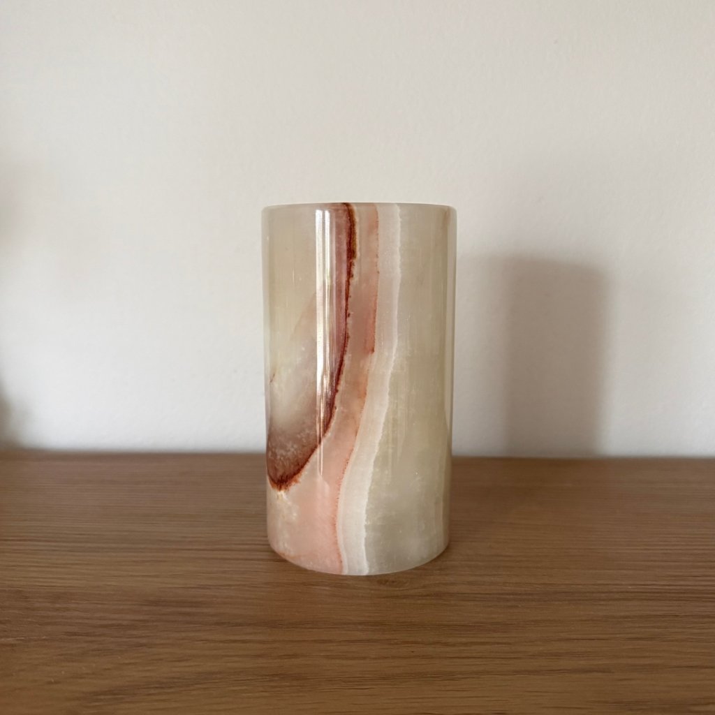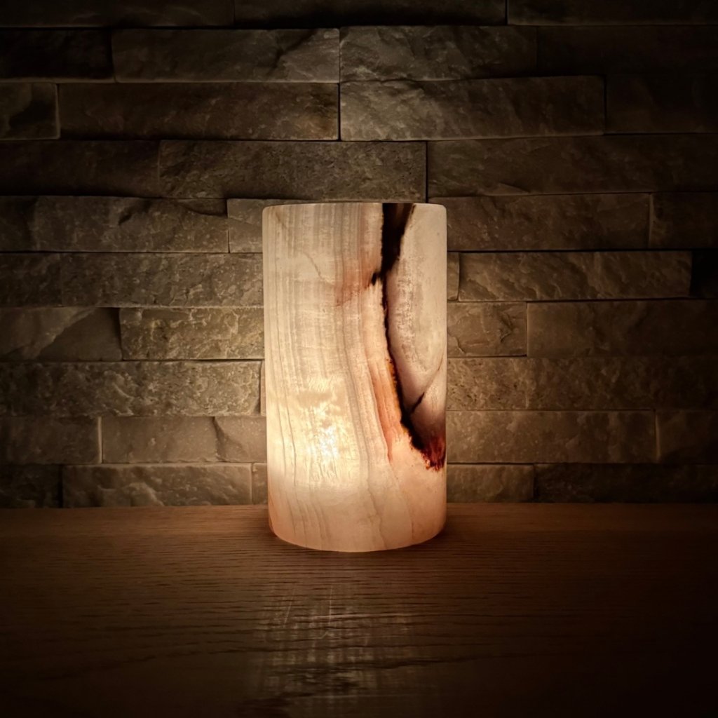Svícen je vyroben z přírodního aragonitu, známého také jako pákistánský onyx. Tento kámen vyniká pevností, jemným leskem a přirozenou kresbou, která vznikala po tisíce let. Kupujete přesně ten svícen, který vidíte na fotografiích, žádný náhodný výběr, ale konkrétní originální kus.