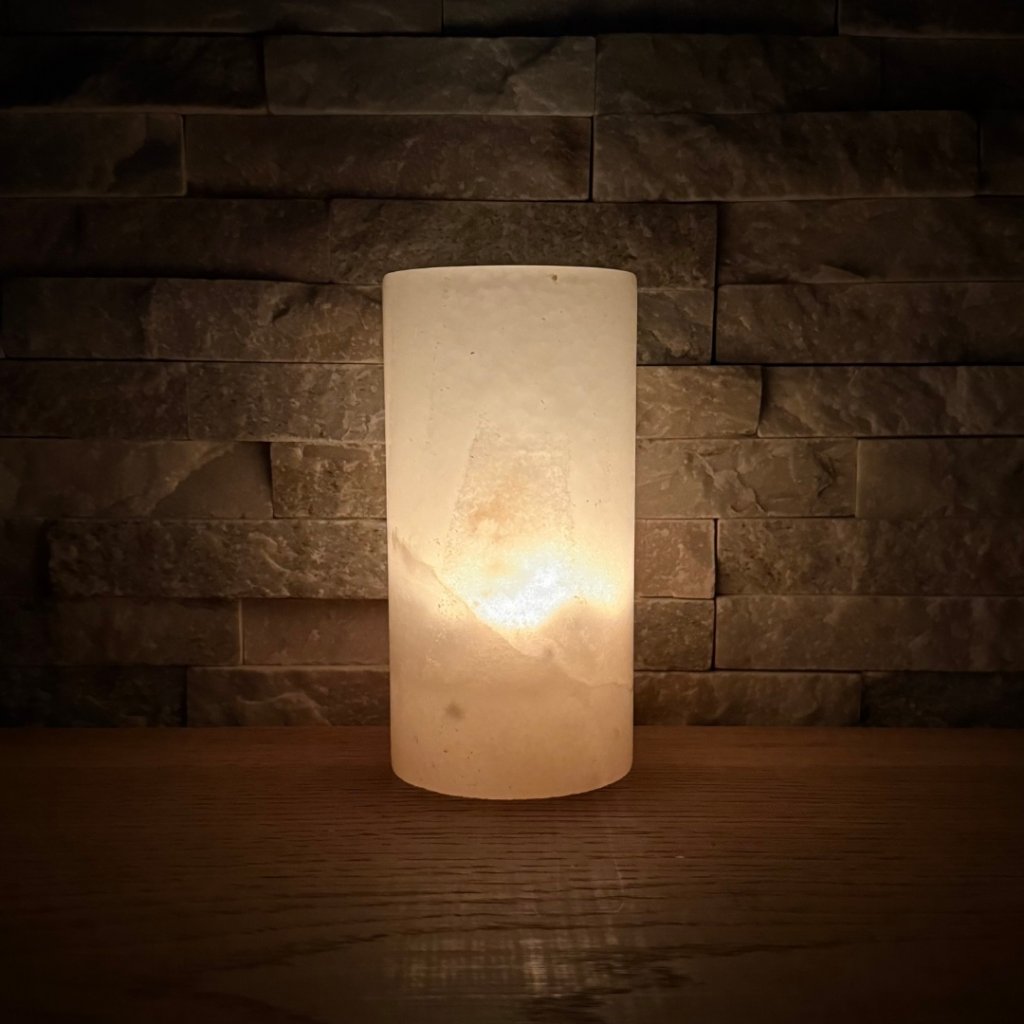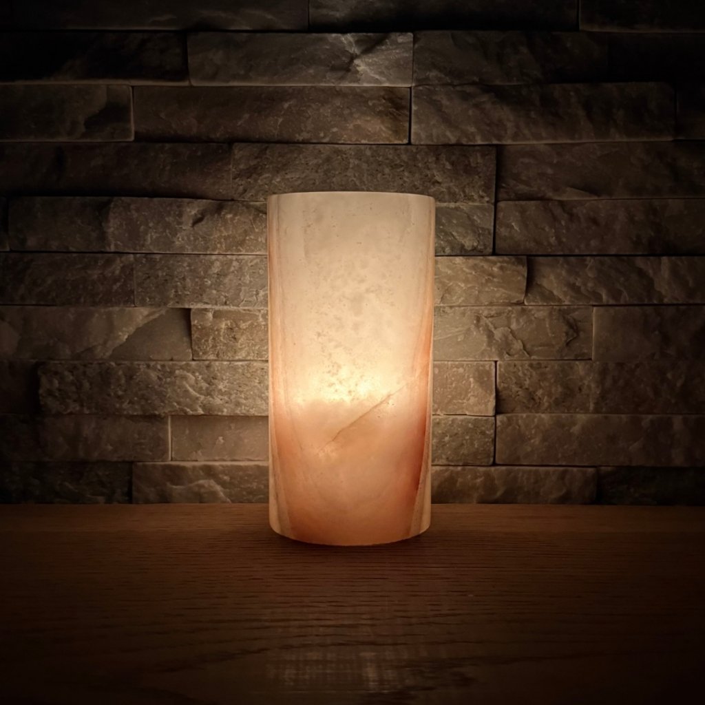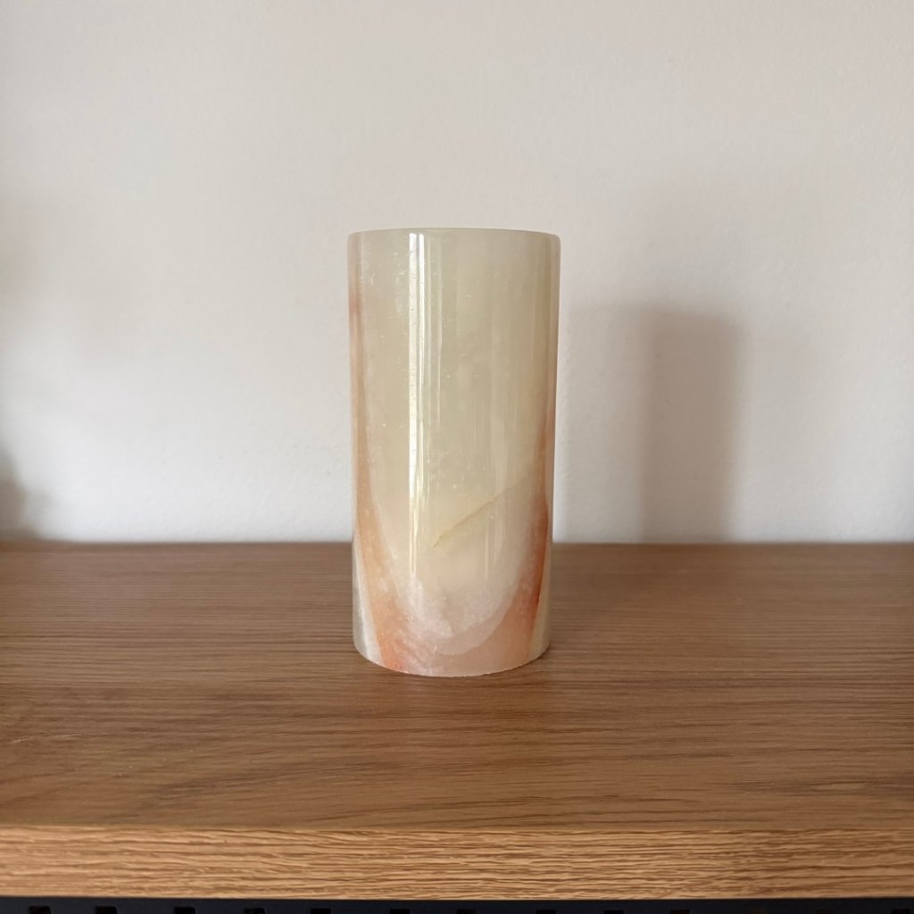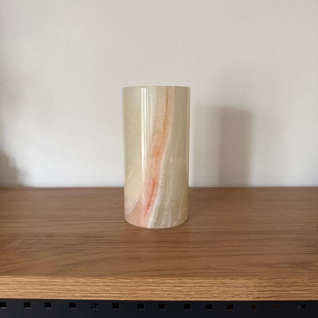 Svícen je vyroben z přírodního aragonitu, známého také jako pákistánský onyx. Tento kámen vyniká pevností, jemným leskem a přirozenou kresbou, která vznikala po tisíce let. Kupujete přesně ten svícen, který vidíte na fotografiích, žádný náhodný výběr, ale konkrétní originální kus.
