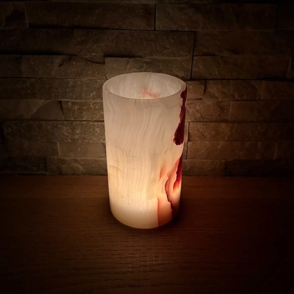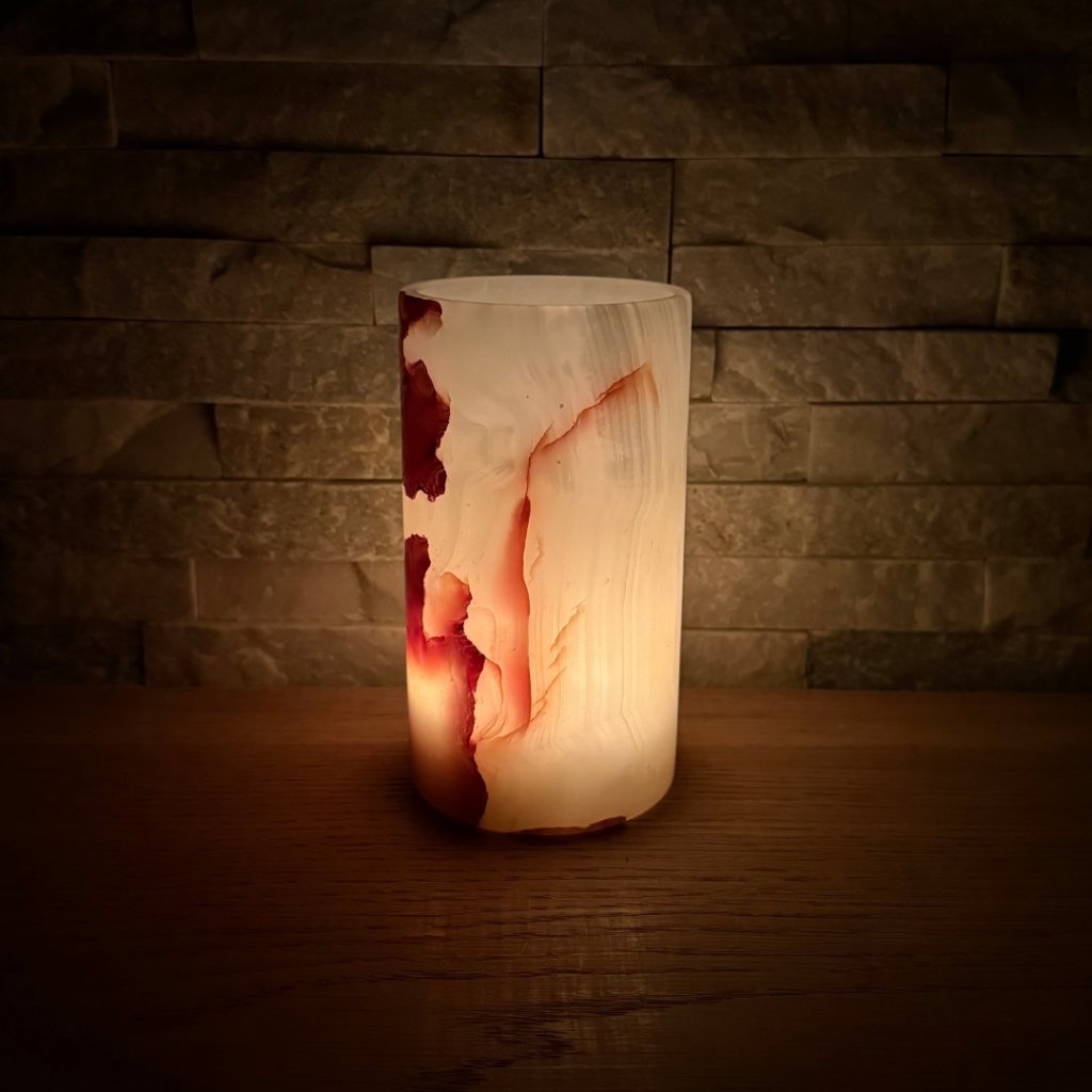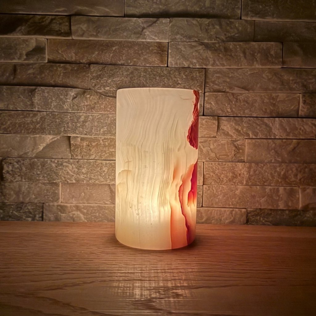 Svícen je vyroben z přírodního aragonitu, známého také jako pákistánský onyx. Tento kámen vyniká pevností, jemným leskem a přirozenou kresbou, která vznikala po tisíce let. Kupujete přesně ten svícen, který vidíte na fotografiích, žádný náhodný výběr, ale konkrétní originální kus.