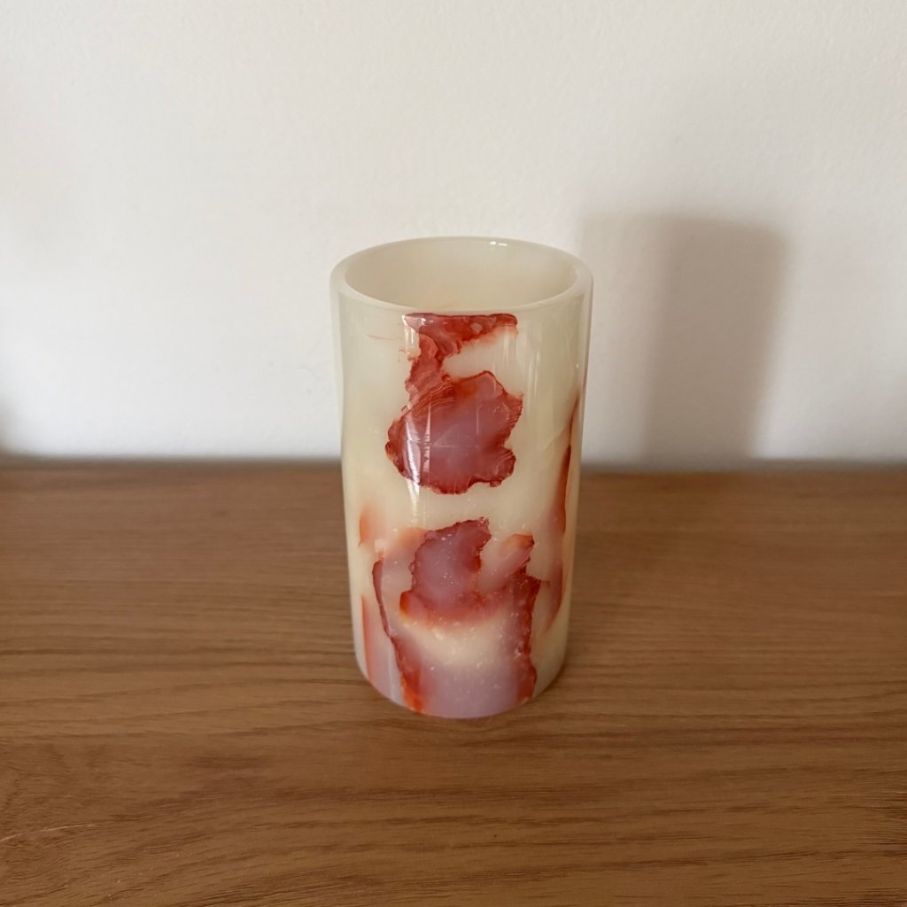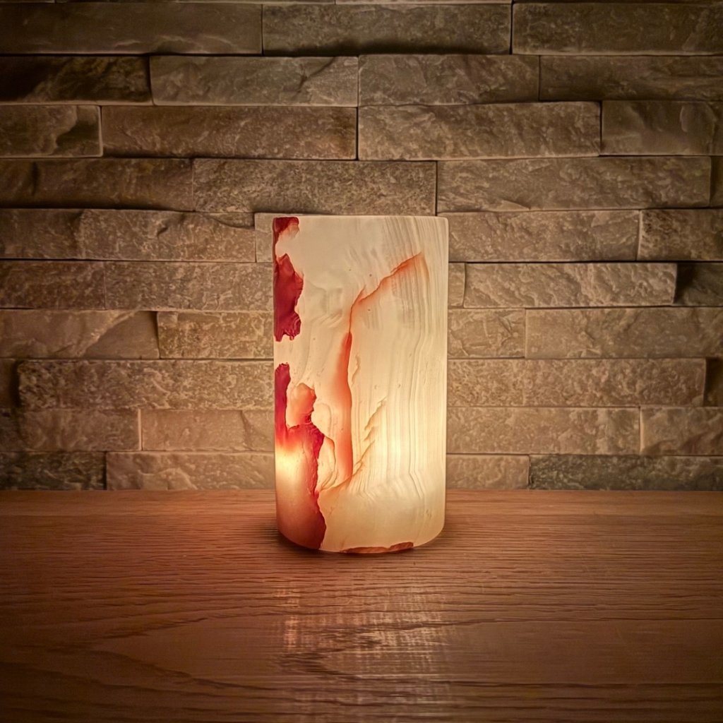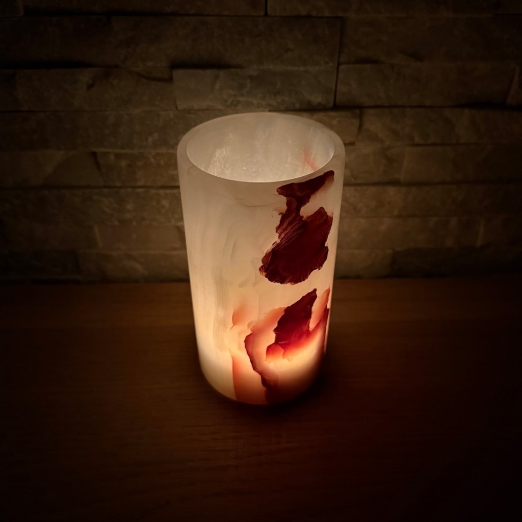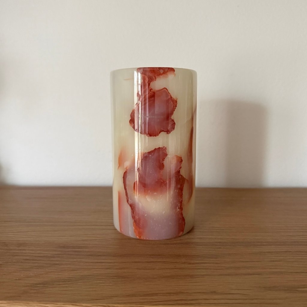 Svícen je vyroben z přírodního aragonitu, známého také jako pákistánský onyx. Tento kámen vyniká pevností, jemným leskem a přirozenou kresbou, která vznikala po tisíce let. Kupujete přesně ten svícen, který vidíte na fotografiích, žádný náhodný výběr, ale konkrétní originální kus.