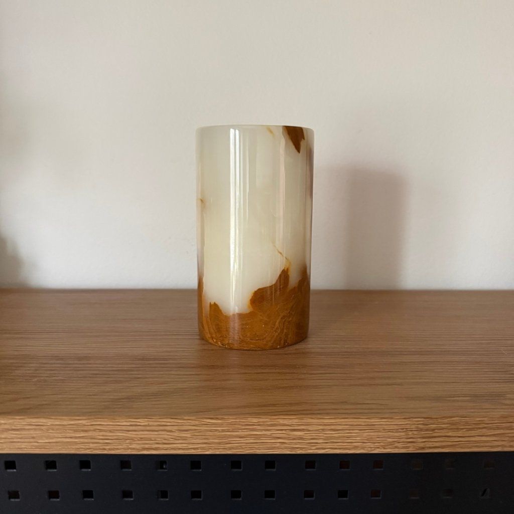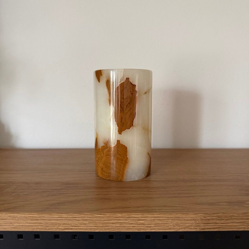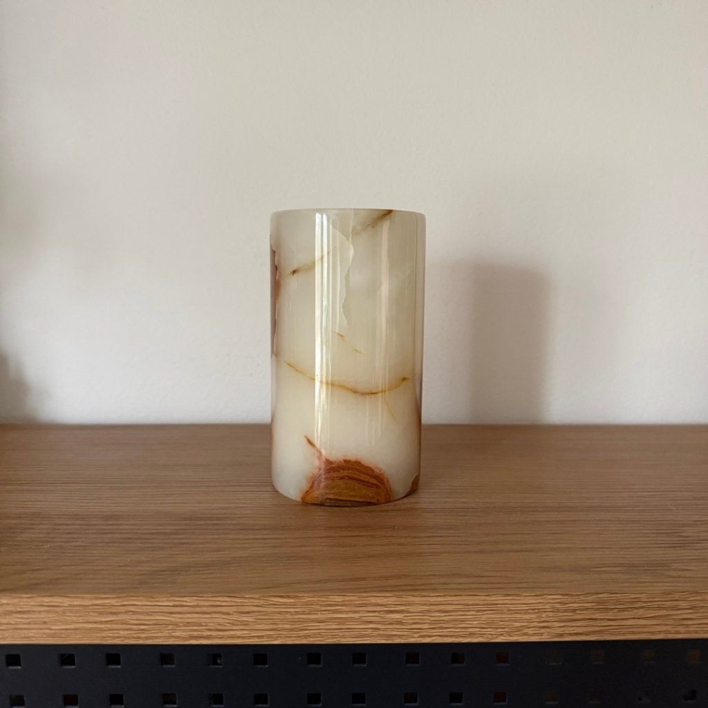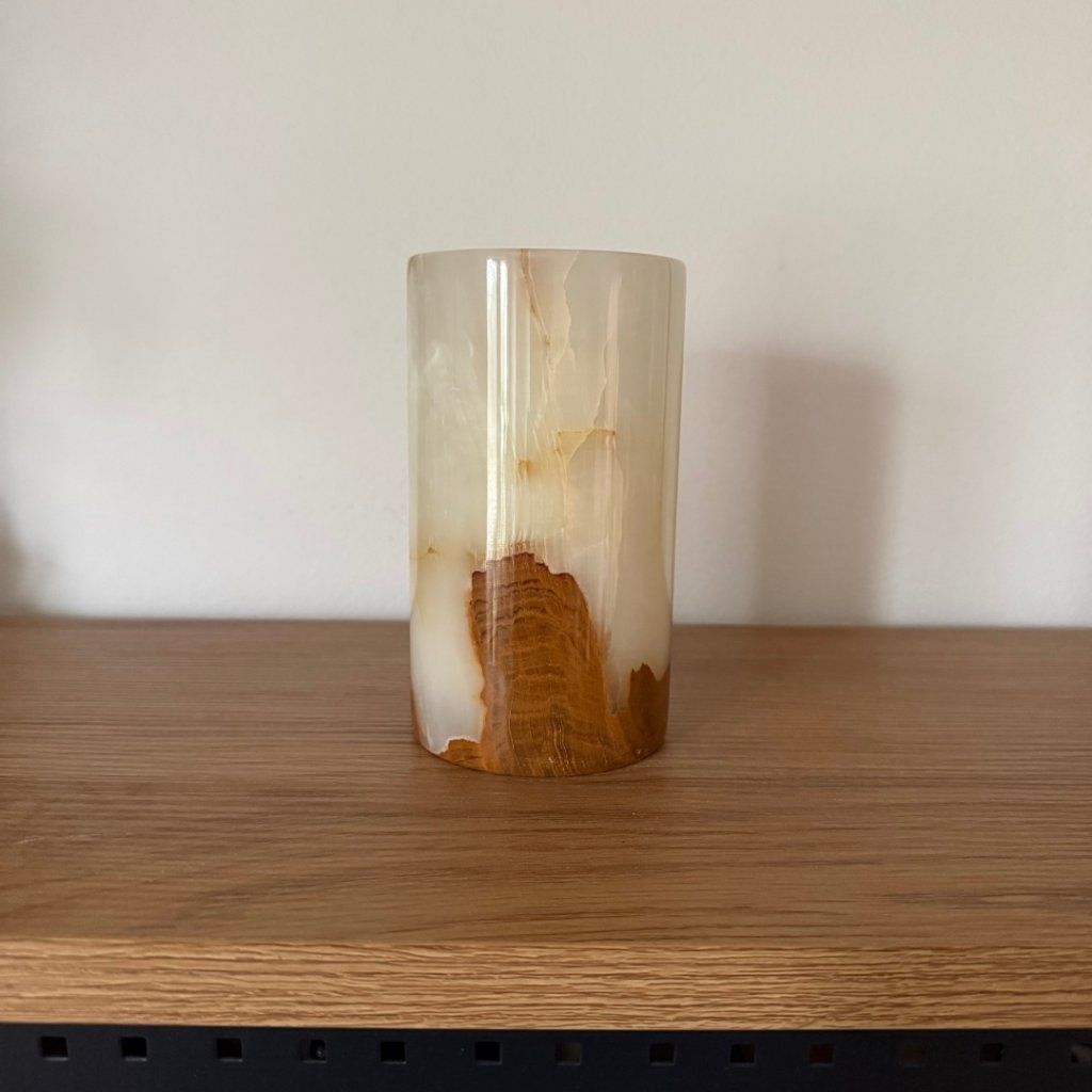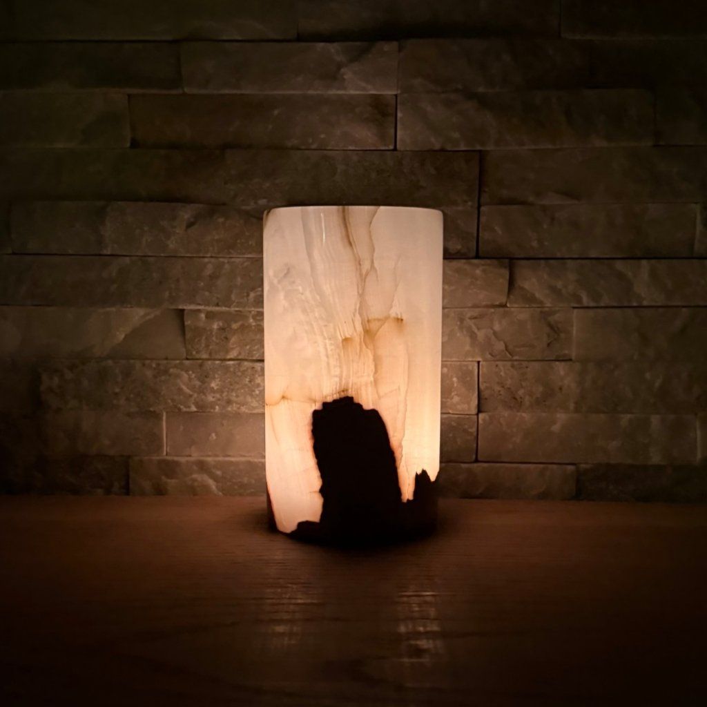Svícen je vyroben z přírodního aragonitu, známého také jako pákistánský onyx. Tento kámen vyniká pevností, jemným leskem a přirozenou kresbou, která vznikala po tisíce let. Kupujete přesně ten svícen, který vidíte na fotografiích, žádný náhodný výběr, ale konkrétní originální kus.