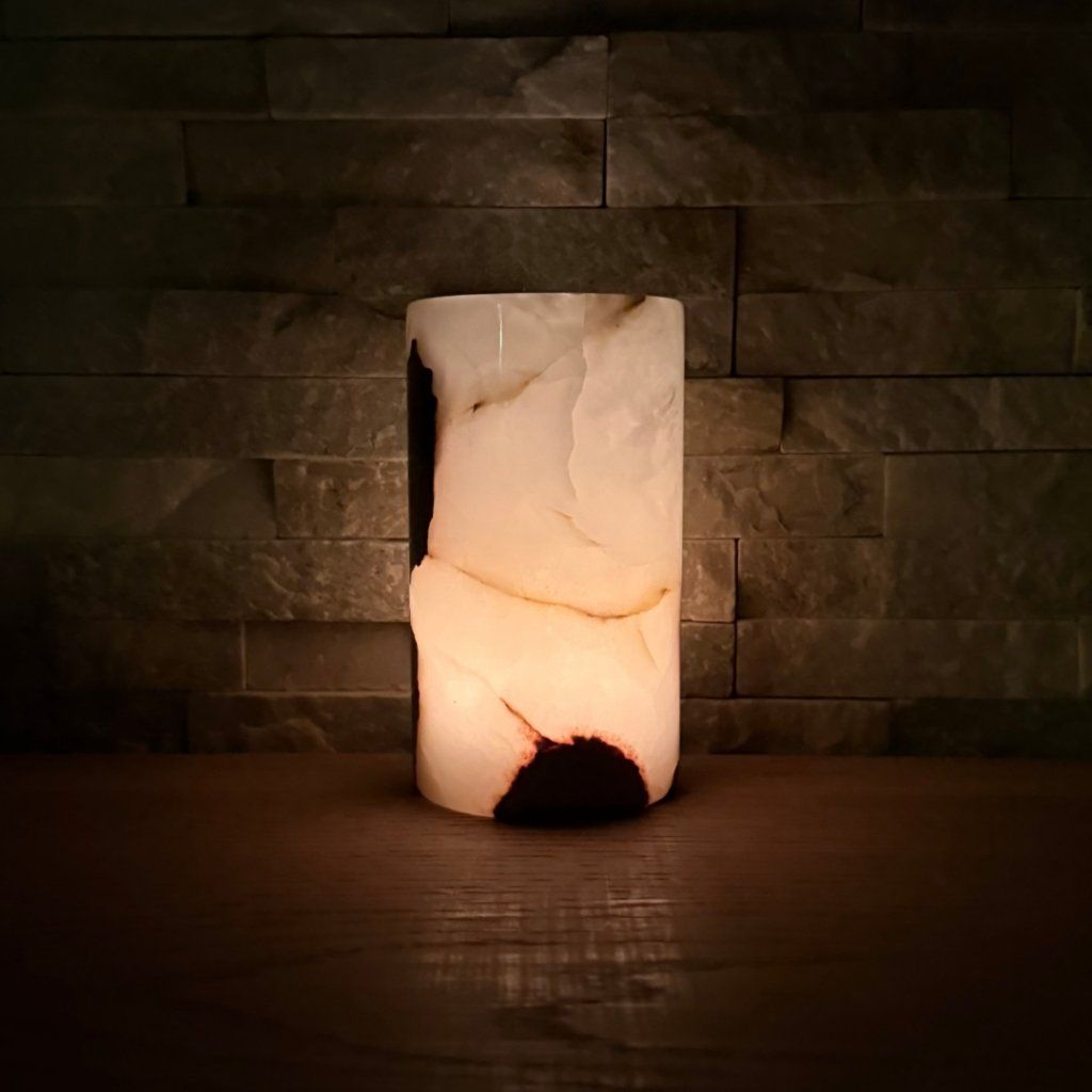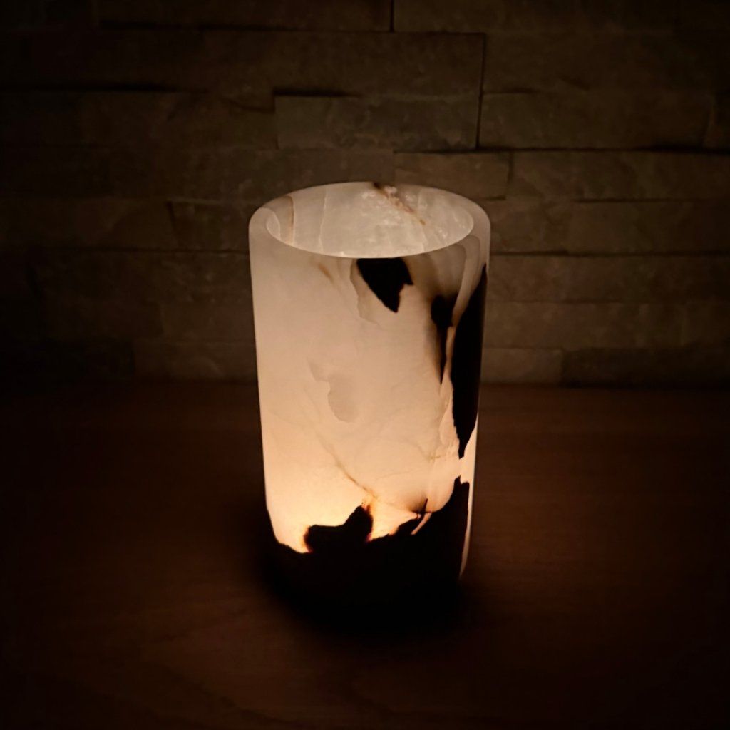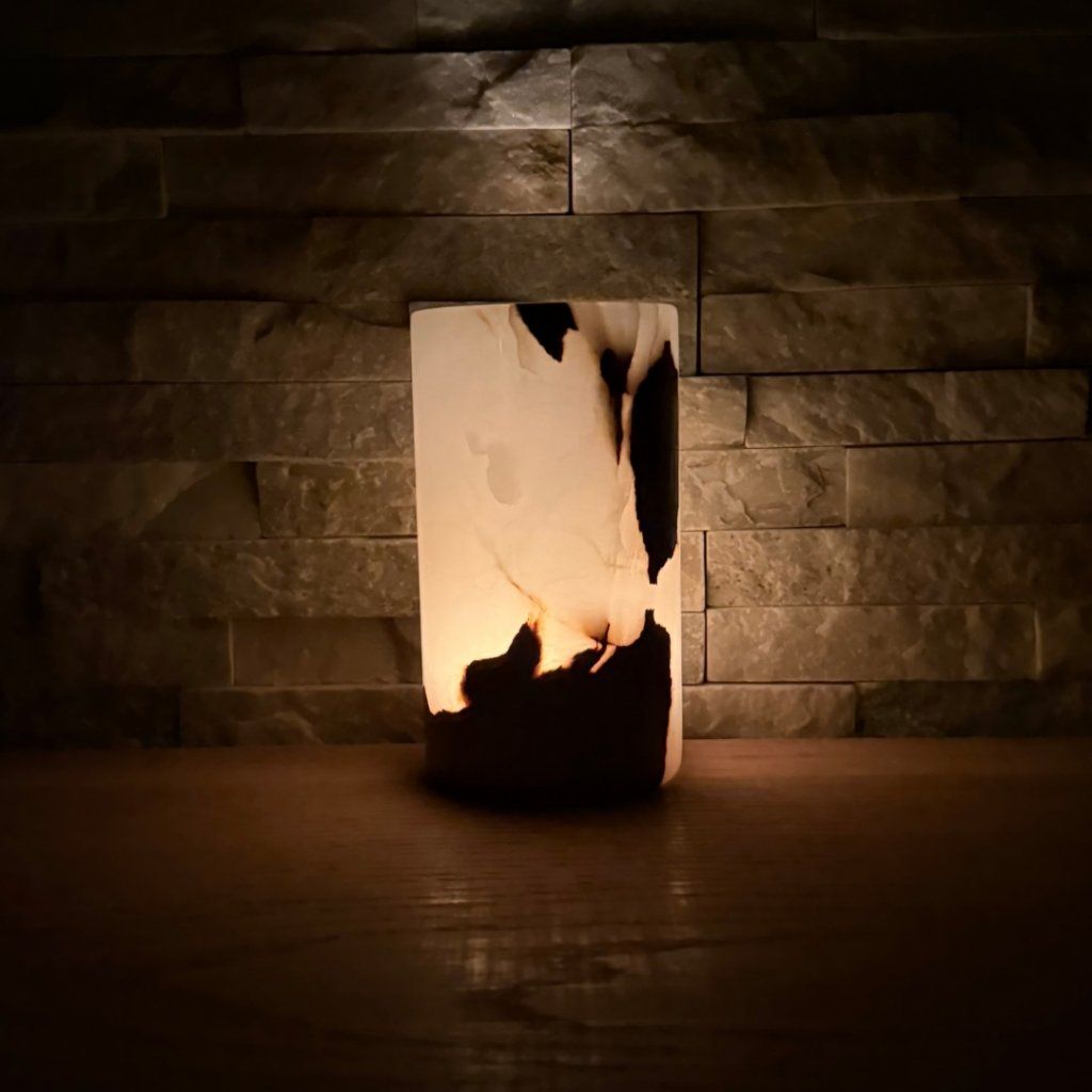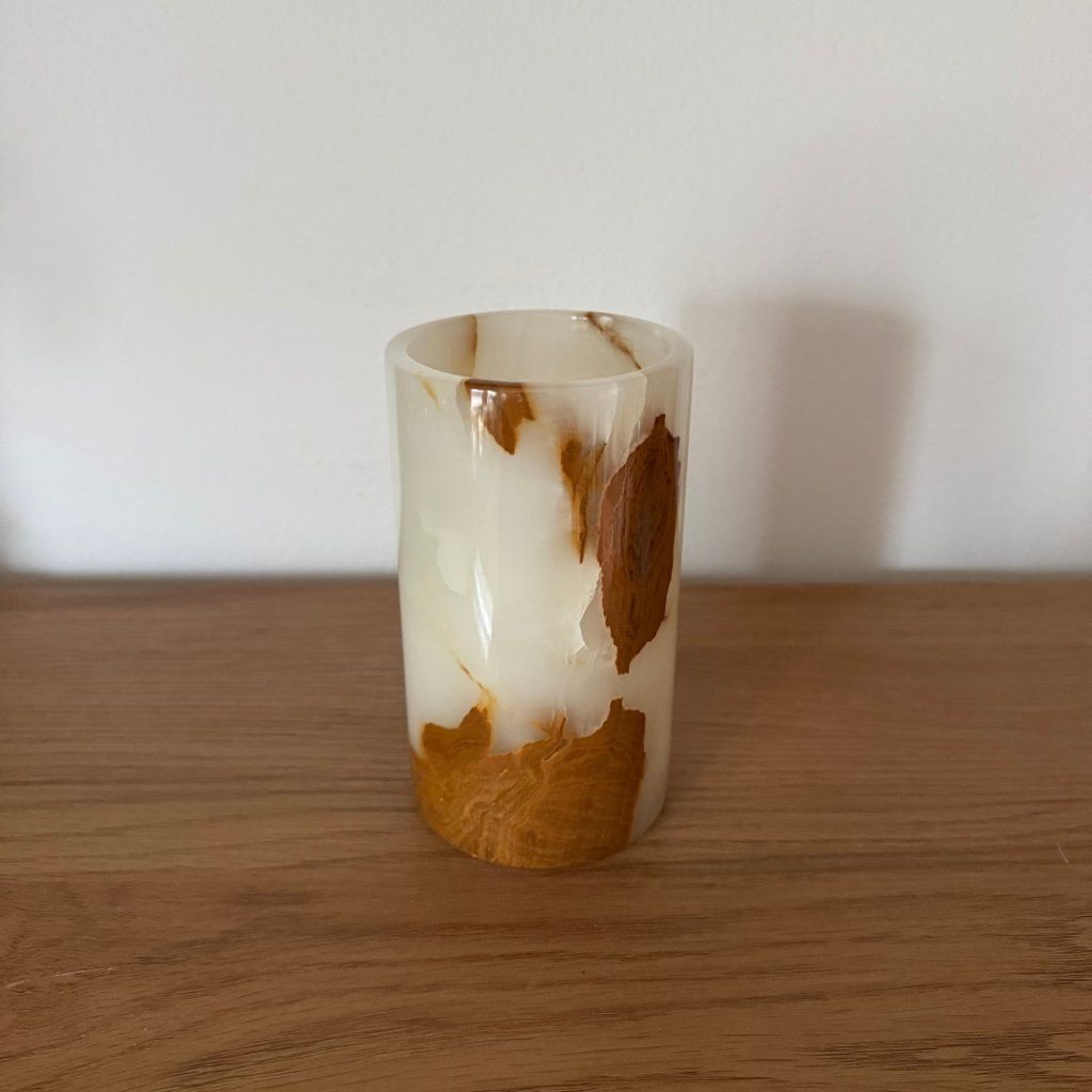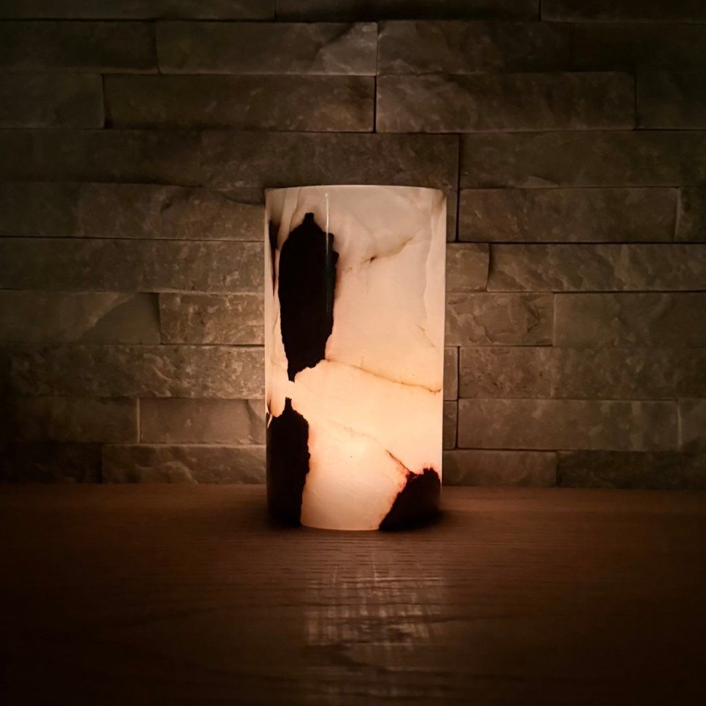 Svícen je vyroben z přírodního aragonitu, známého také jako pákistánský onyx. Tento kámen vyniká pevností, jemným leskem a přirozenou kresbou, která vznikala po tisíce let. Kupujete přesně ten svícen, který vidíte na fotografiích, žádný náhodný výběr, ale konkrétní originální kus.