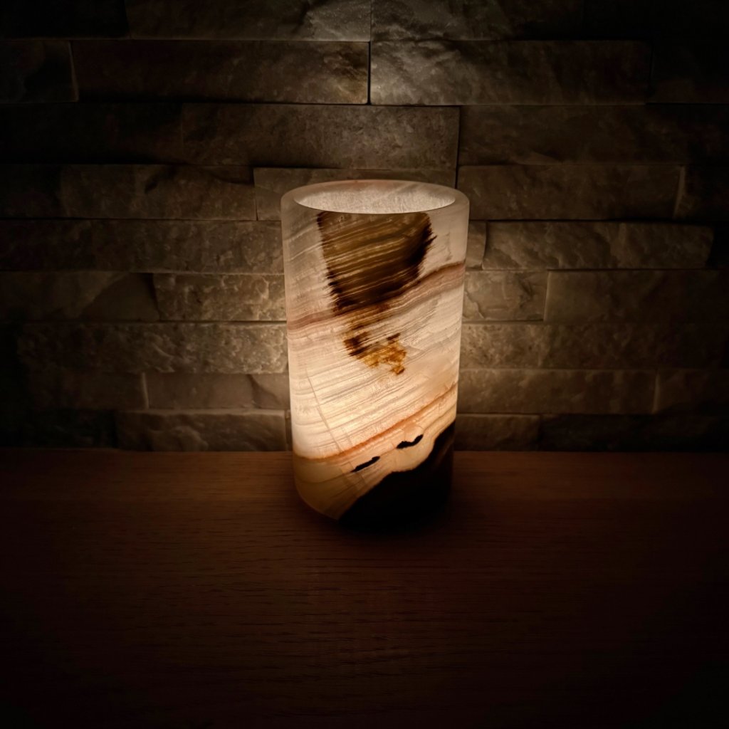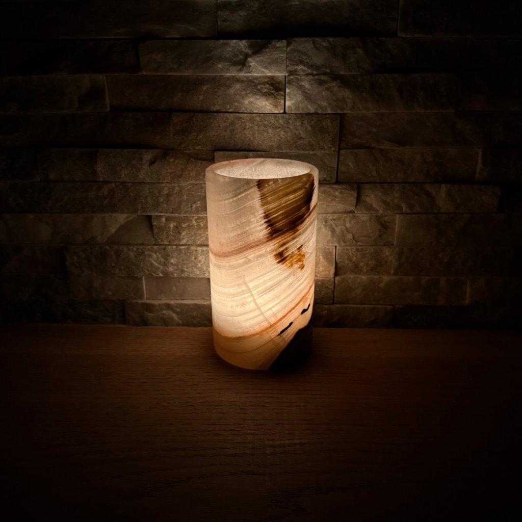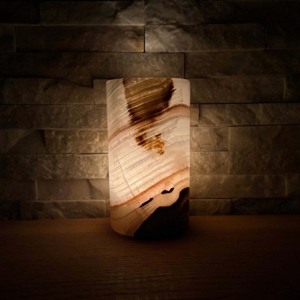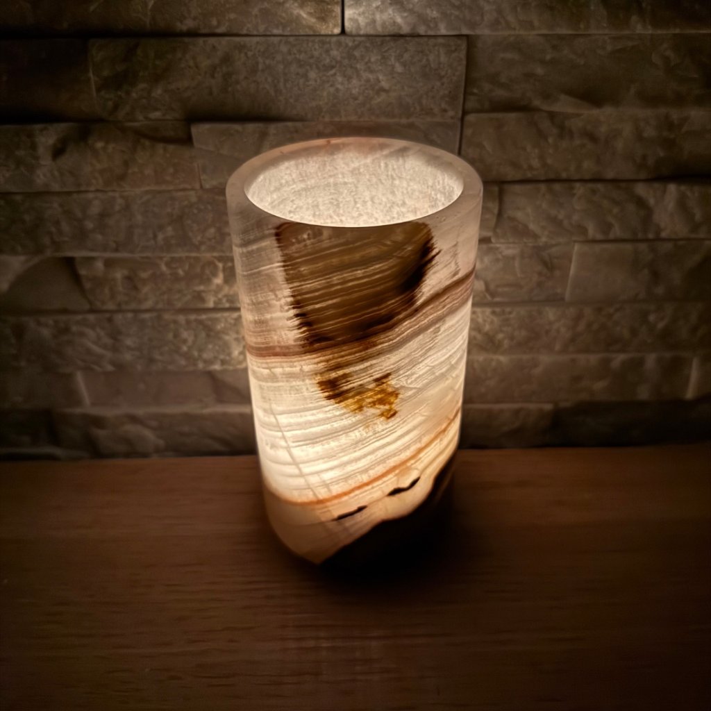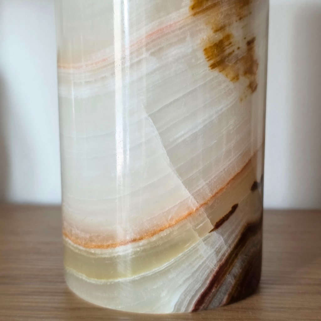 Svícen je vyroben z přírodního aragonitu, známého také jako pákistánský onyx. Tento kámen vyniká pevností, jemným leskem a přirozenou kresbou, která vznikala po tisíce let. Kupujete přesně ten svícen, který vidíte na fotografiích, žádný náhodný výběr, ale konkrétní originální kus.