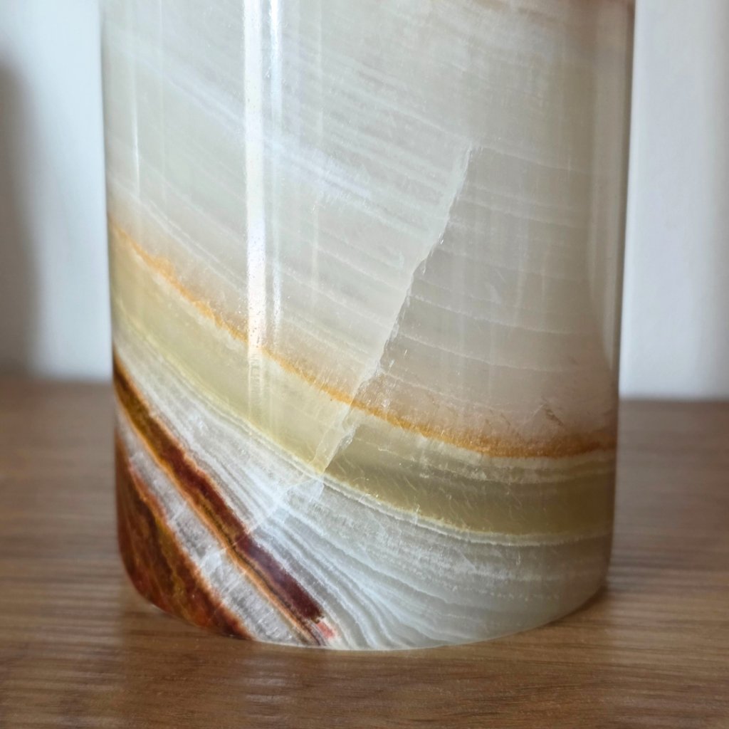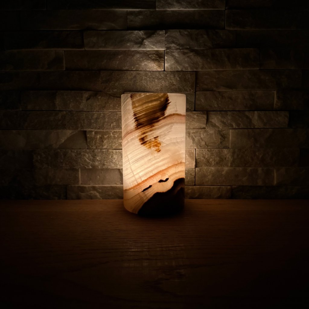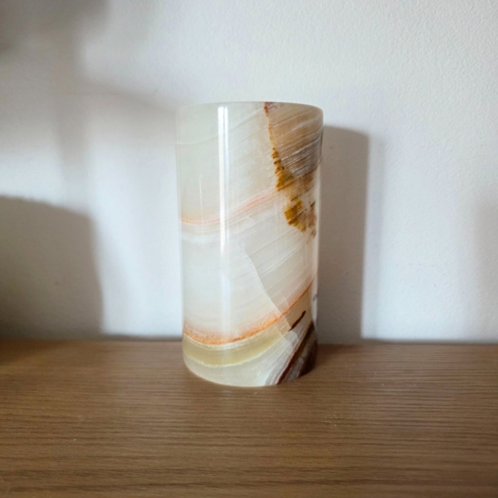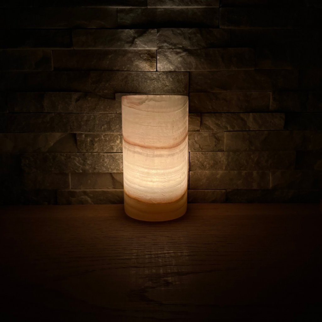 Svícen je vyroben z přírodního aragonitu, známého také jako pákistánský onyx. Tento kámen vyniká pevností, jemným leskem a přirozenou kresbou, která vznikala po tisíce let. Kupujete přesně ten svícen, který vidíte na fotografiích, žádný náhodný výběr, ale konkrétní originální kus.