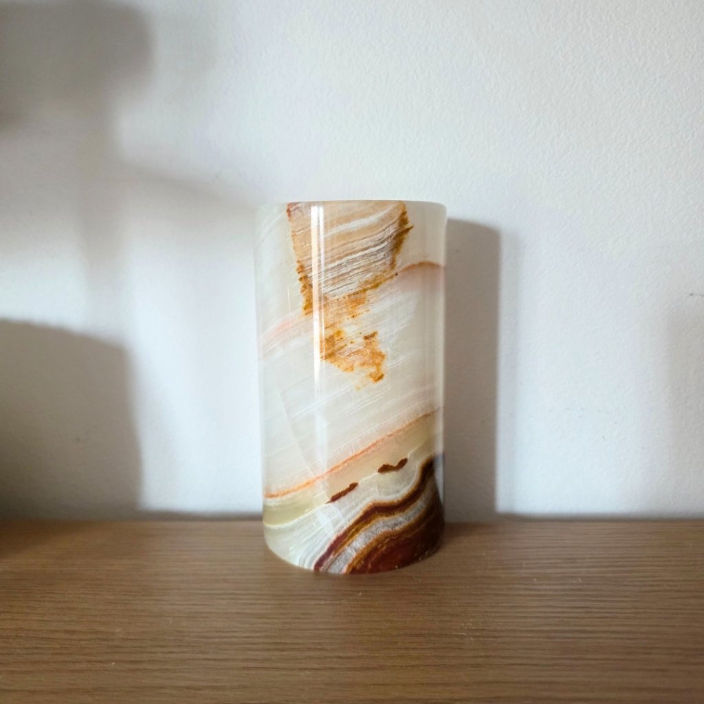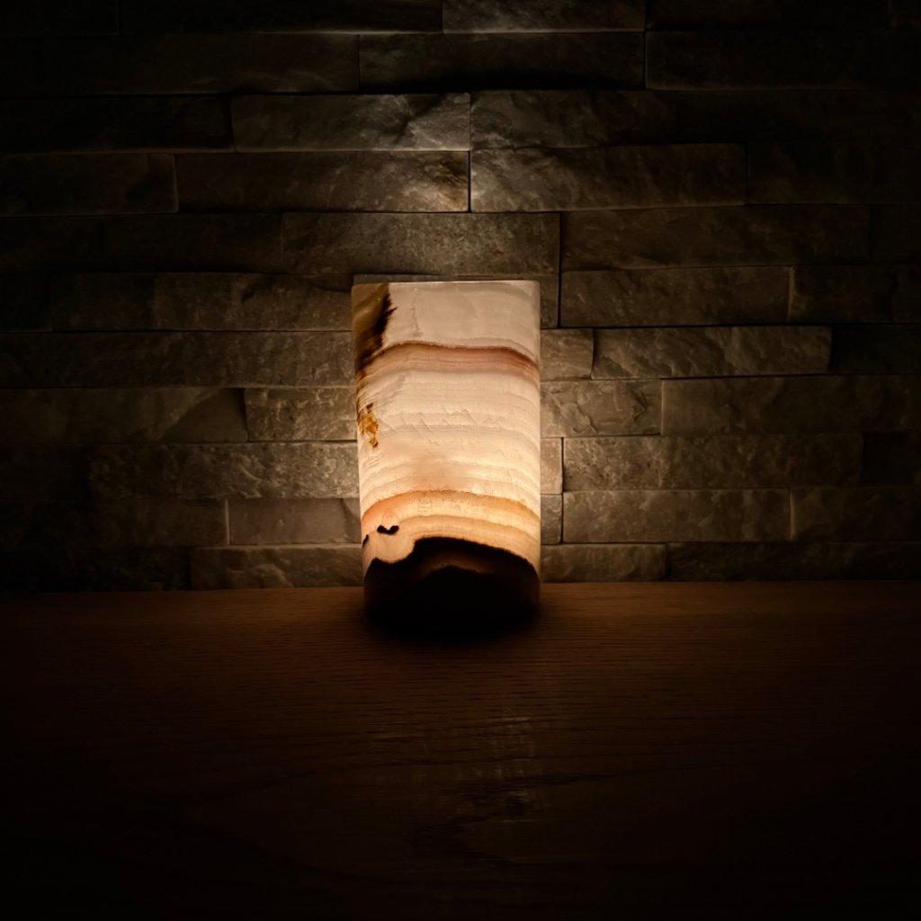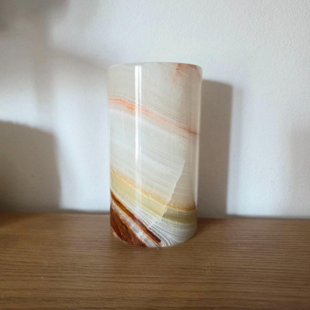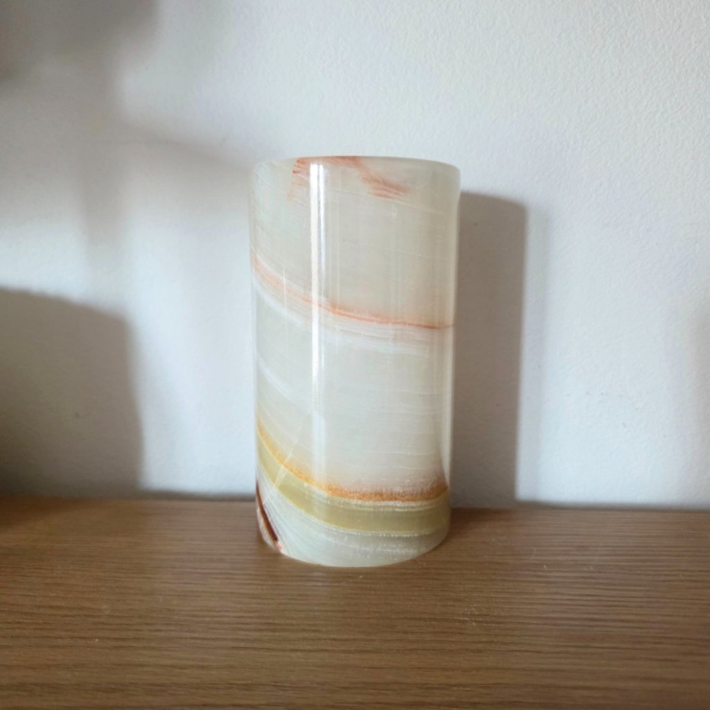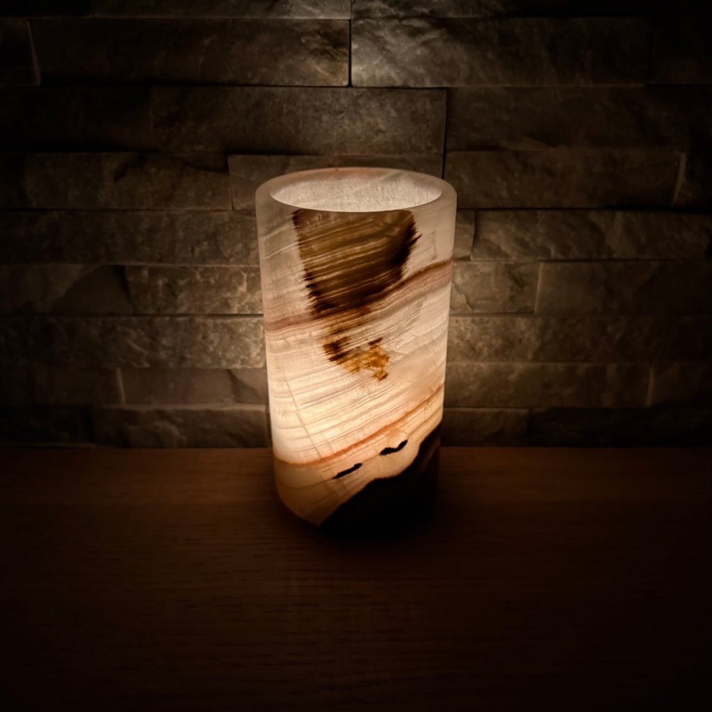 Svícen je vyroben z přírodního aragonitu, známého také jako pákistánský onyx. Tento kámen vyniká pevností, jemným leskem a přirozenou kresbou, která vznikala po tisíce let. Kupujete přesně ten svícen, který vidíte na fotografiích, žádný náhodný výběr, ale konkrétní originální kus.