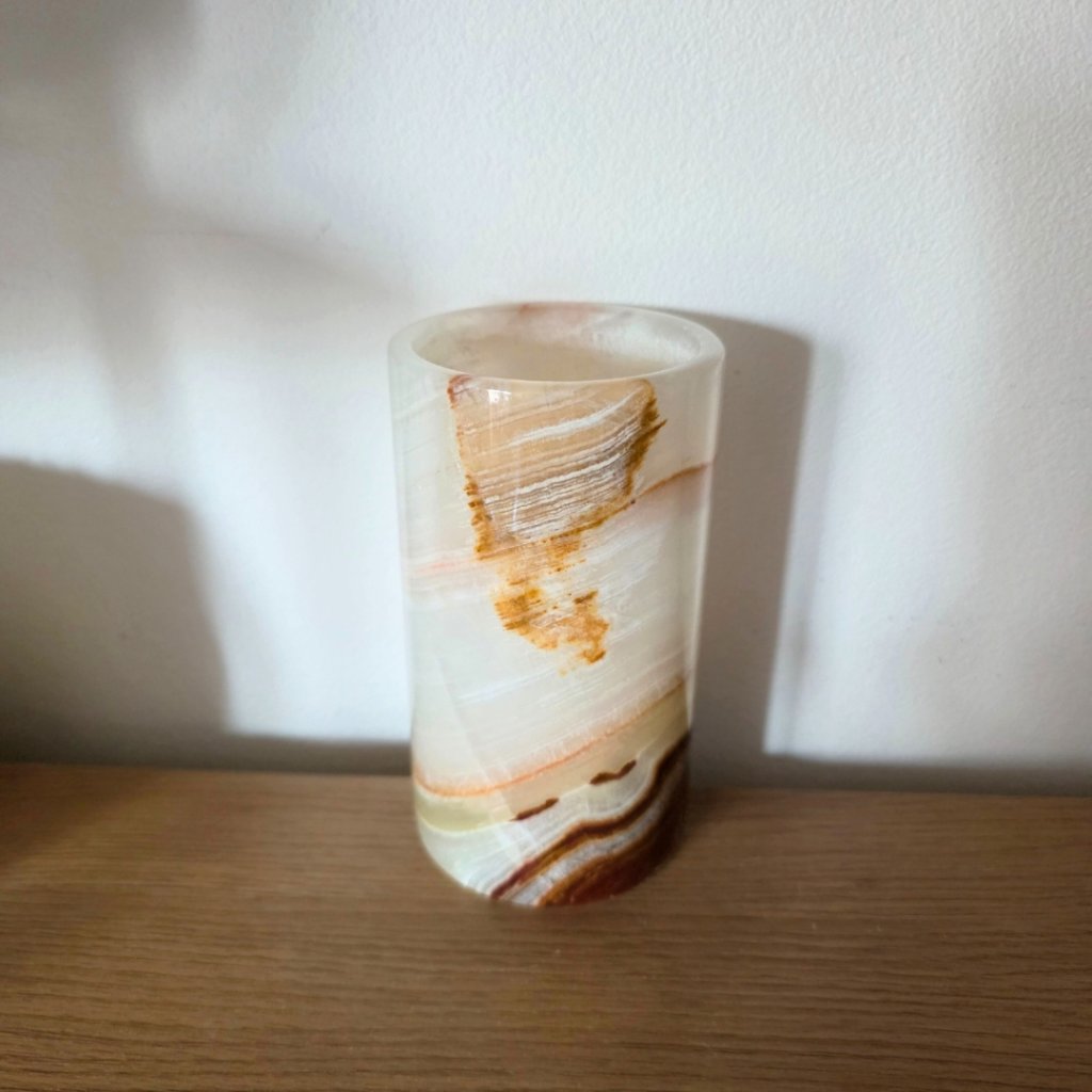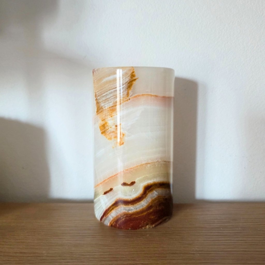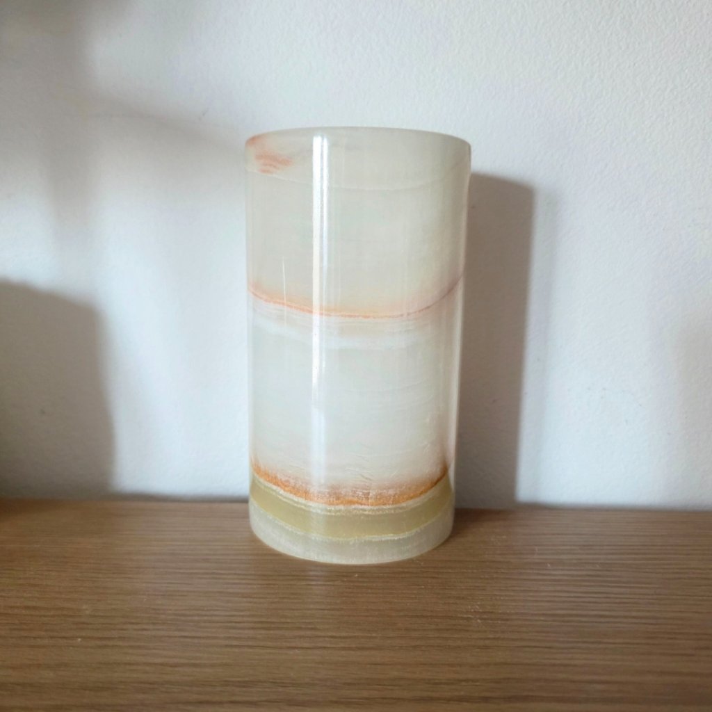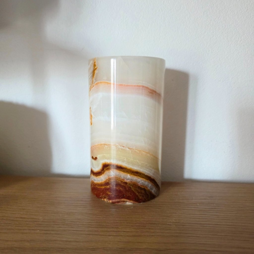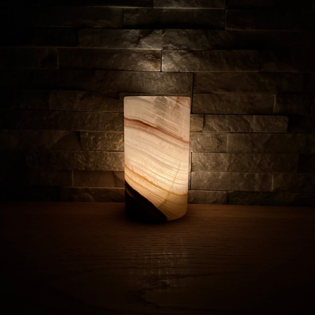 Svícen je vyroben z přírodního aragonitu, známého také jako pákistánský onyx. Tento kámen vyniká pevností, jemným leskem a přirozenou kresbou, která vznikala po tisíce let. Kupujete přesně ten svícen, který vidíte na fotografiích, žádný náhodný výběr, ale konkrétní originální kus.