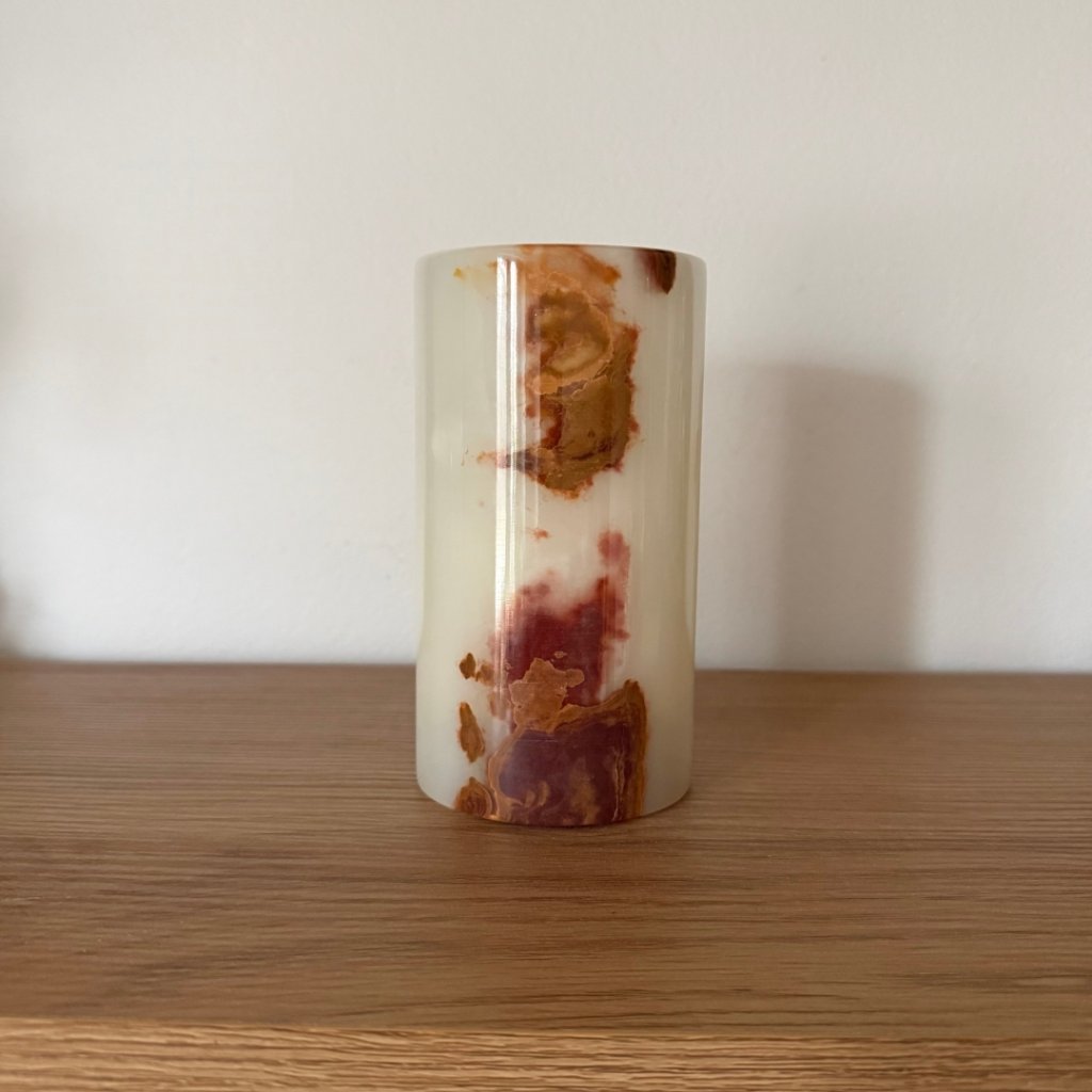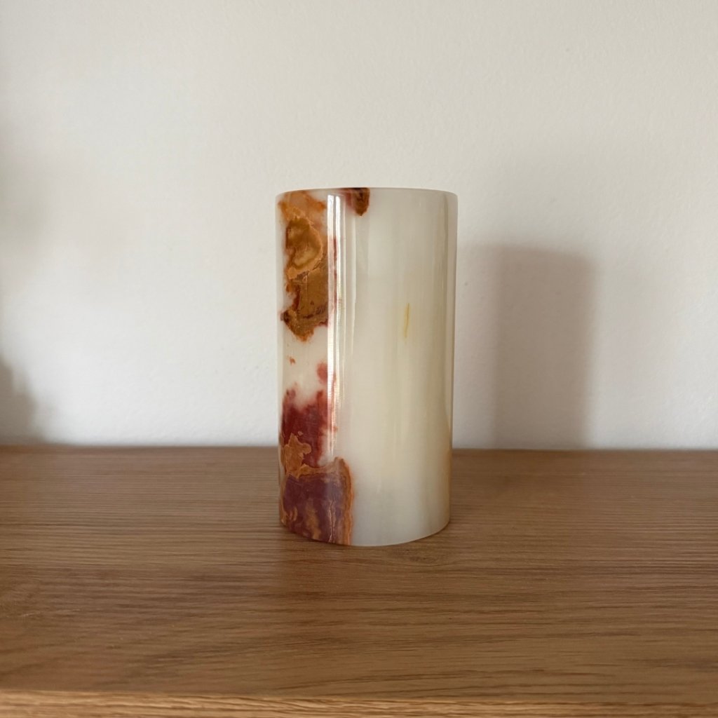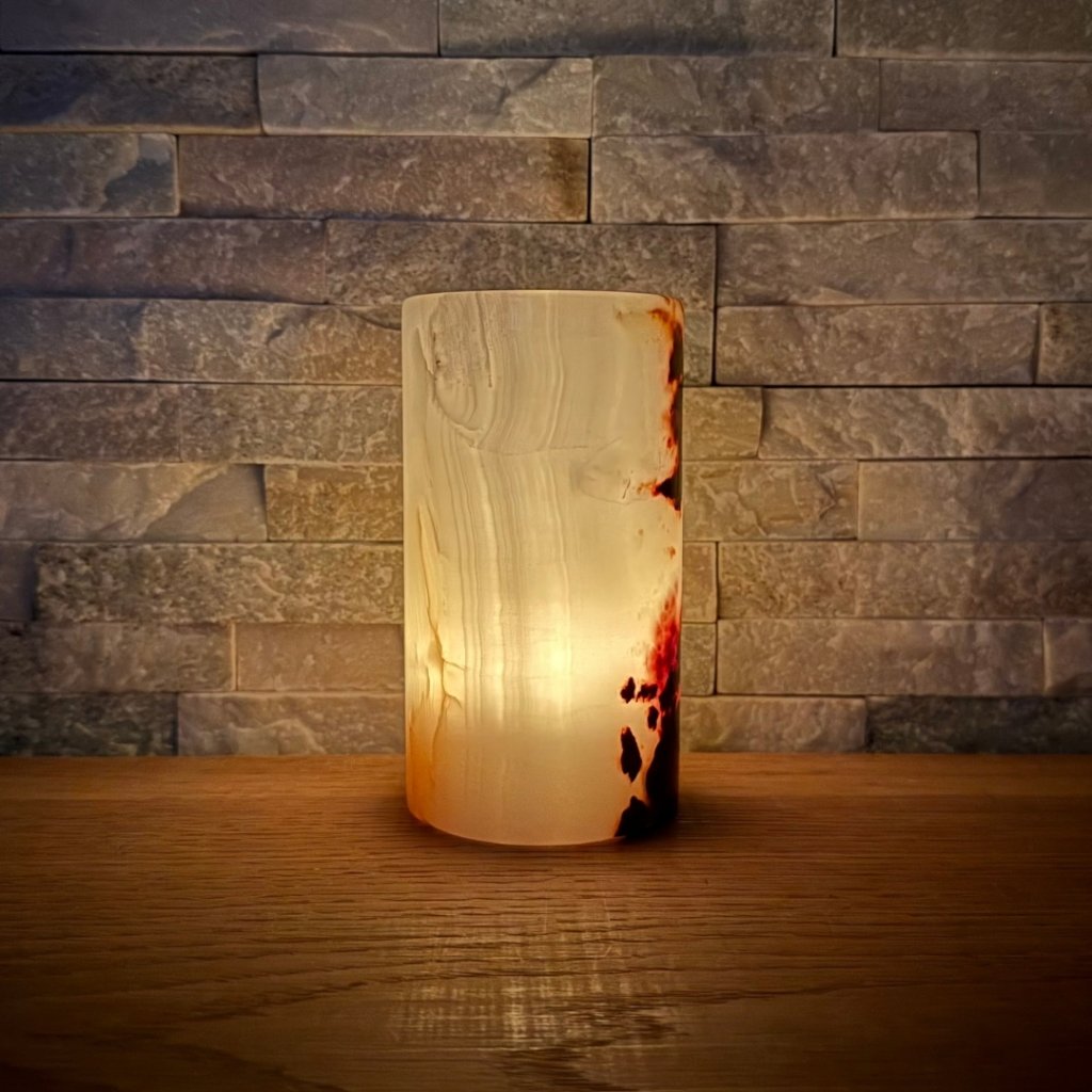 Svícen je vyroben z přírodního aragonitu, známého také jako pákistánský onyx. Tento kámen vyniká pevností, jemným leskem a přirozenou kresbou, která vznikala po tisíce let. Kupujete přesně ten svícen, který vidíte na fotografiích, žádný náhodný výběr, ale konkrétní originální kus.