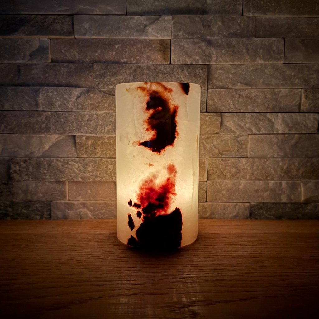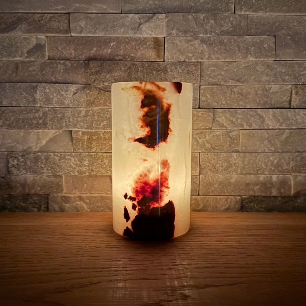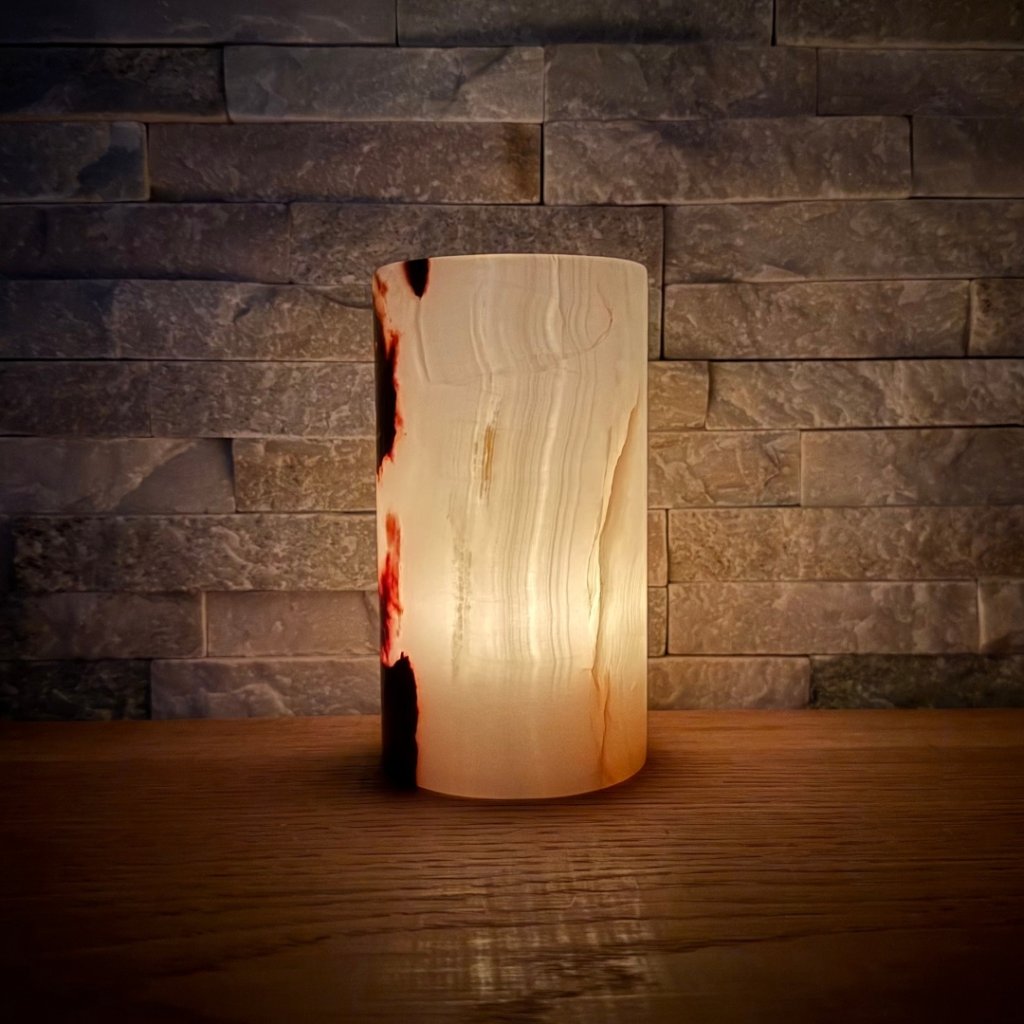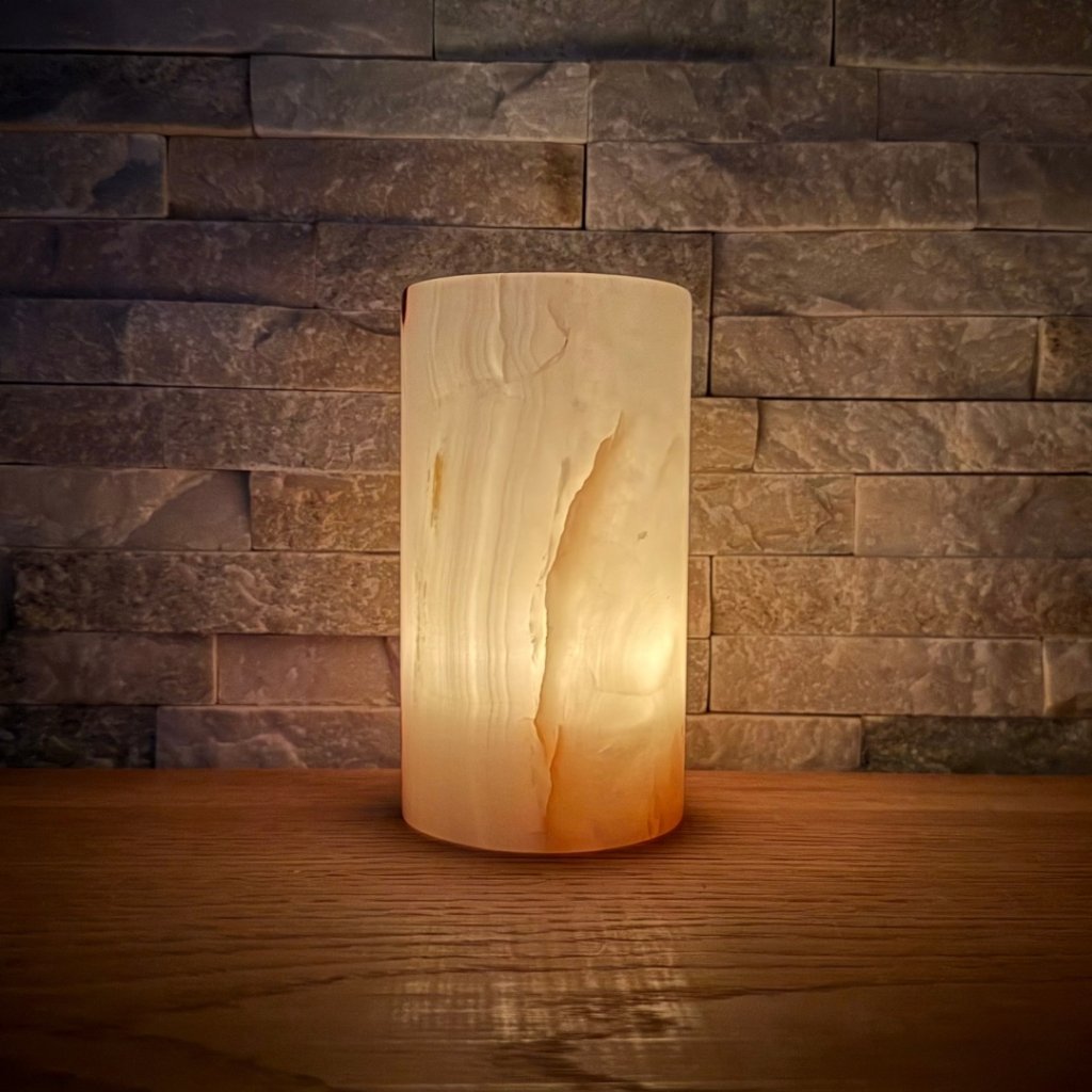 Svícen je vyroben z přírodního aragonitu, známého také jako pákistánský onyx. Tento kámen vyniká pevností, jemným leskem a přirozenou kresbou, která vznikala po tisíce let. Kupujete přesně ten svícen, který vidíte na fotografiích, žádný náhodný výběr, ale konkrétní originální kus.