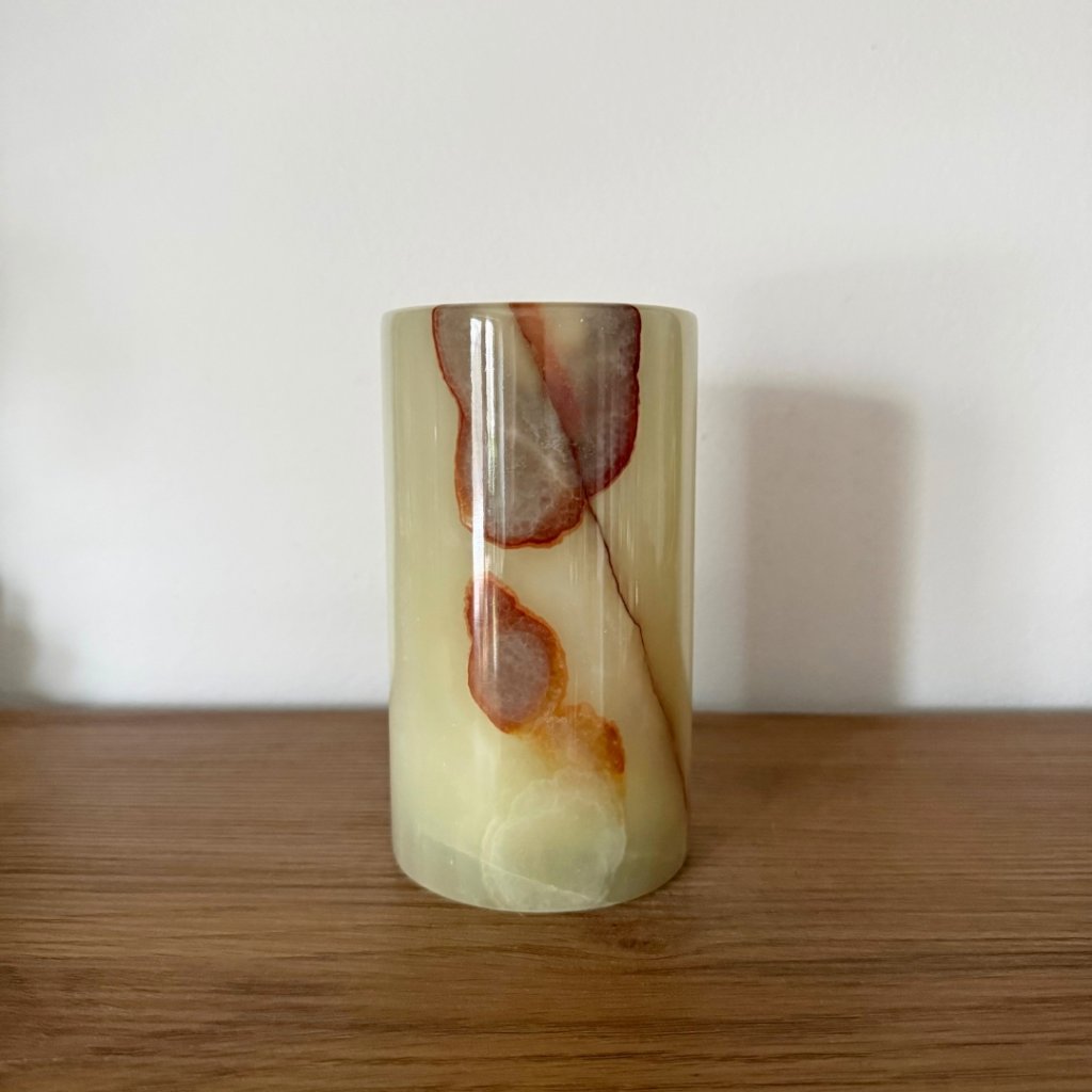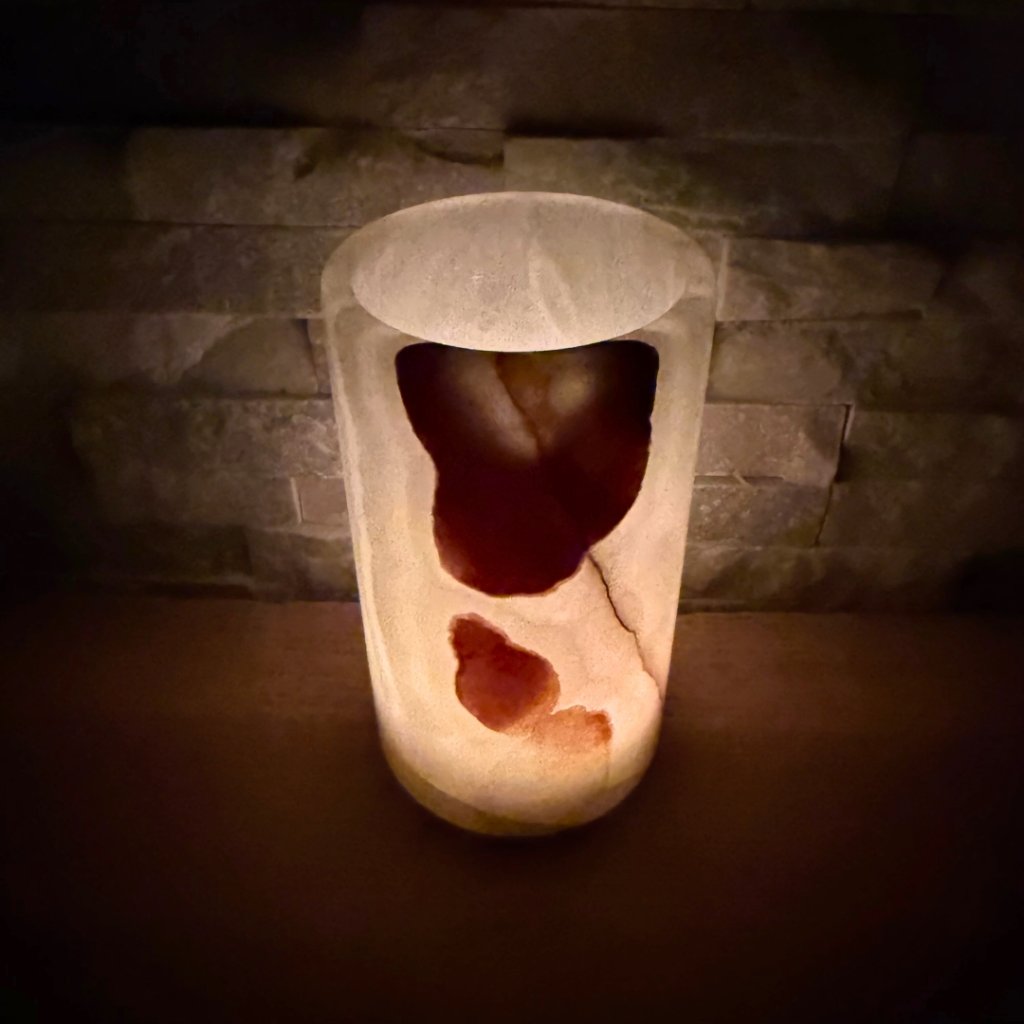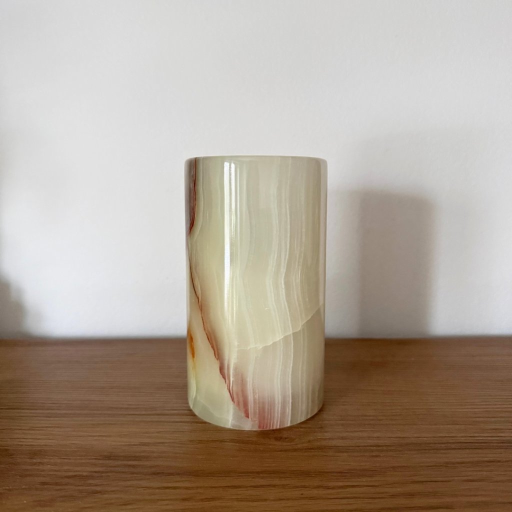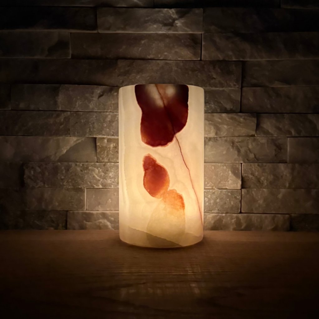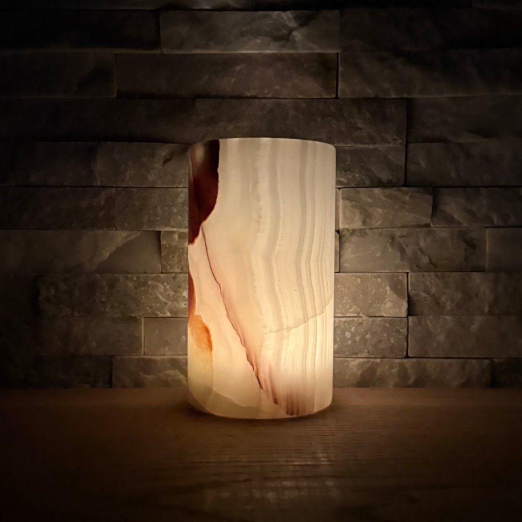 Svícen je vyroben z přírodního aragonitu, známého také jako pákistánský onyx. Tento kámen vyniká pevností, jemným leskem a přirozenou kresbou, která vznikala po tisíce let. Kupujete přesně ten svícen, který vidíte na fotografiích, žádný náhodný výběr, ale konkrétní originální kus.