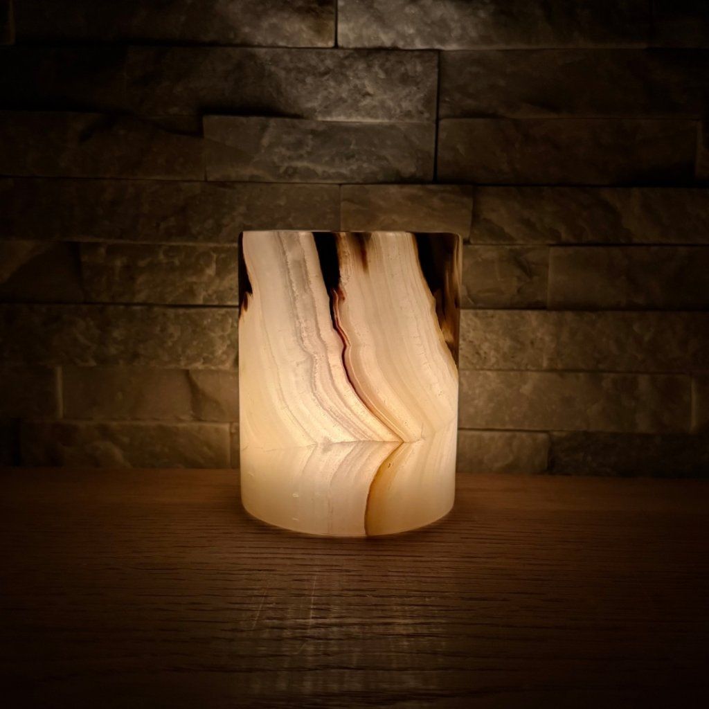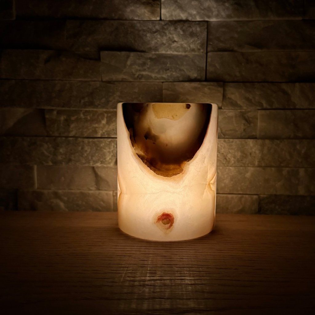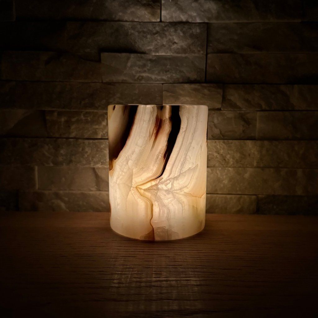 Svícen je vyroben z přírodního aragonitu, známého také jako pákistánský onyx. Tento kámen vyniká pevností, jemným leskem a přirozenou kresbou, která vznikala po tisíce let. Kupujete přesně ten svícen, který vidíte na fotografiích, žádný náhodný výběr, ale konkrétní originální kus.