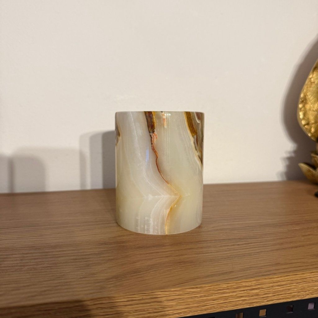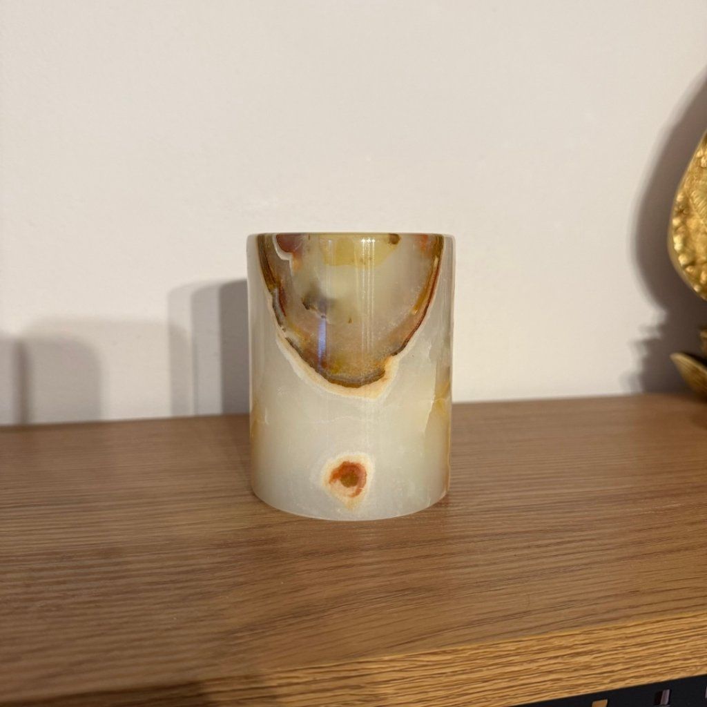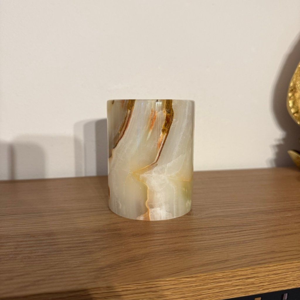 Svícen je vyroben z přírodního aragonitu, známého také jako pákistánský onyx. Tento kámen vyniká pevností, jemným leskem a přirozenou kresbou, která vznikala po tisíce let. Kupujete přesně ten svícen, který vidíte na fotografiích, žádný náhodný výběr, ale konkrétní originální kus.