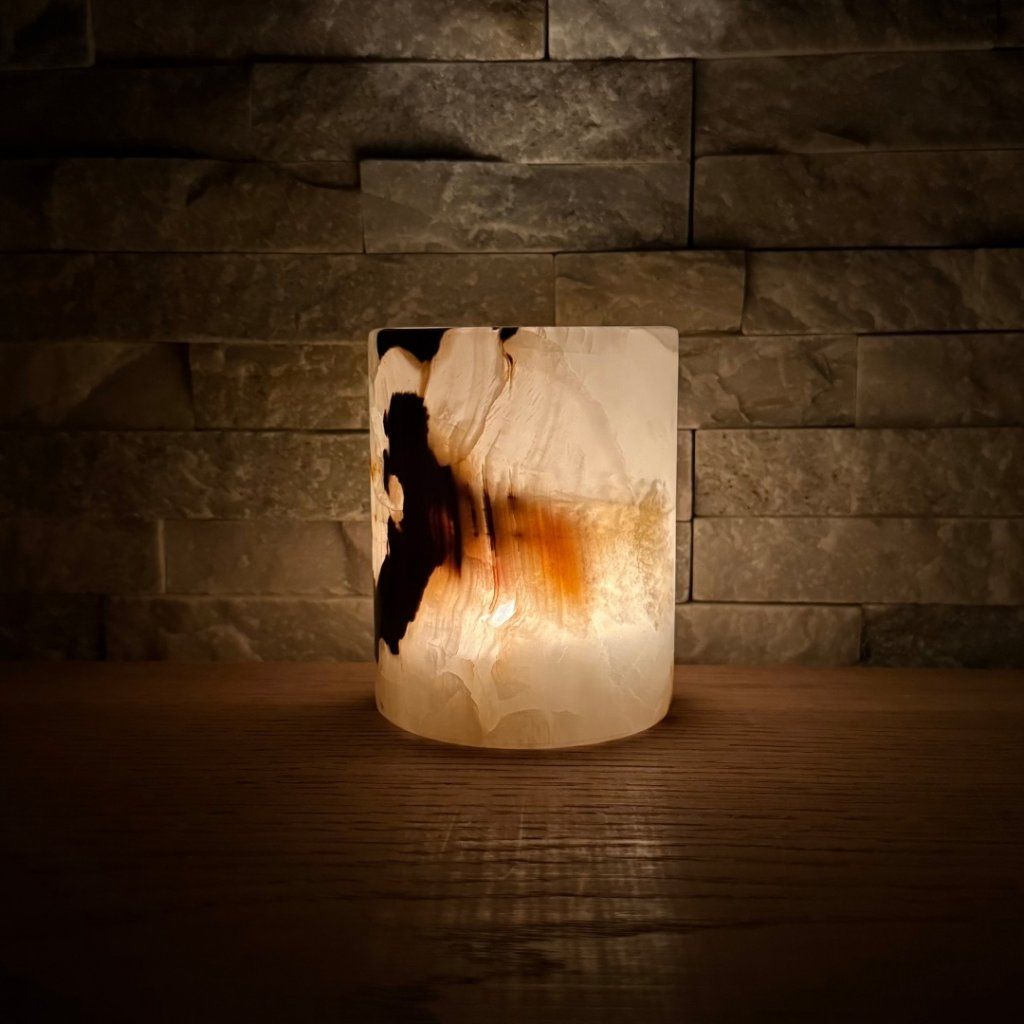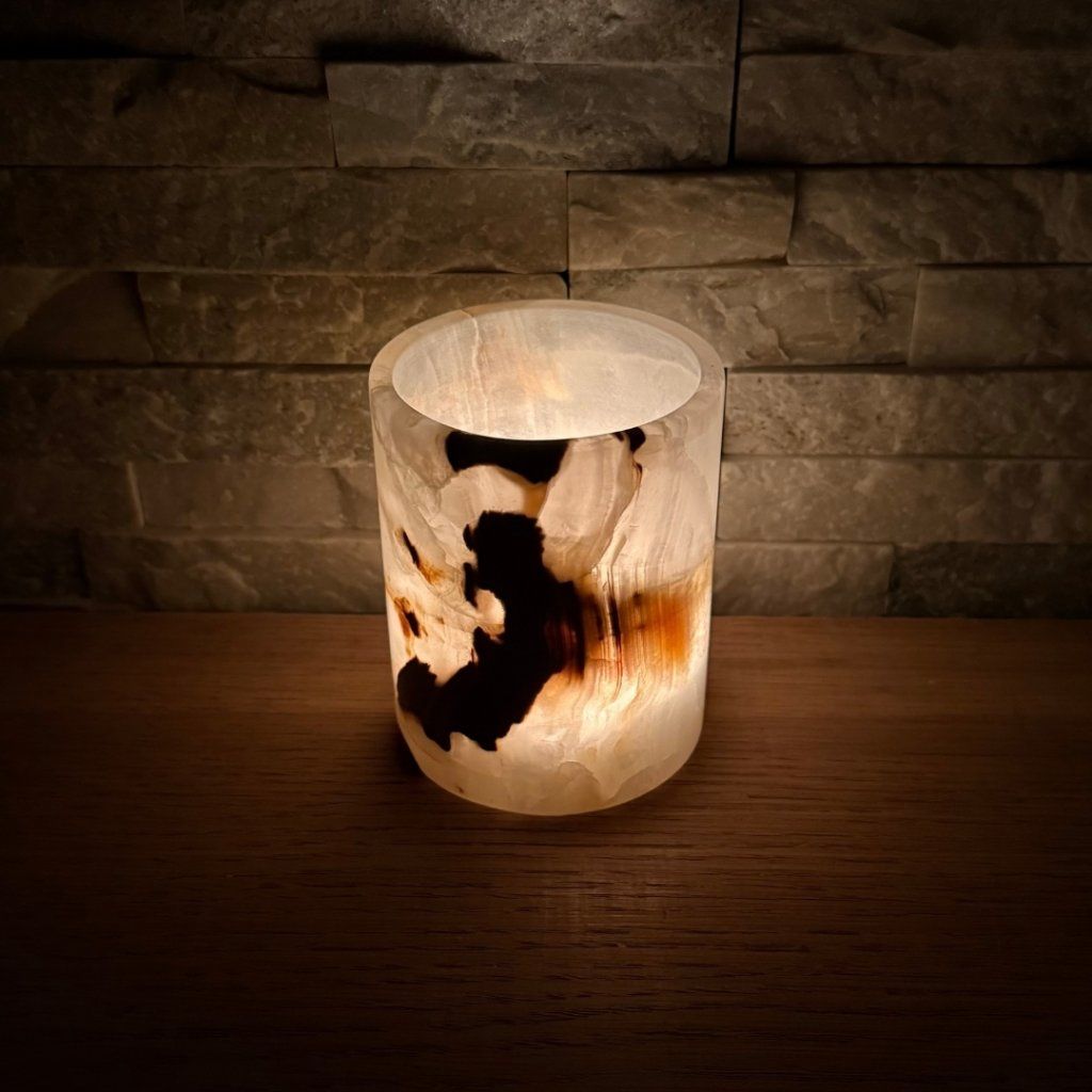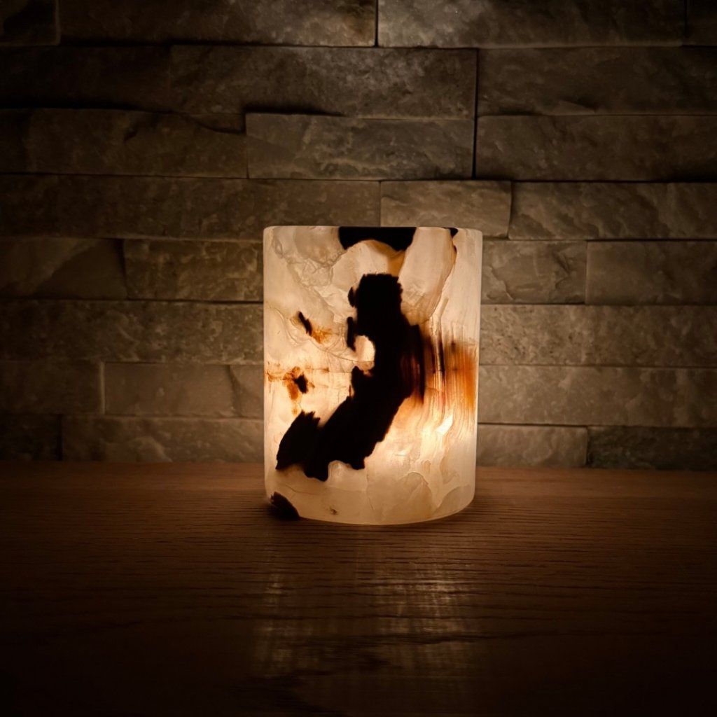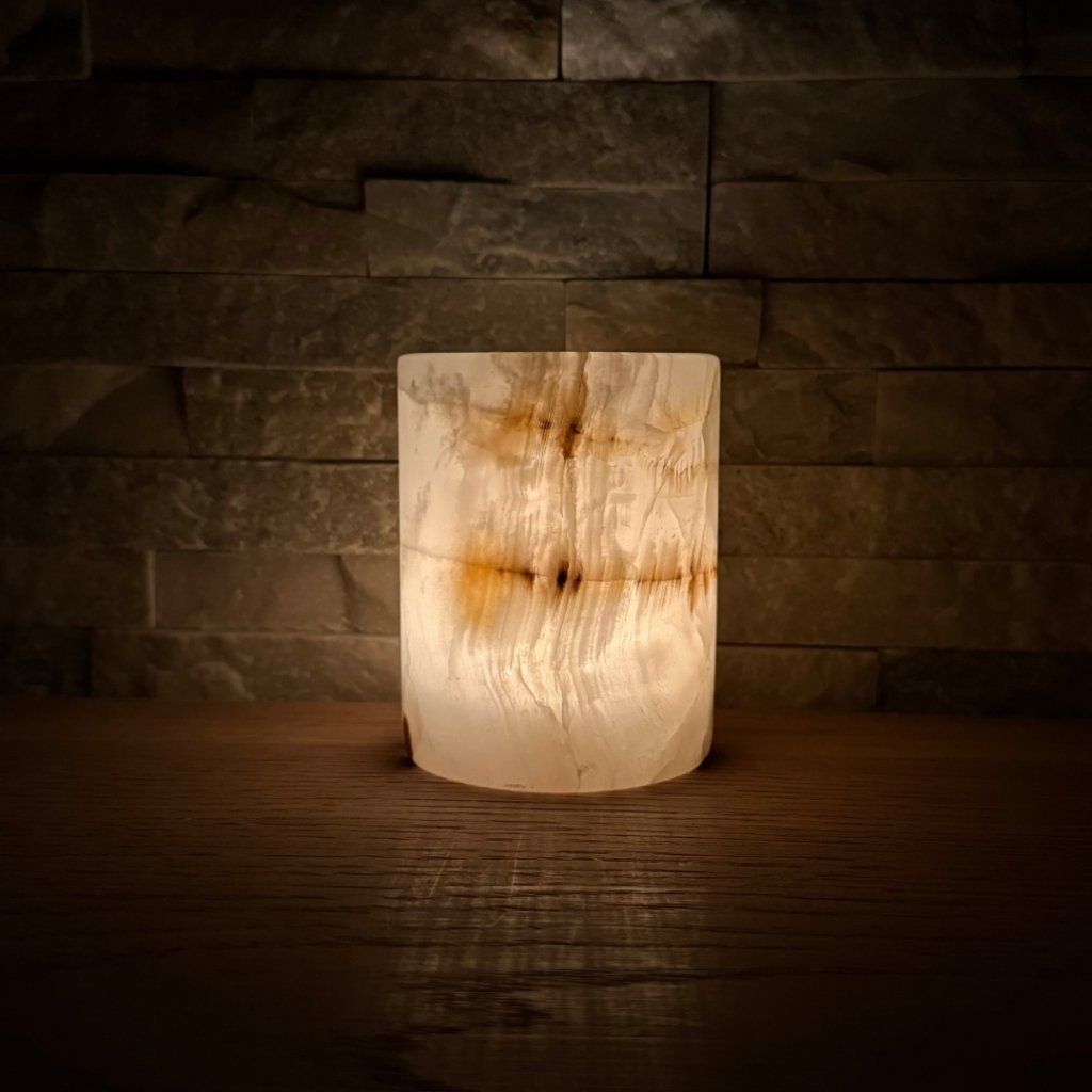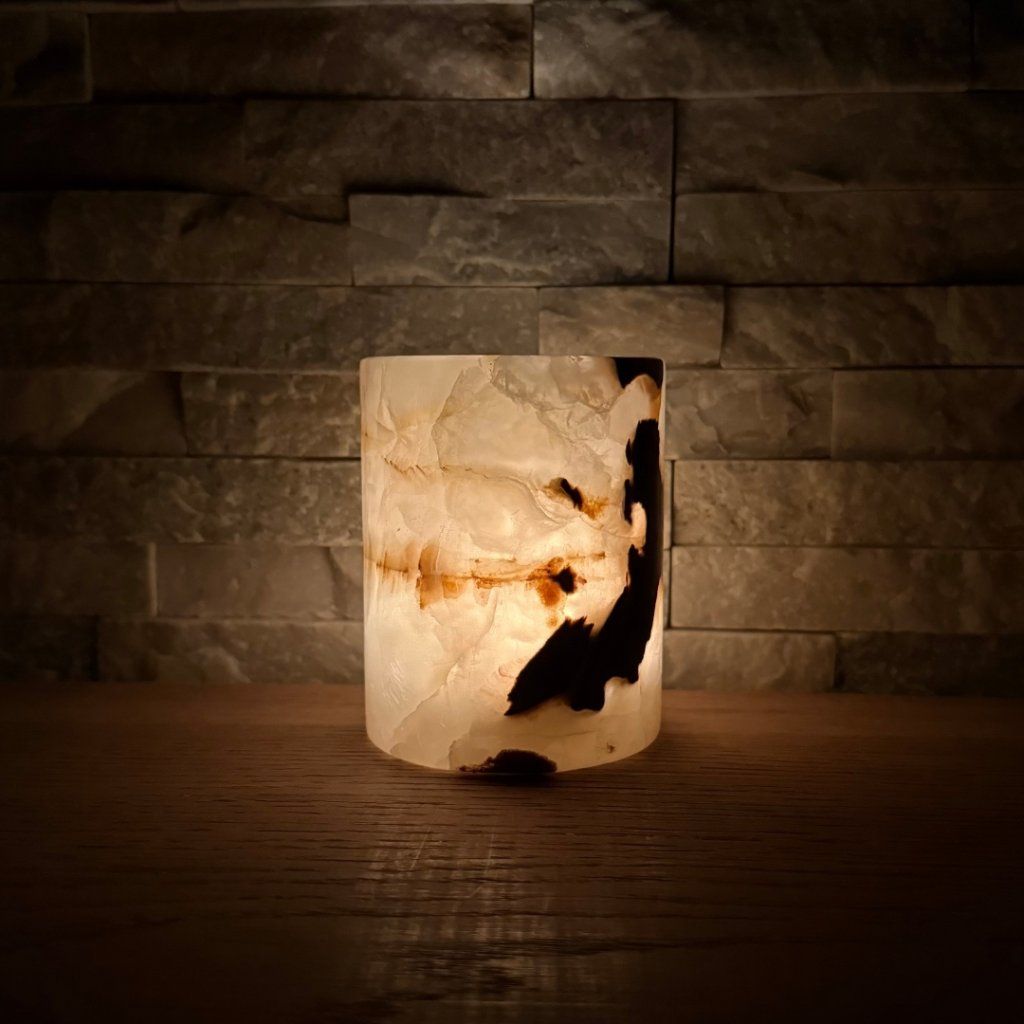 Svícen je vyroben z přírodního aragonitu, známého také jako pákistánský onyx. Tento kámen vyniká pevností, jemným leskem a přirozenou kresbou, která vznikala po tisíce let. Kupujete přesně ten svícen, který vidíte na fotografiích, žádný náhodný výběr, ale konkrétní originální kus.