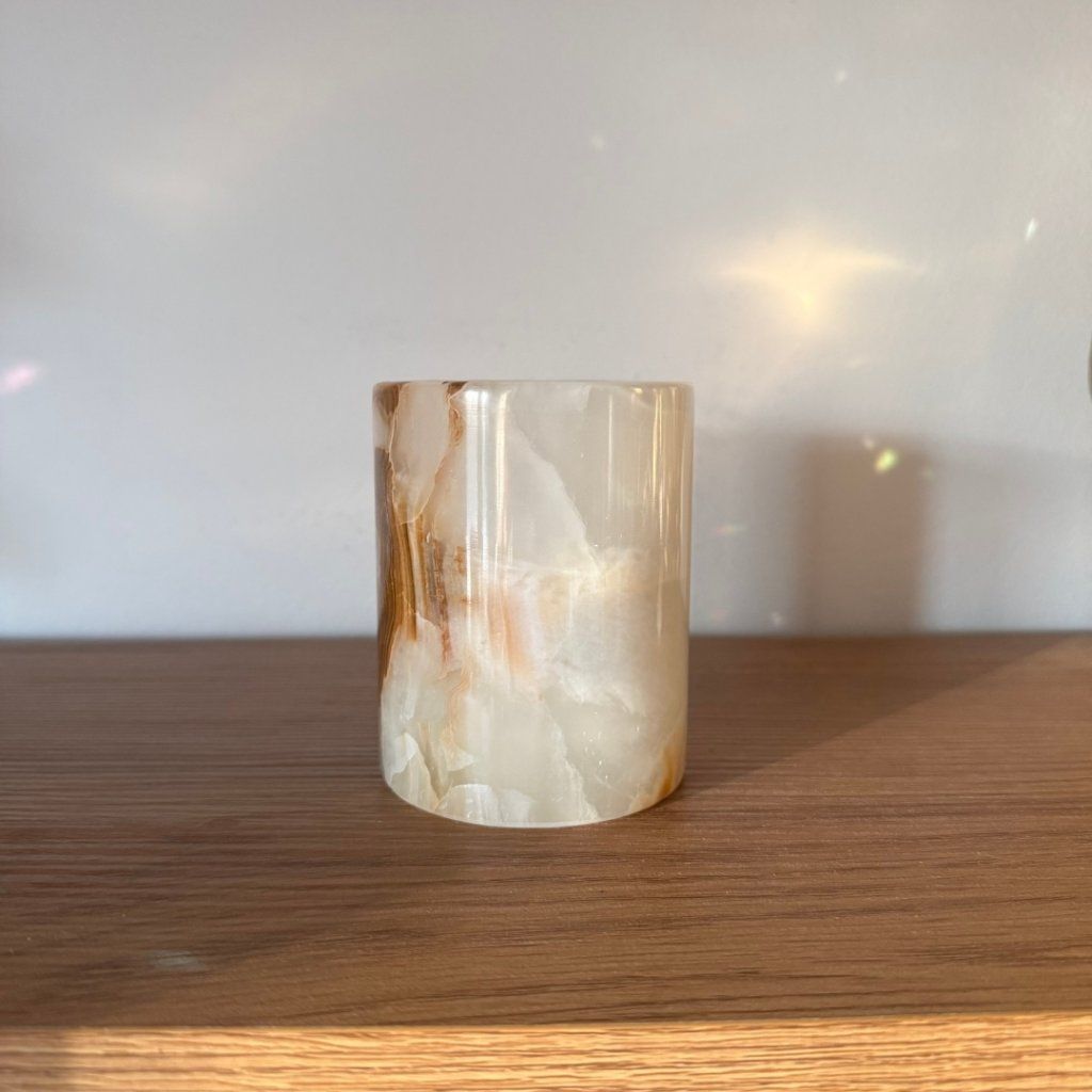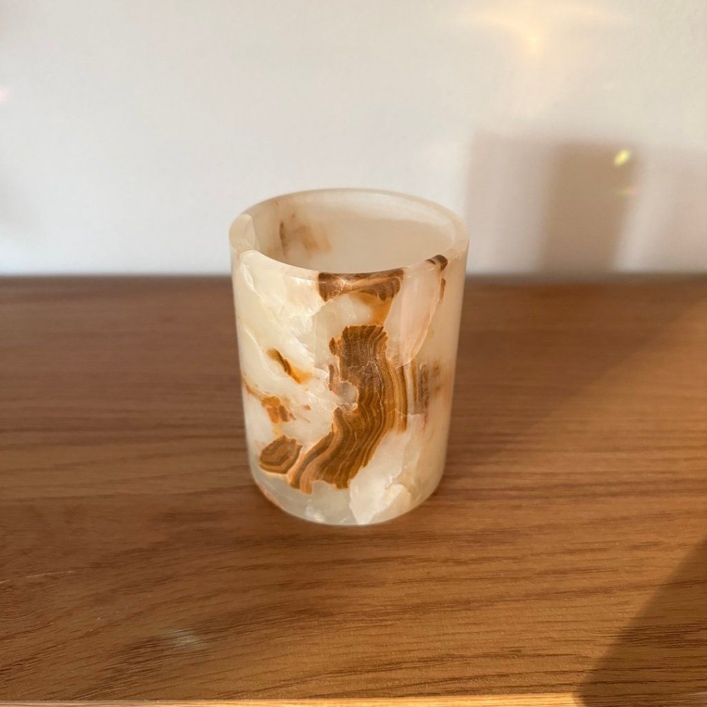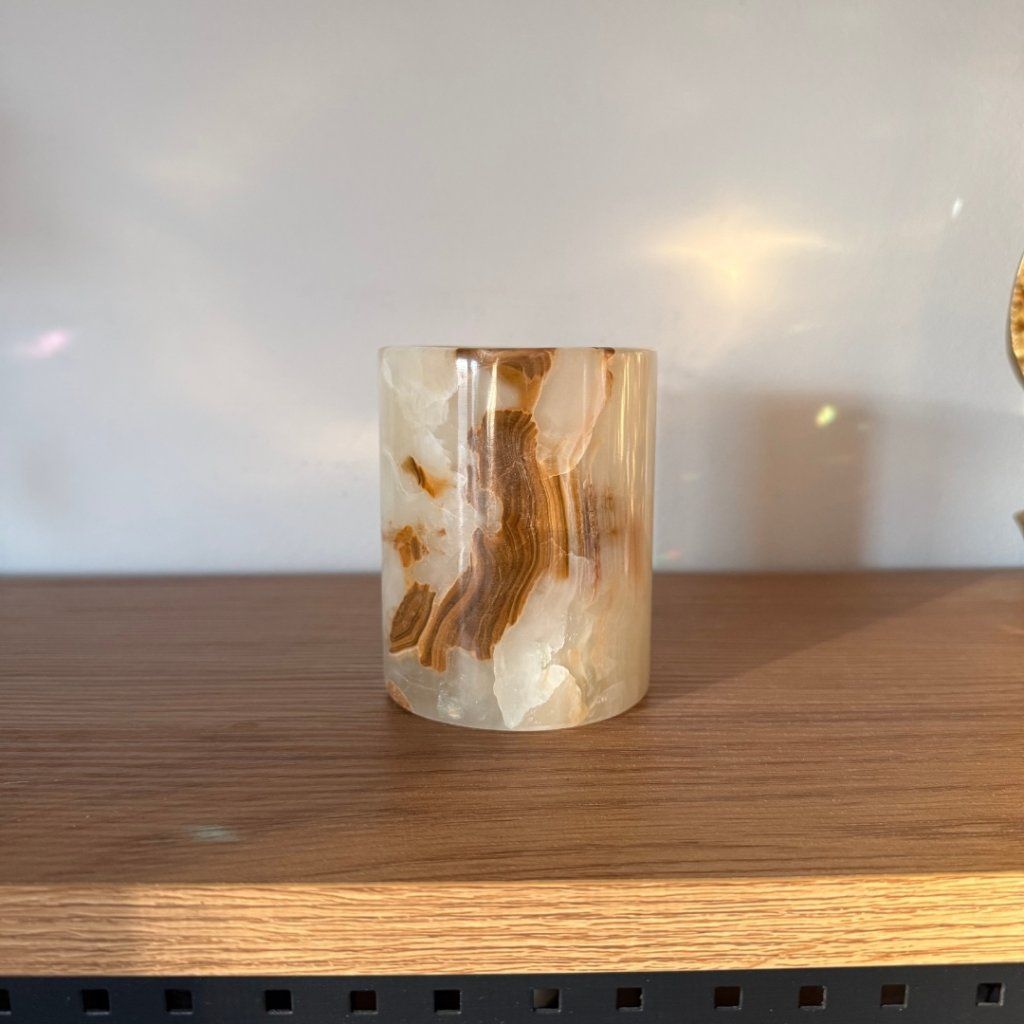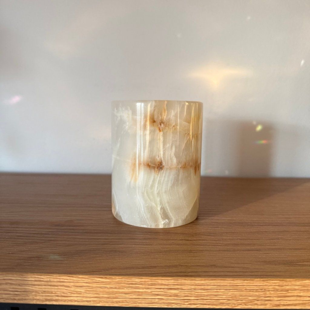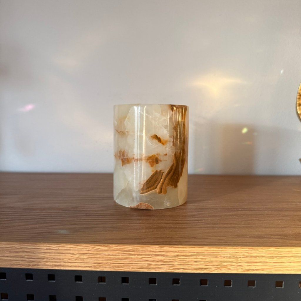 Svícen je vyroben z přírodního aragonitu, známého také jako pákistánský onyx. Tento kámen vyniká pevností, jemným leskem a přirozenou kresbou, která vznikala po tisíce let. Kupujete přesně ten svícen, který vidíte na fotografiích, žádný náhodný výběr, ale konkrétní originální kus.