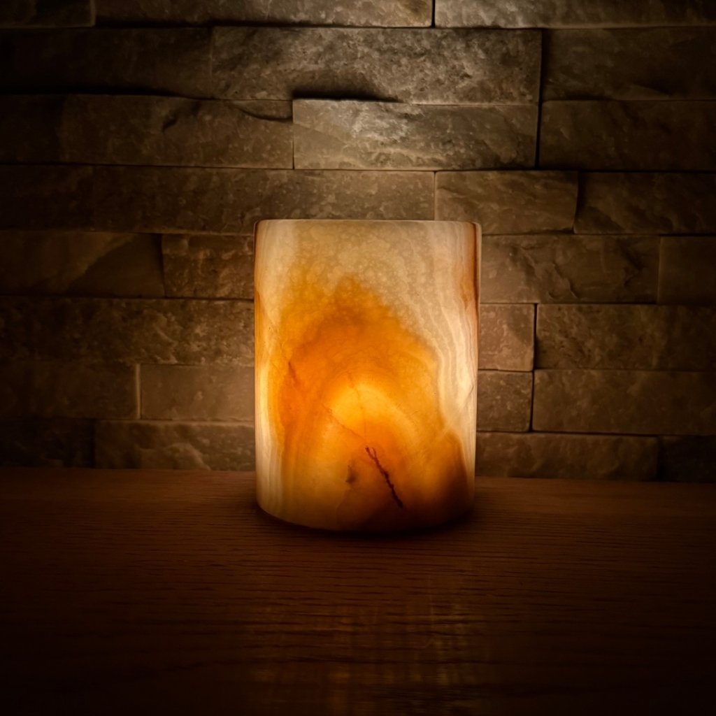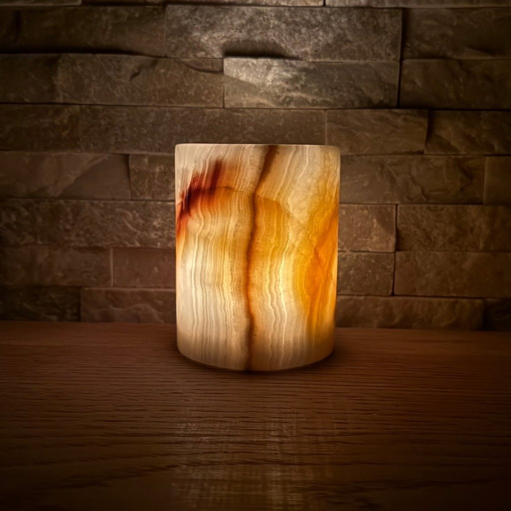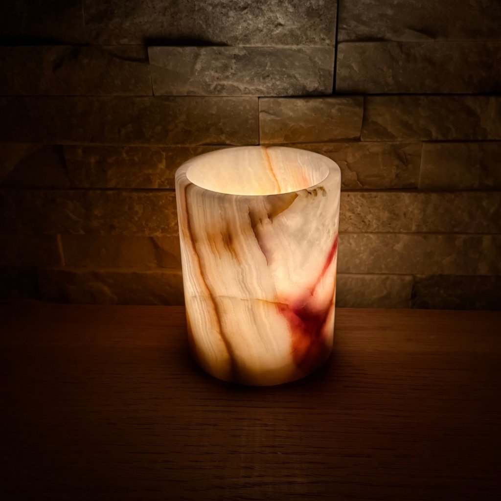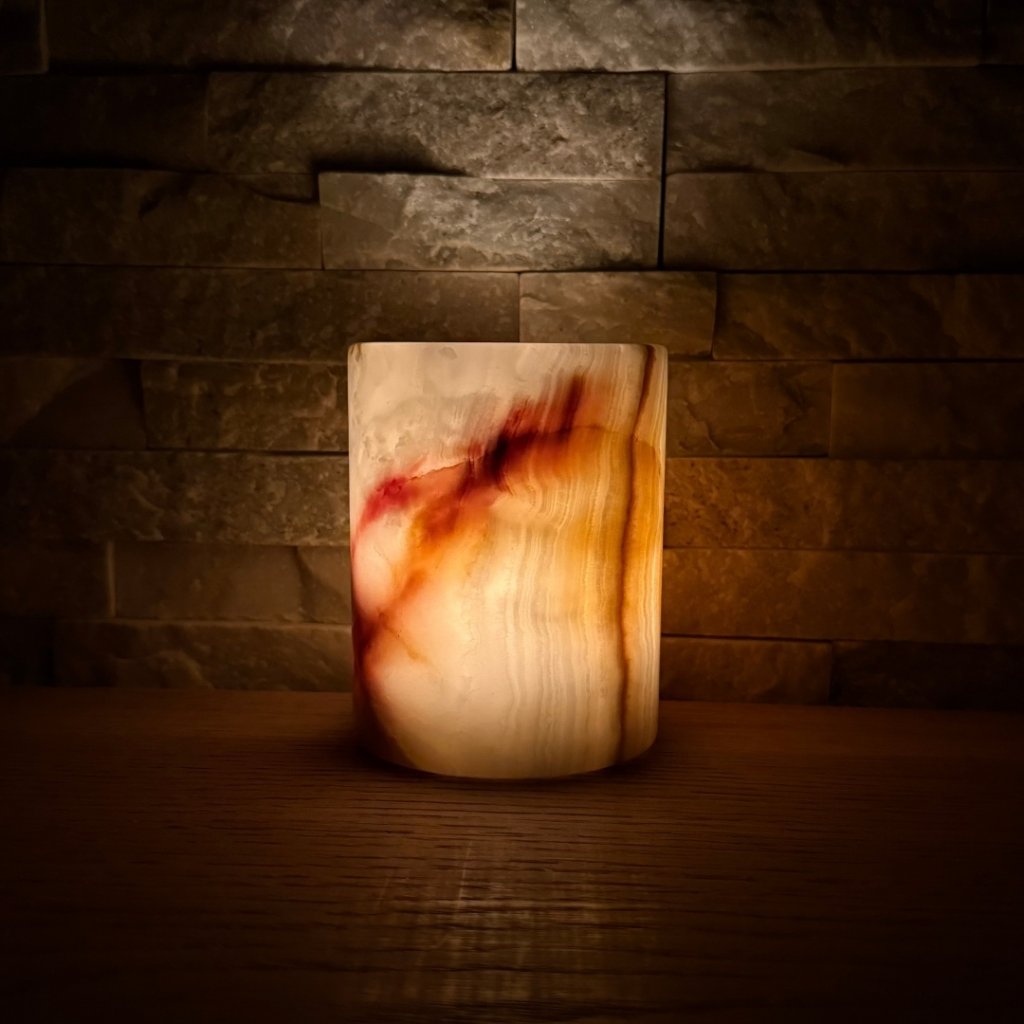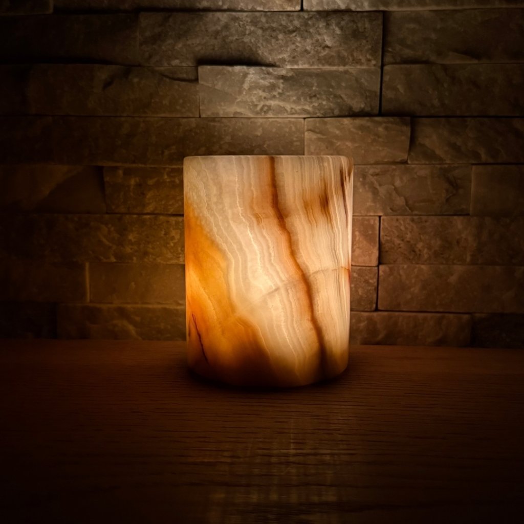 Svícen je vyroben z přírodního aragonitu, známého také jako pákistánský onyx. Tento kámen vyniká pevností, jemným leskem a přirozenou kresbou, která vznikala po tisíce let. Kupujete přesně ten svícen, který vidíte na fotografiích, žádný náhodný výběr, ale konkrétní originální kus.