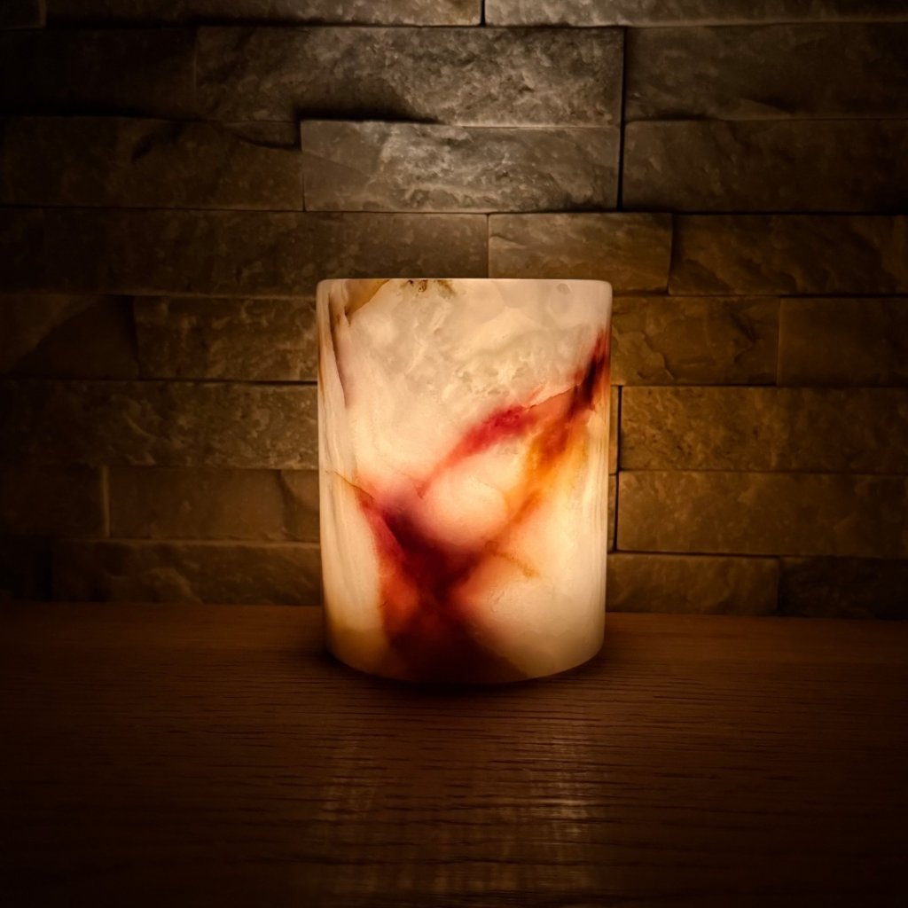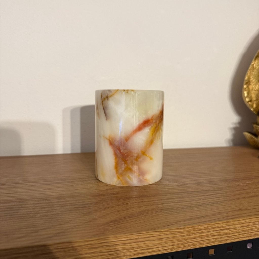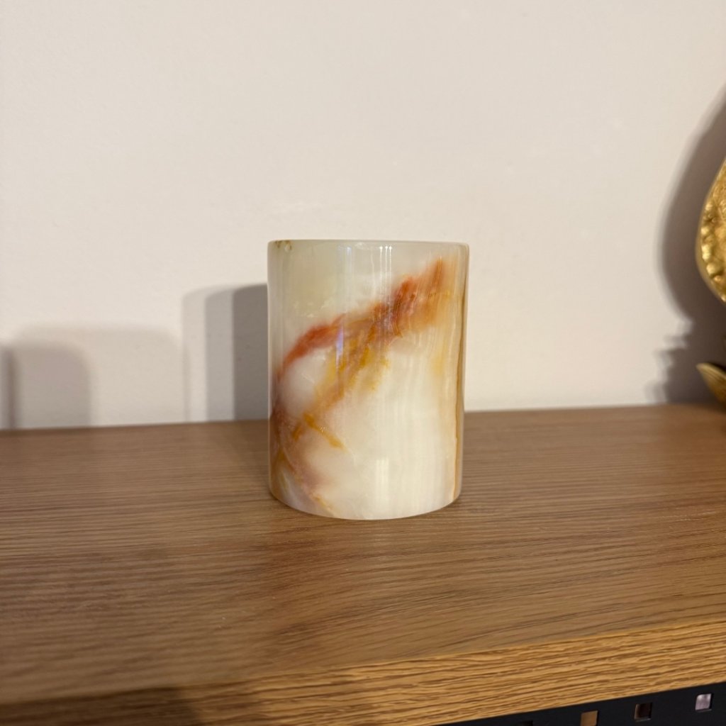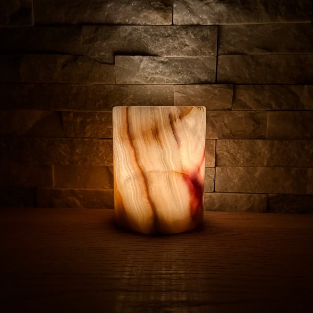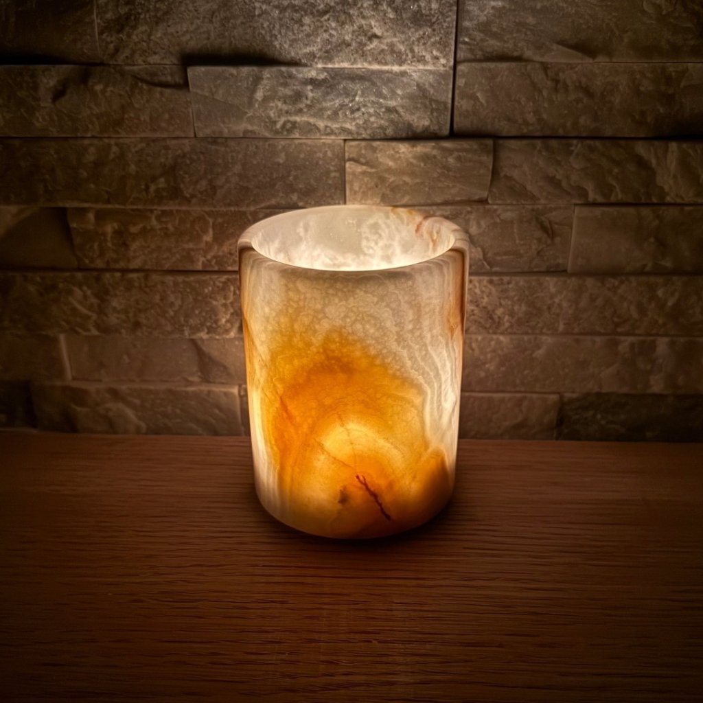 Svícen je vyroben z přírodního aragonitu, známého také jako pákistánský onyx. Tento kámen vyniká pevností, jemným leskem a přirozenou kresbou, která vznikala po tisíce let. Kupujete přesně ten svícen, který vidíte na fotografiích, žádný náhodný výběr, ale konkrétní originální kus.