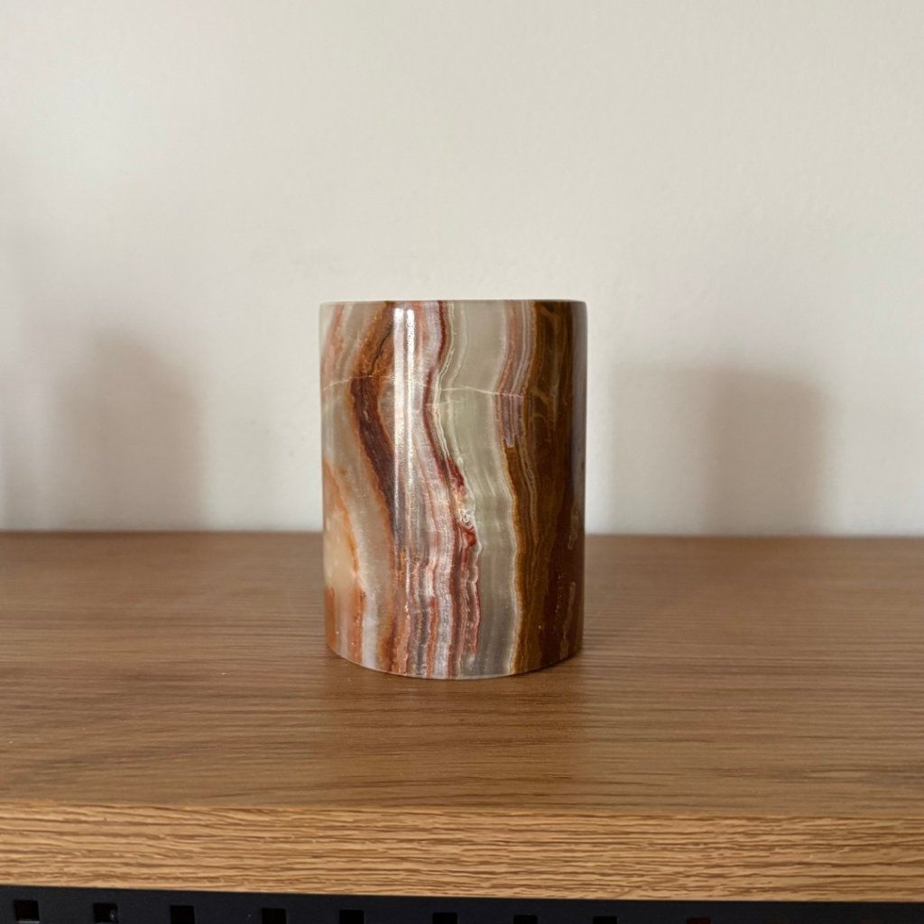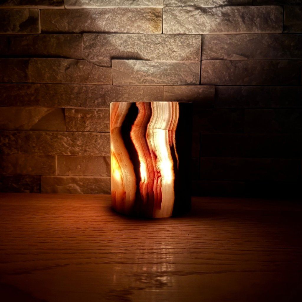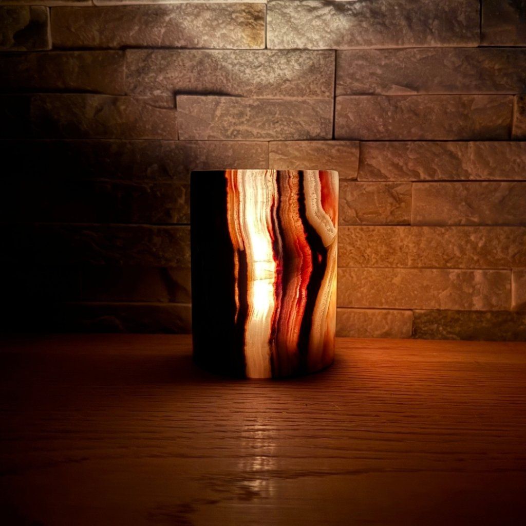Svícen je vyroben z přírodního aragonitu, známého také jako pákistánský onyx. Tento kámen vyniká pevností, jemným leskem a přirozenou kresbou, která vznikala po tisíce let. Kupujete přesně ten svícen, který vidíte na fotografiích, žádný náhodný výběr, ale konkrétní originální kus.