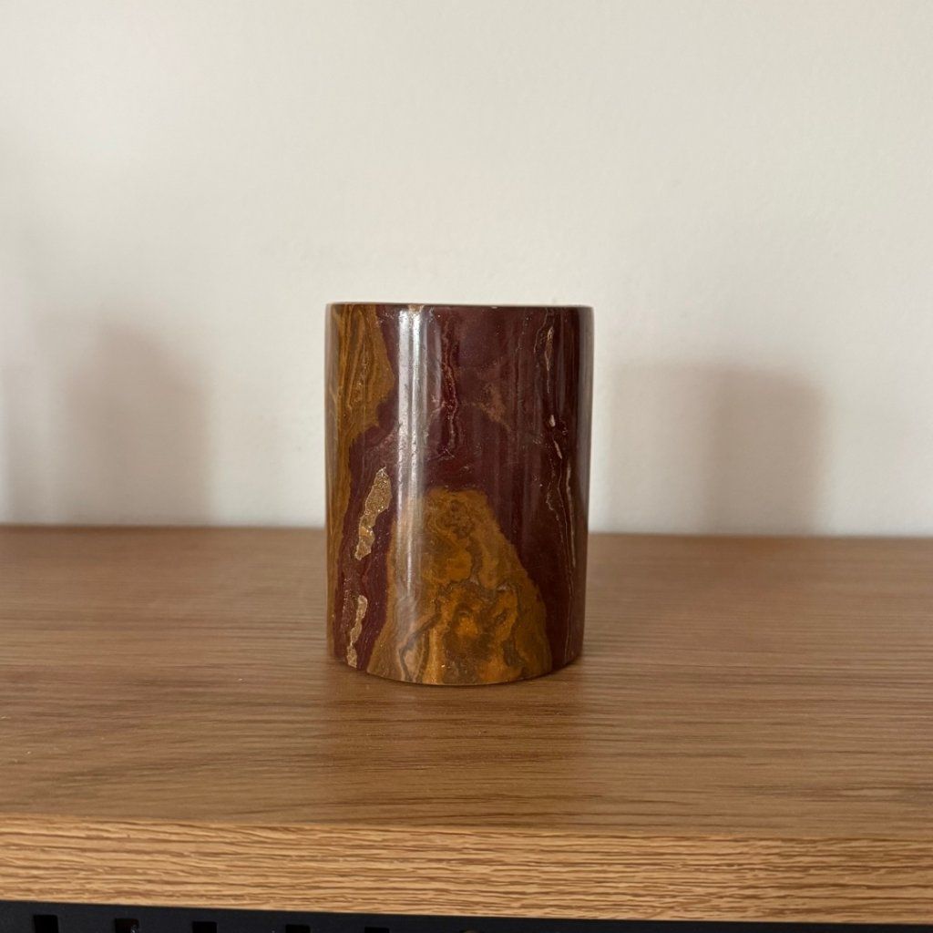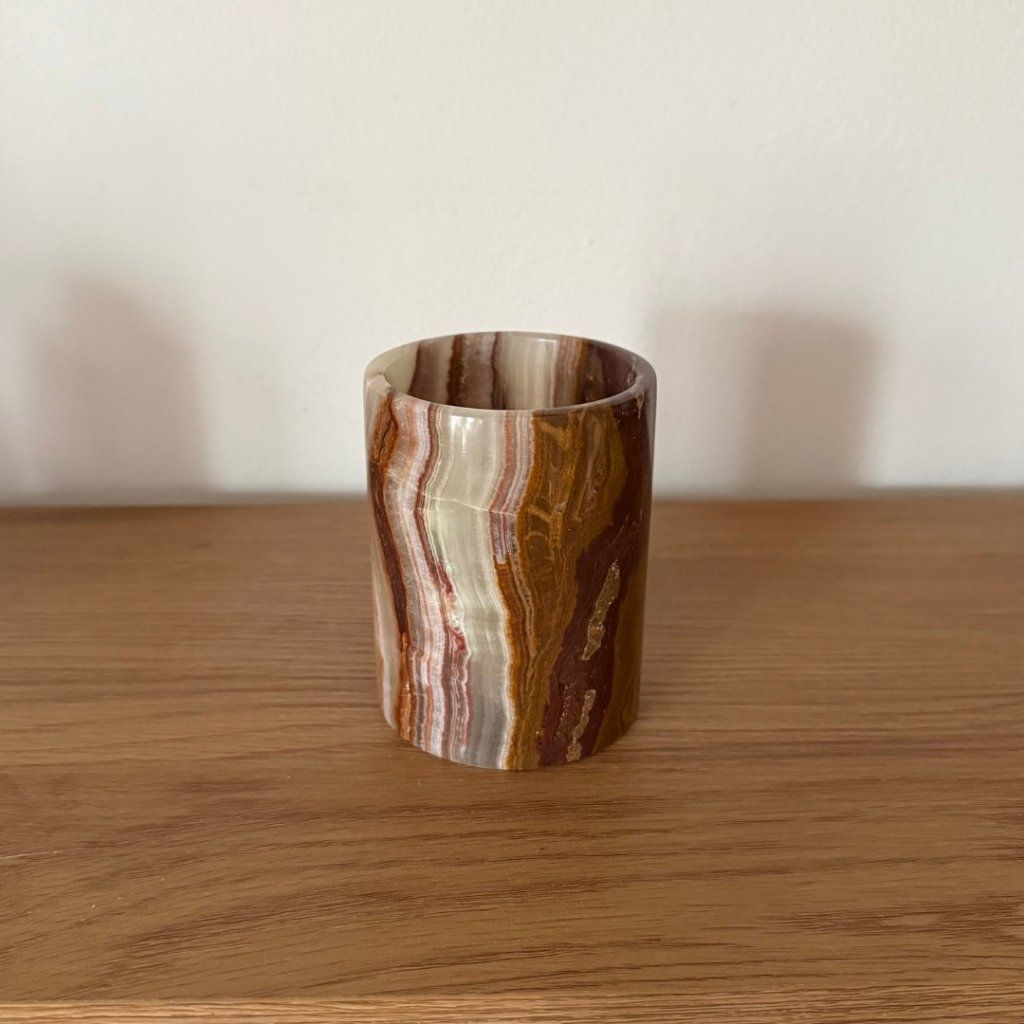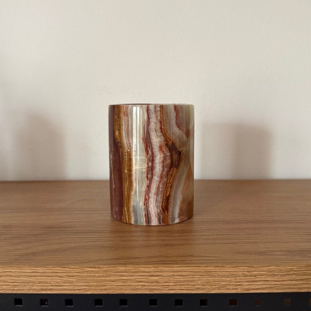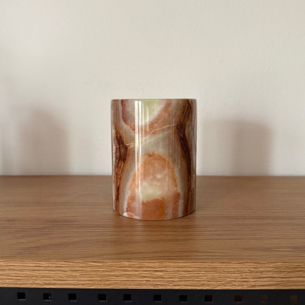 Svícen je vyroben z přírodního aragonitu, známého také jako pákistánský onyx. Tento kámen vyniká pevností, jemným leskem a přirozenou kresbou, která vznikala po tisíce let. Kupujete přesně ten svícen, který vidíte na fotografiích, žádný náhodný výběr, ale konkrétní originální kus.