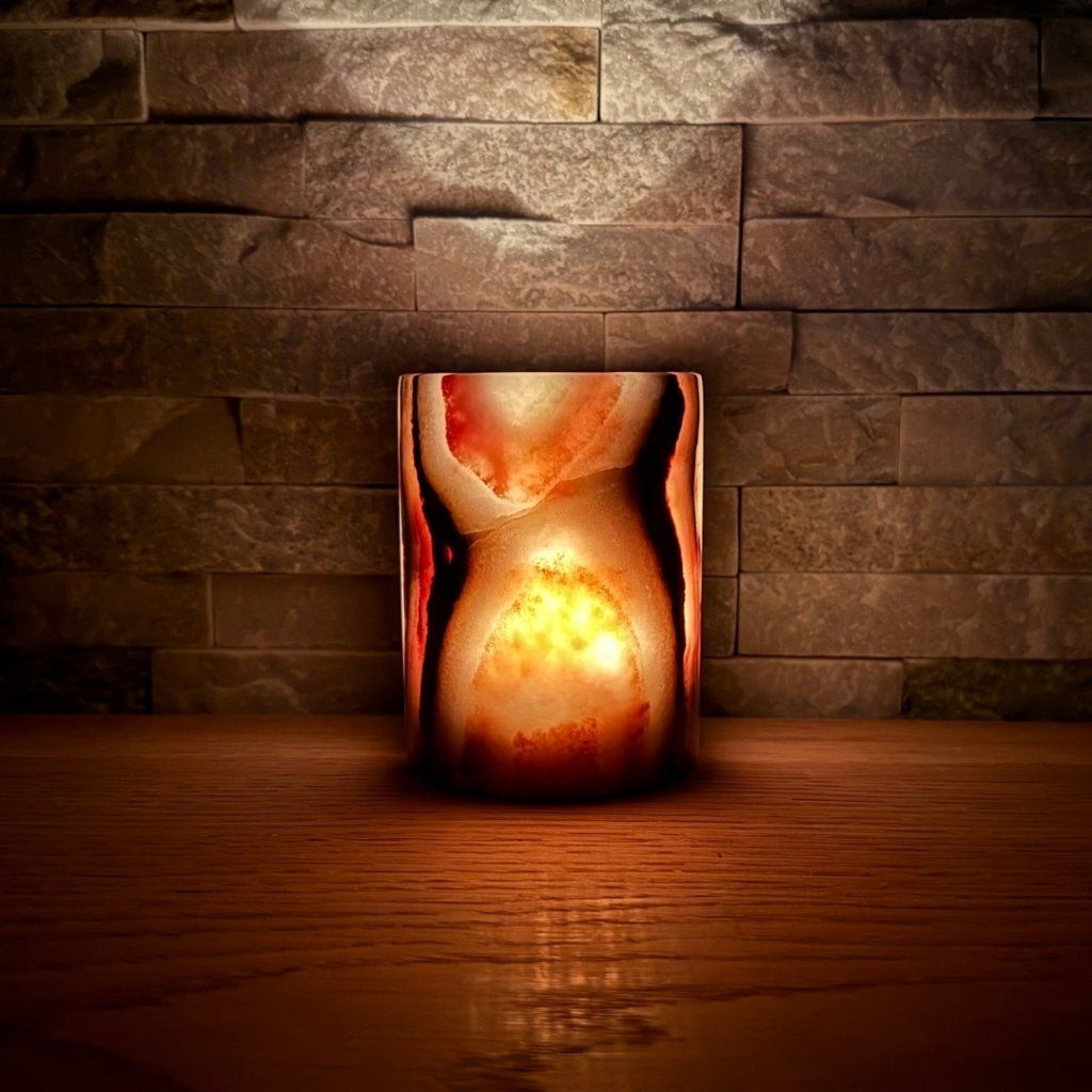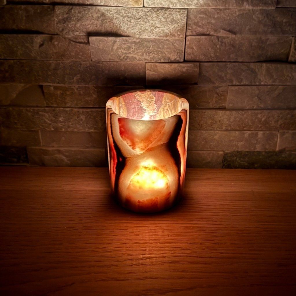 Každý svícen z aragonitu je jedinečný svým vzhledem. Tento konkrétní kus má přesně takovou strukturu, žilkování a barevnost, jakou vidíte na fotkách. Doporučujeme si fotogalerii projít opravdu pečlivě, abyste věděli, jaký svícen si domů vybíráte. Po zapálení čajové svíčky začne světlo jemně prosvítat kamenem a zvýrazní jeho přirozenou kresbu.