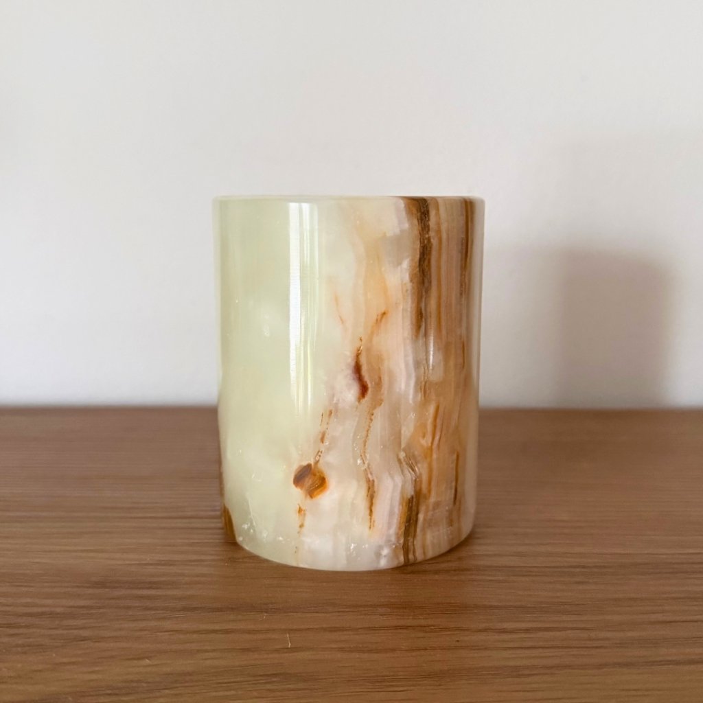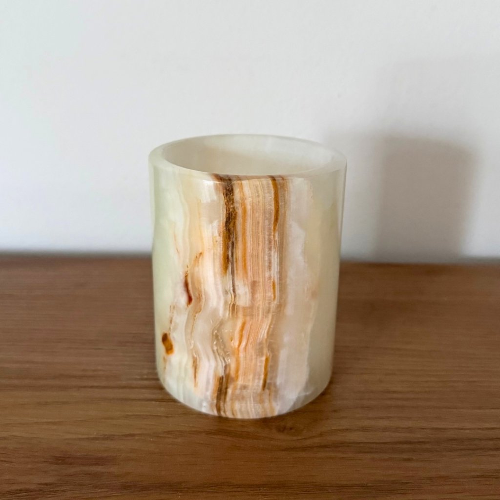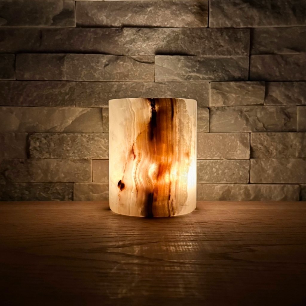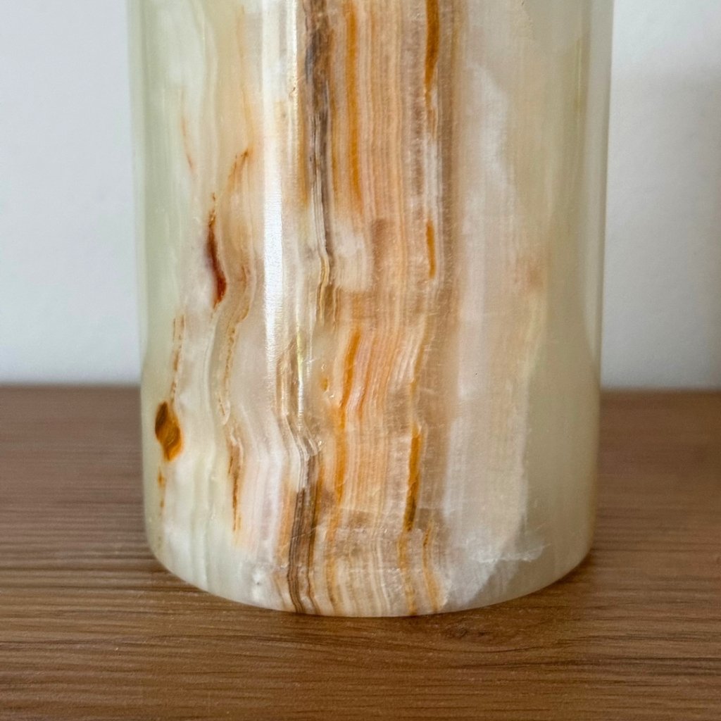 Svícen je vyroben z přírodního aragonitu, známého také jako pákistánský onyx. Tento kámen vyniká pevností, jemným leskem a přirozenou kresbou, která vznikala po tisíce let. Kupujete přesně ten svícen, který vidíte na fotografiích, žádný náhodný výběr, ale konkrétní originální kus.