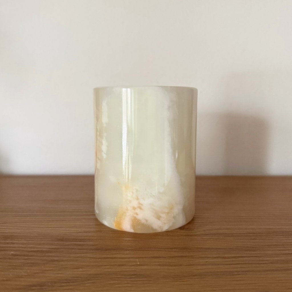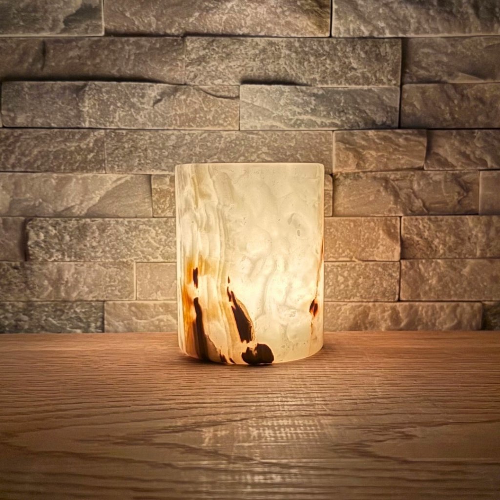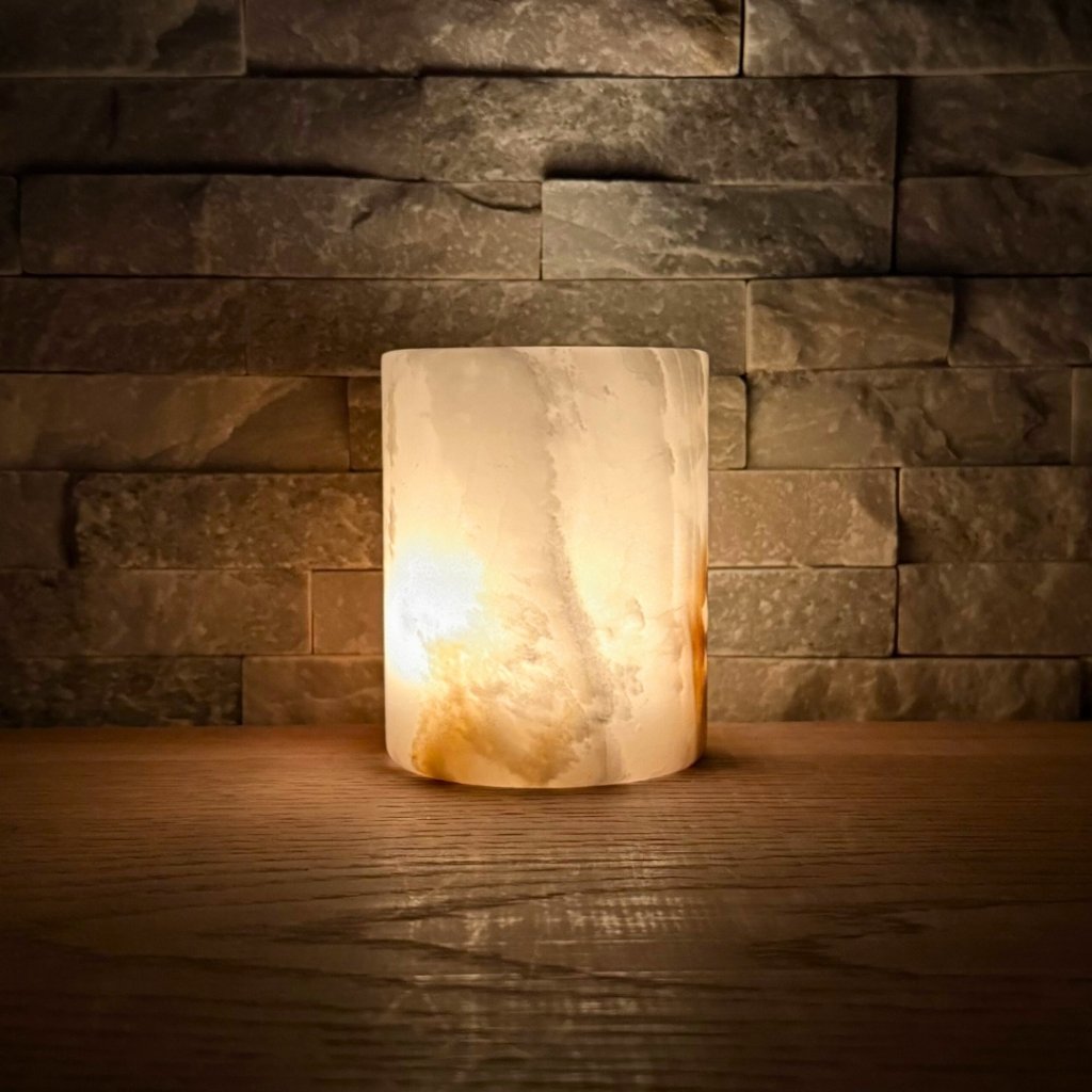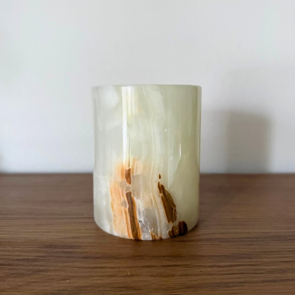Svícen je vyroben z přírodního aragonitu, známého také jako pákistánský onyx. Tento kámen vyniká pevností, jemným leskem a přirozenou kresbou, která vznikala po tisíce let. Kupujete přesně ten svícen, který vidíte na fotografiích, žádný náhodný výběr, ale konkrétní originální kus.