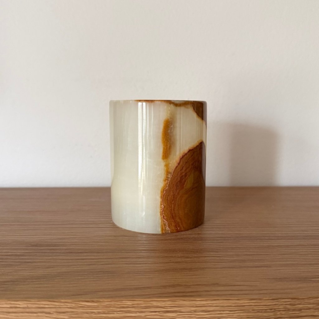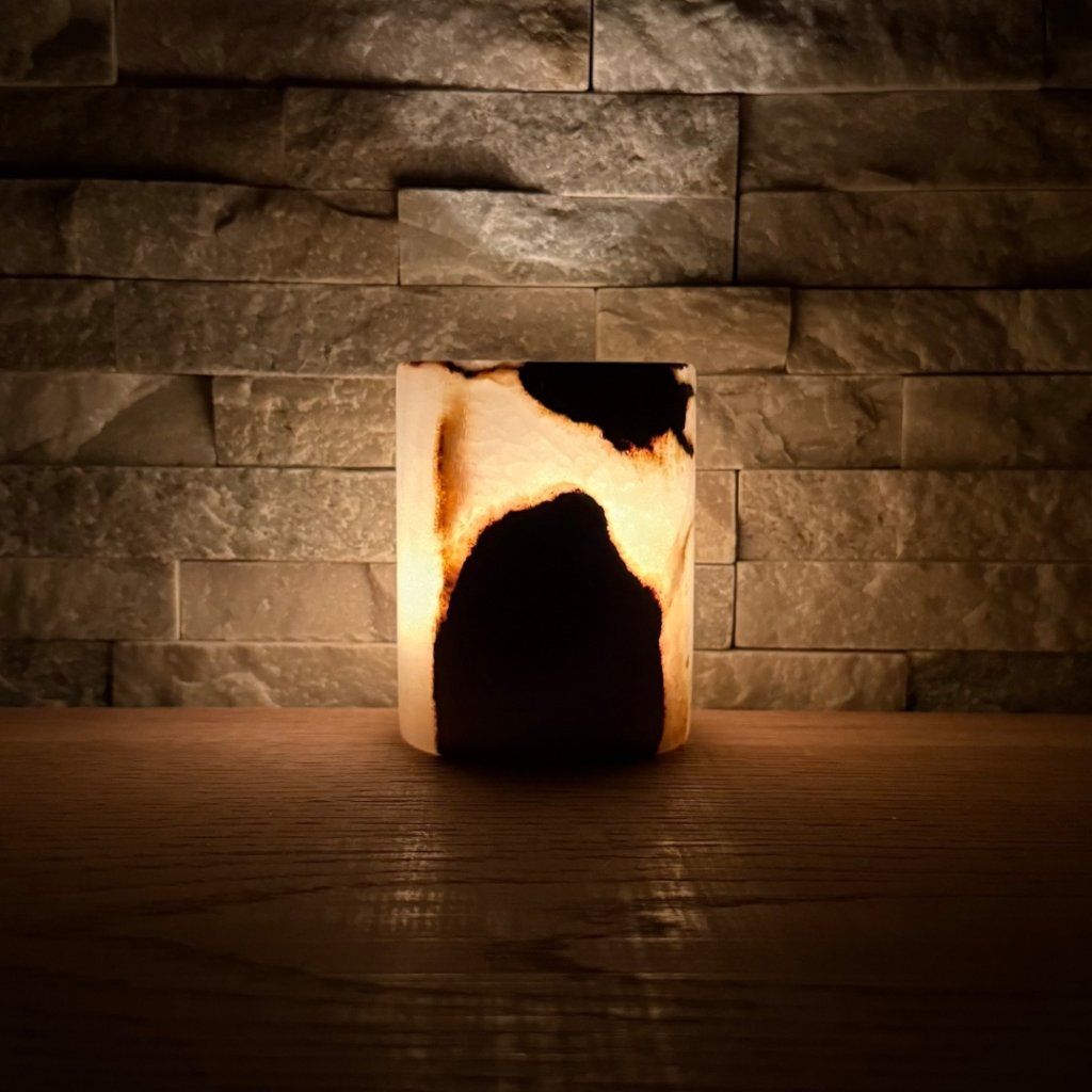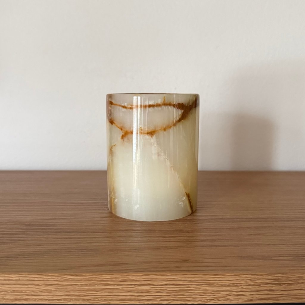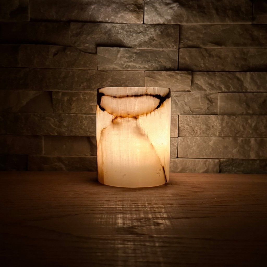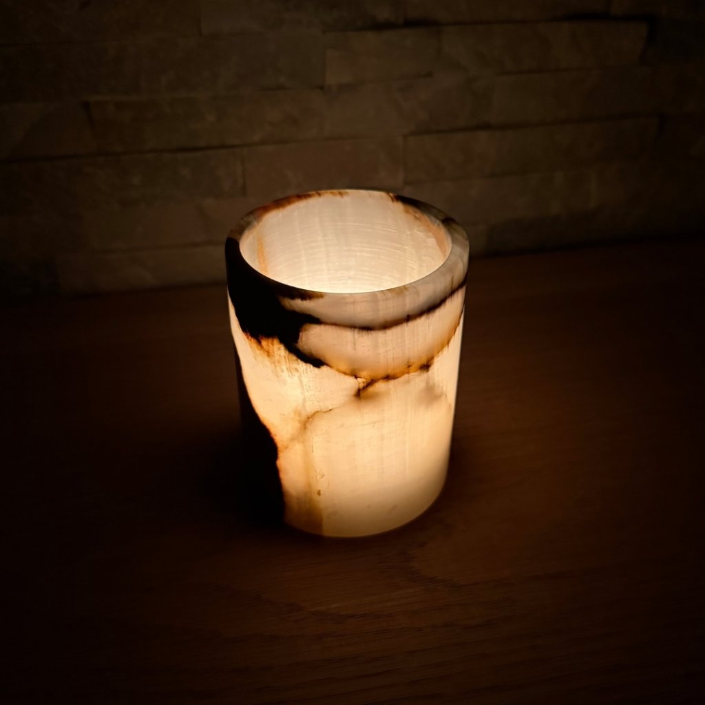 Svícen je vyroben z přírodního aragonitu, známého také jako pákistánský onyx. Tento kámen vyniká pevností, jemným leskem a přirozenou kresbou, která vznikala po tisíce let. Kupujete přesně ten svícen, který vidíte na fotografiích, žádný náhodný výběr, ale konkrétní originální kus.