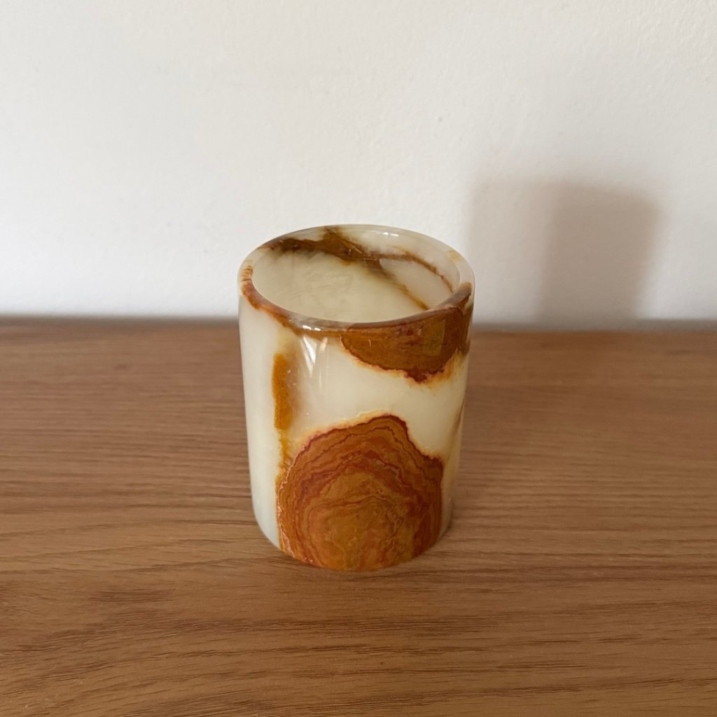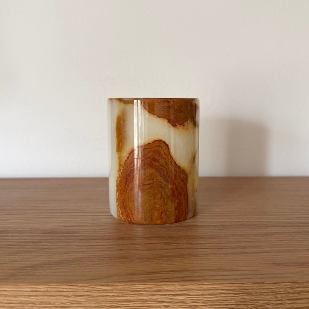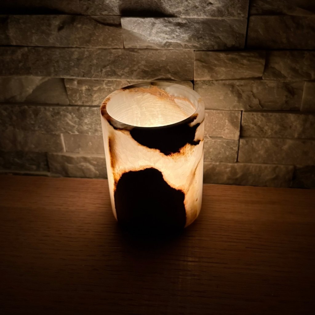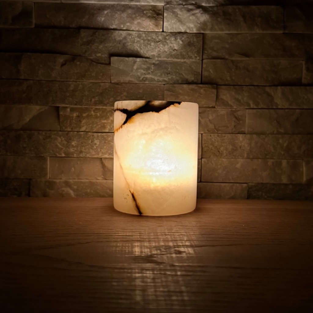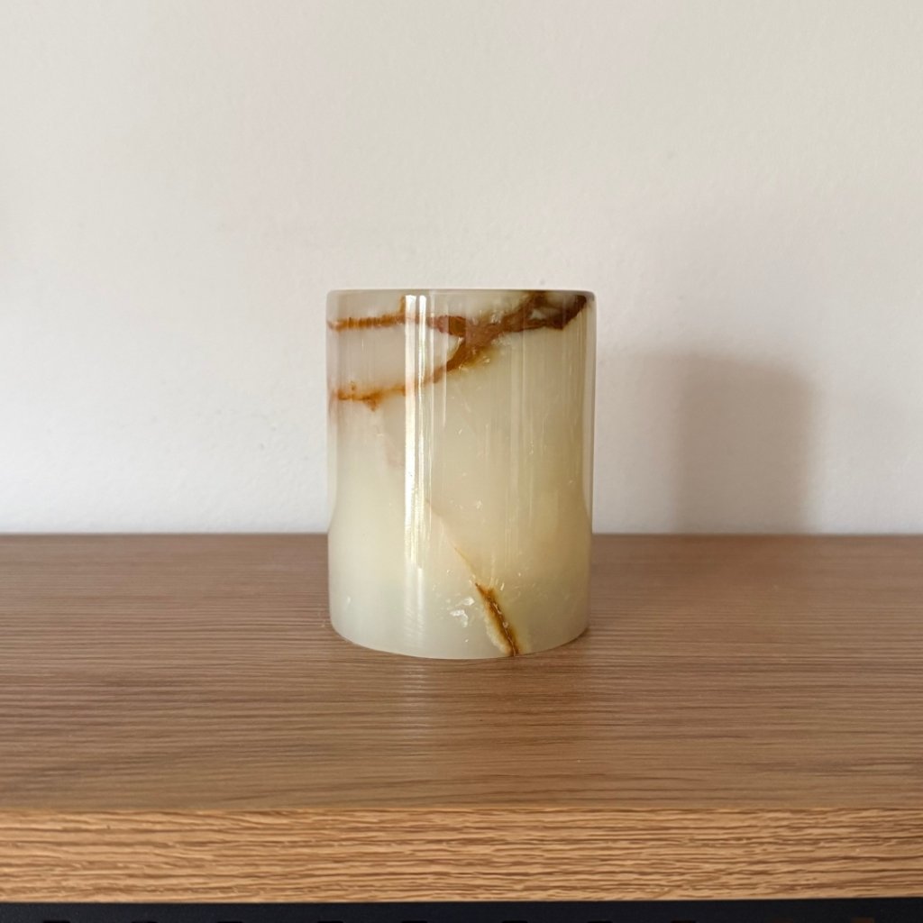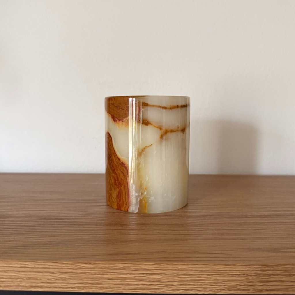 Svícen je vyroben z přírodního aragonitu, známého také jako pákistánský onyx. Tento kámen vyniká pevností, jemným leskem a přirozenou kresbou, která vznikala po tisíce let. Kupujete přesně ten svícen, který vidíte na fotografiích, žádný náhodný výběr, ale konkrétní originální kus.