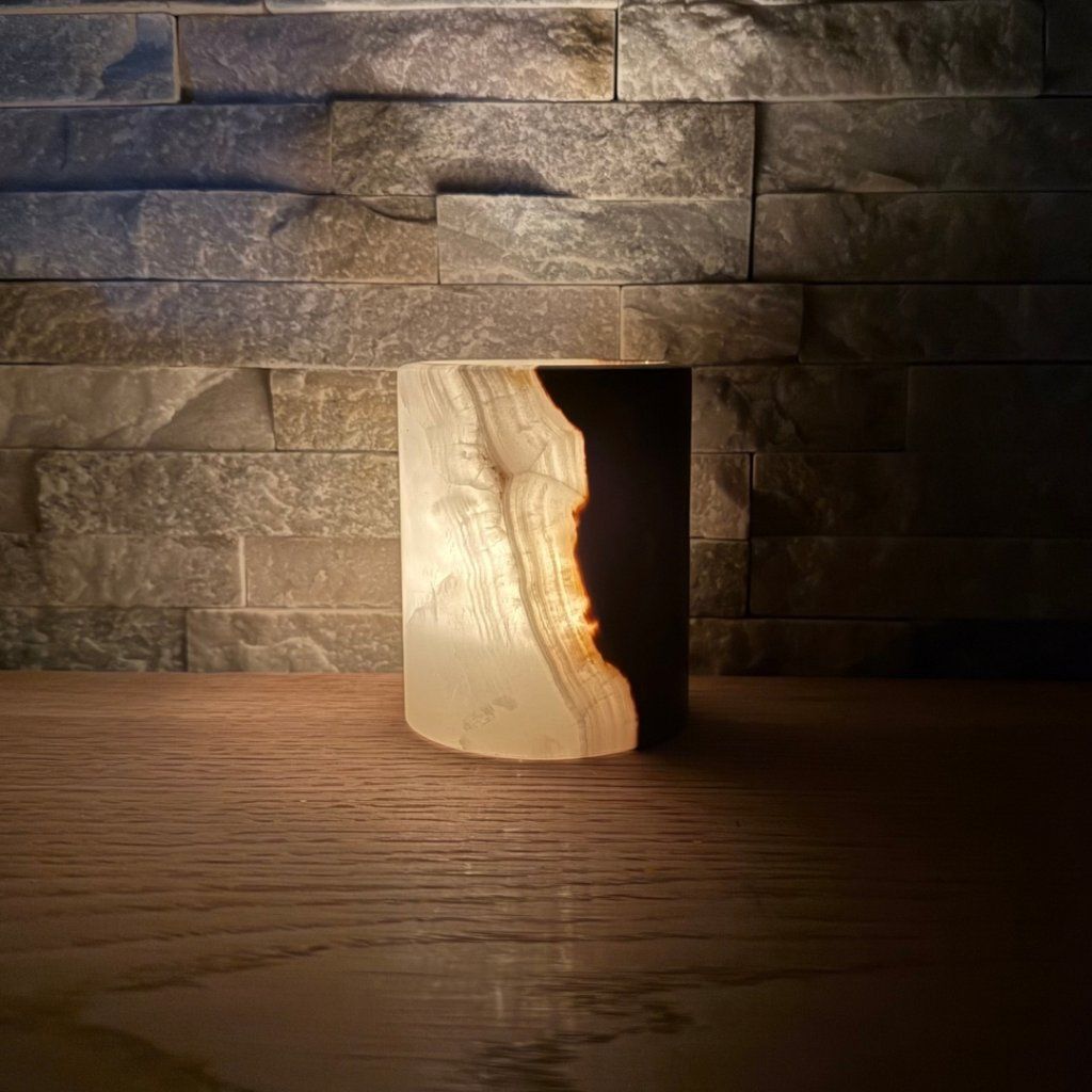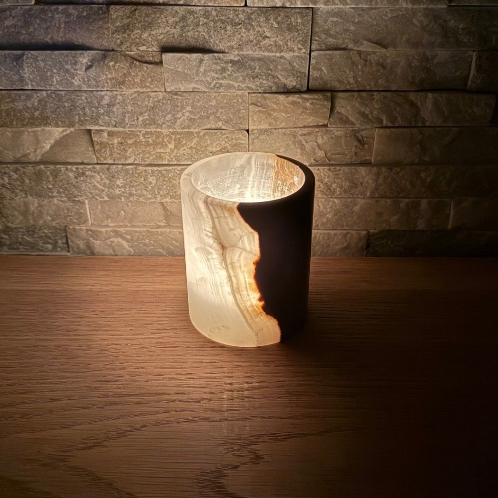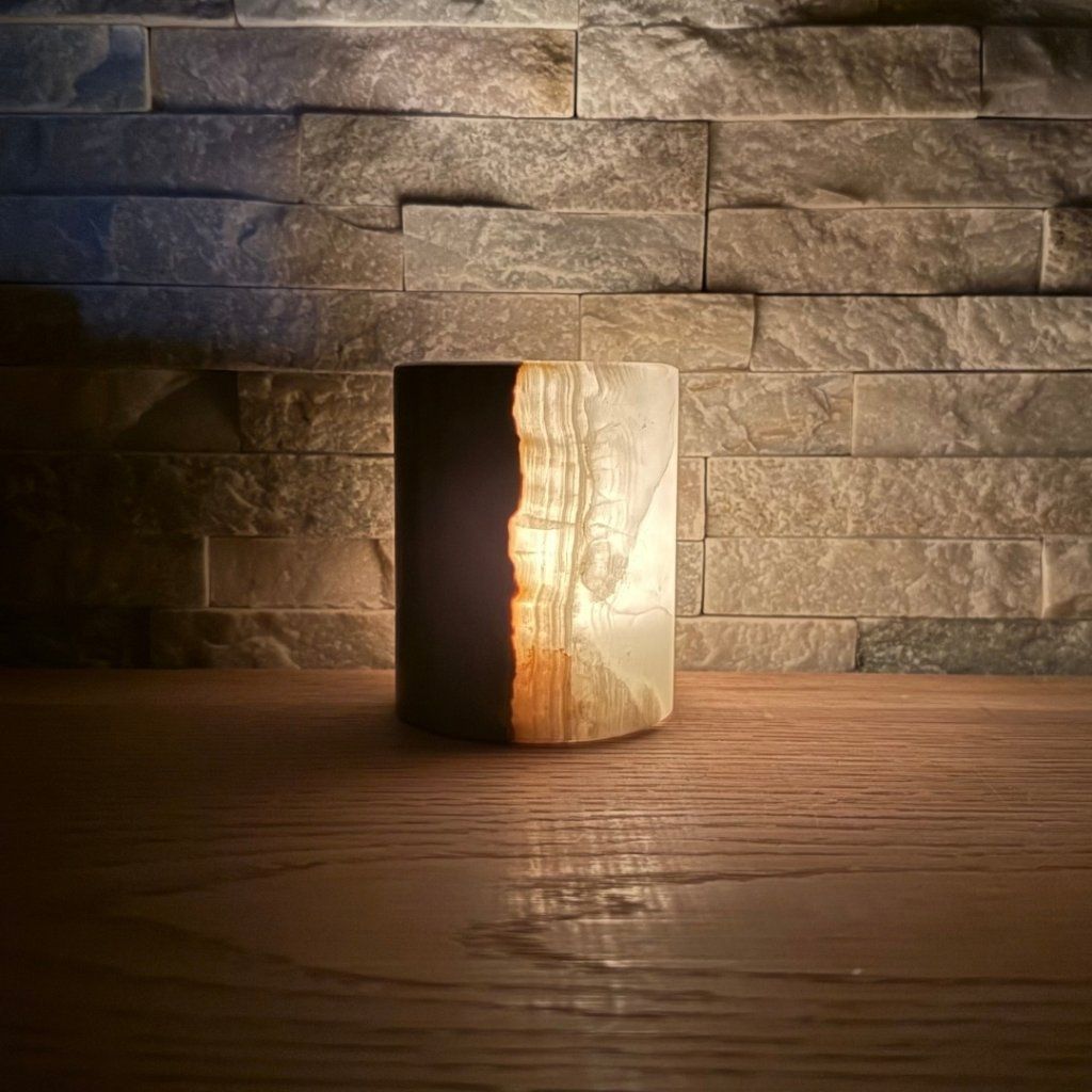 Svícen je vyroben z přírodního aragonitu, známého také jako pákistánský onyx. Tento kámen vyniká pevností, jemným leskem a přirozenou kresbou, která vznikala po tisíce let. Kupujete přesně ten svícen, který vidíte na fotografiích, žádný náhodný výběr, ale konkrétní originální kus.