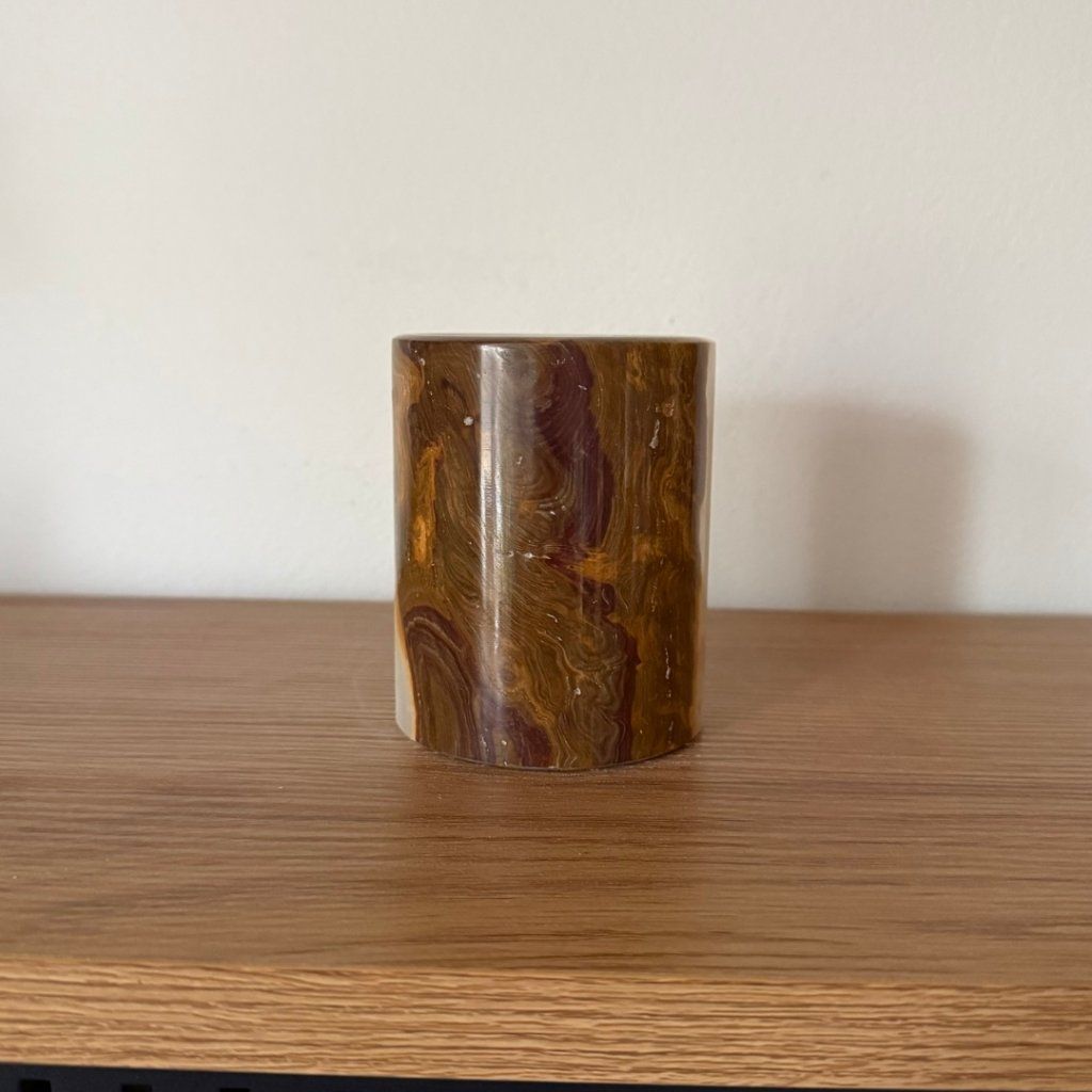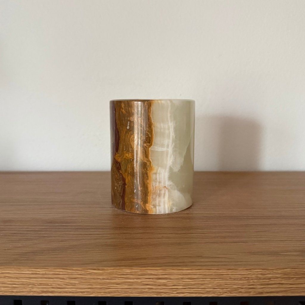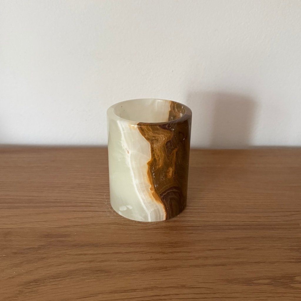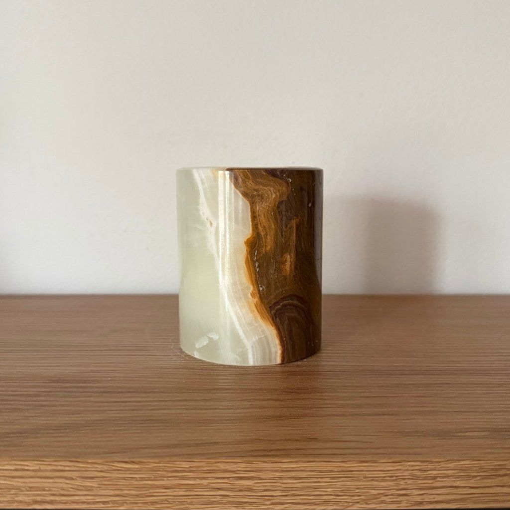 Svícen je vyroben z přírodního aragonitu, známého také jako pákistánský onyx. Tento kámen vyniká pevností, jemným leskem a přirozenou kresbou, která vznikala po tisíce let. Kupujete přesně ten svícen, který vidíte na fotografiích, žádný náhodný výběr, ale konkrétní originální kus.