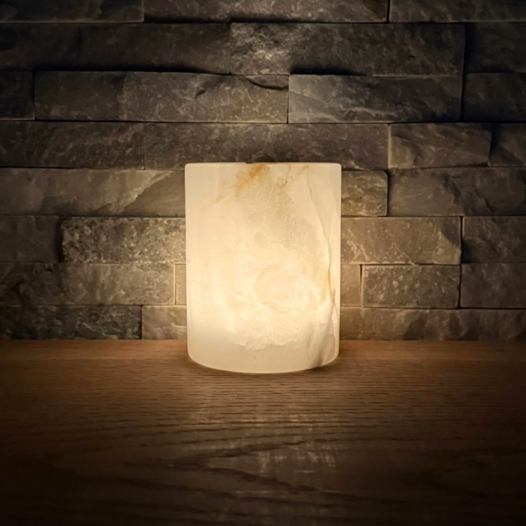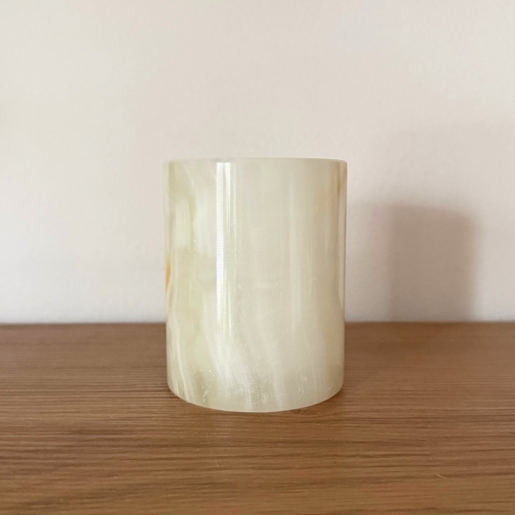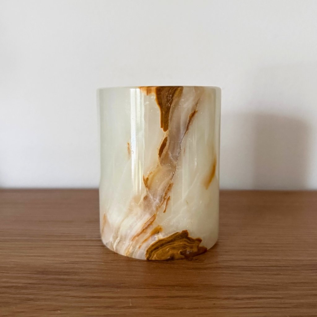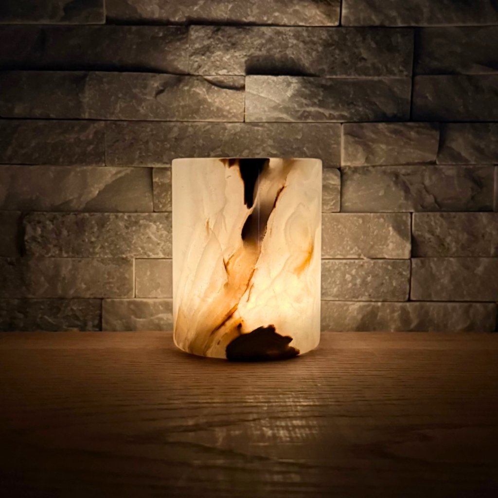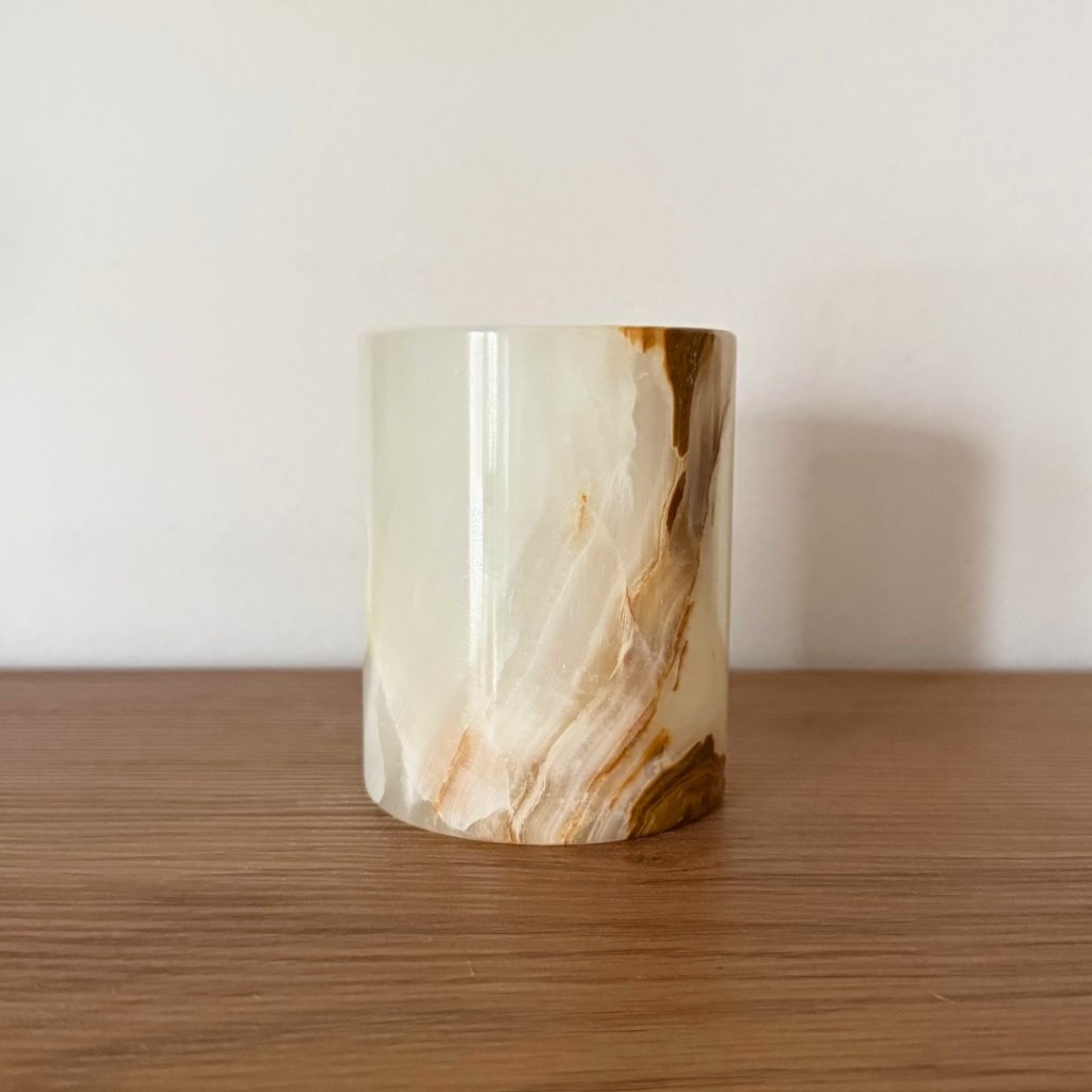 Svícen je vyroben z přírodního aragonitu, známého také jako pákistánský onyx. Tento kámen vyniká pevností, jemným leskem a přirozenou kresbou, která vznikala po tisíce let. Kupujete přesně ten svícen, který vidíte na fotografiích, žádný náhodný výběr, ale konkrétní originální kus.
