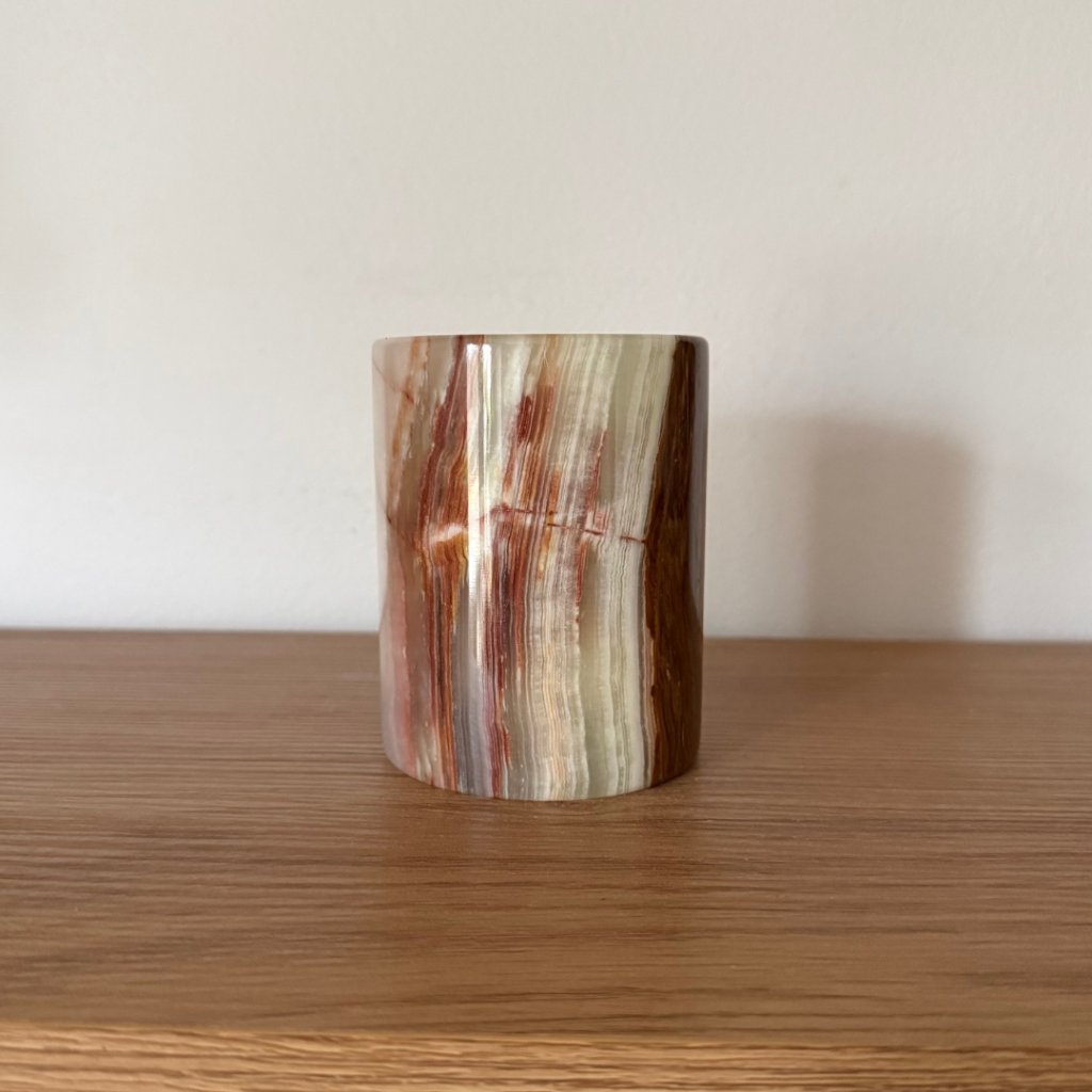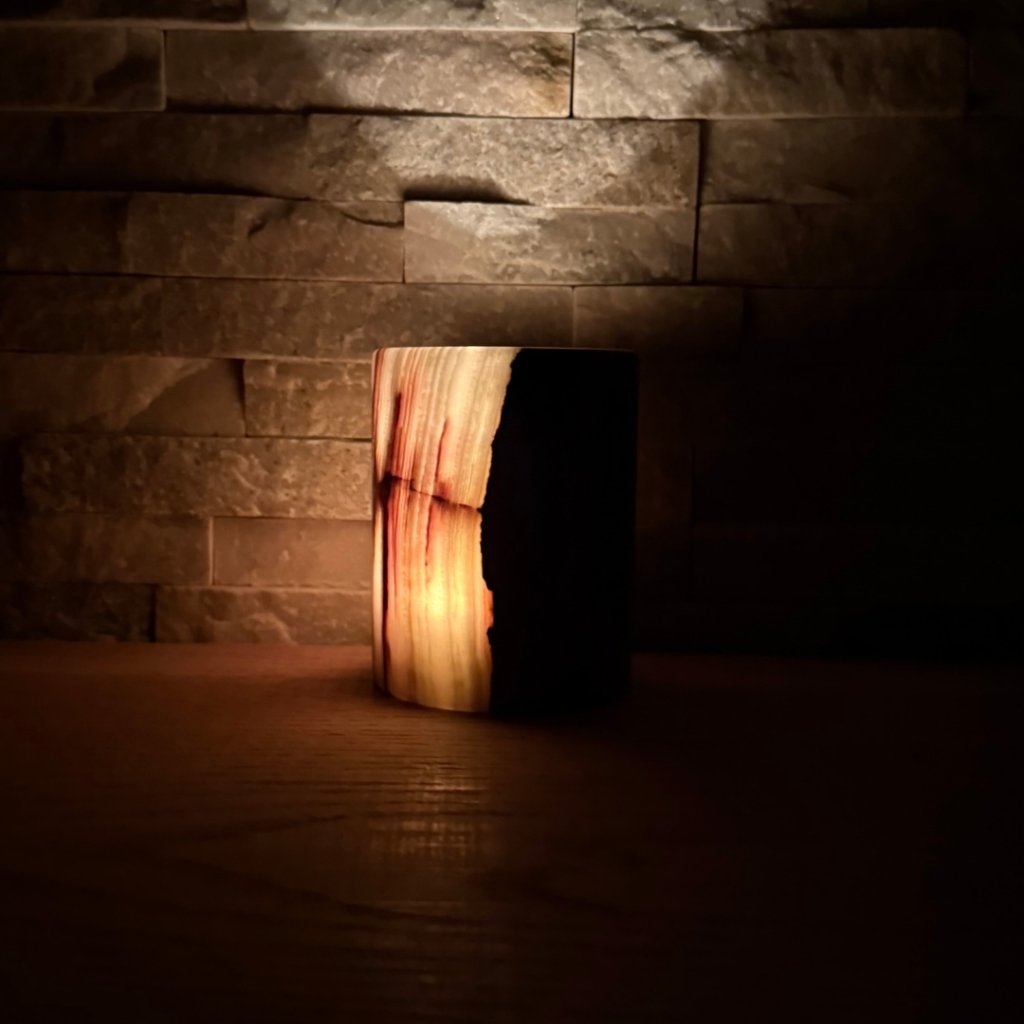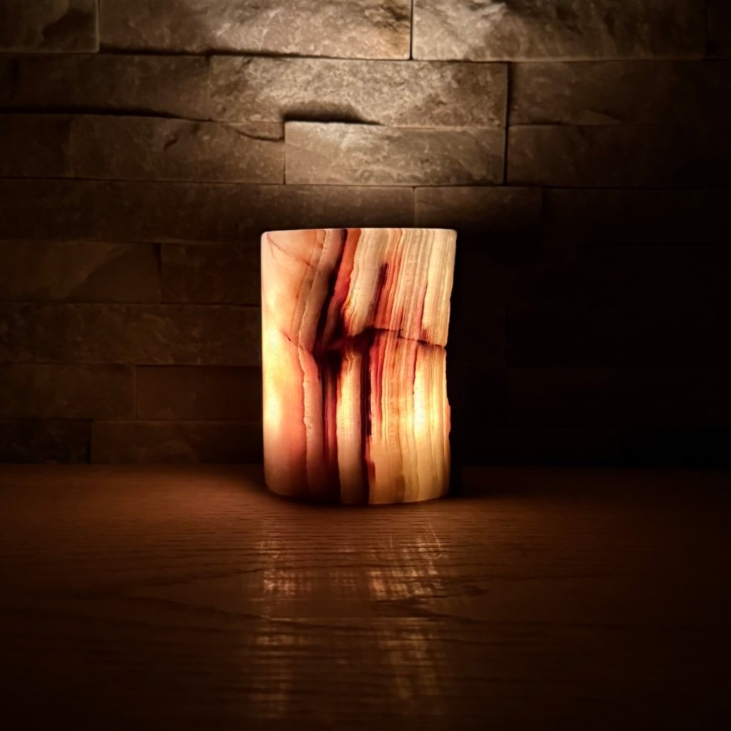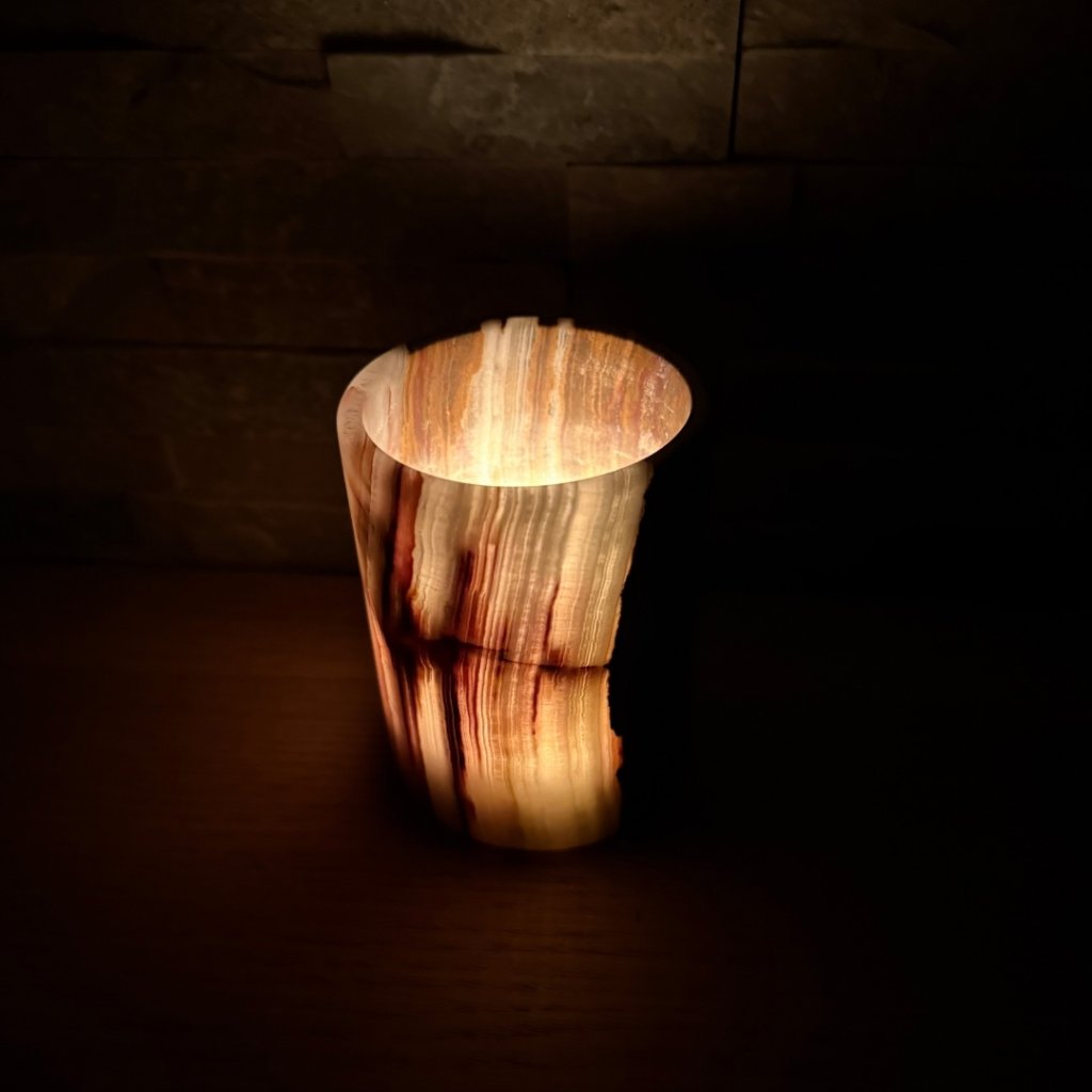Svícen je vyroben z přírodního aragonitu, známého také jako pákistánský onyx. Tento kámen vyniká pevností, jemným leskem a přirozenou kresbou, která vznikala po tisíce let. Kupujete přesně ten svícen, který vidíte na fotografiích, žádný náhodný výběr, ale konkrétní originální kus.