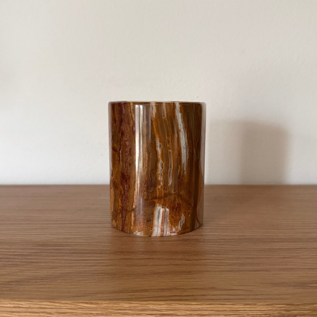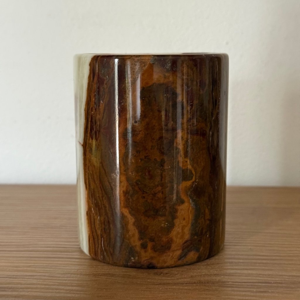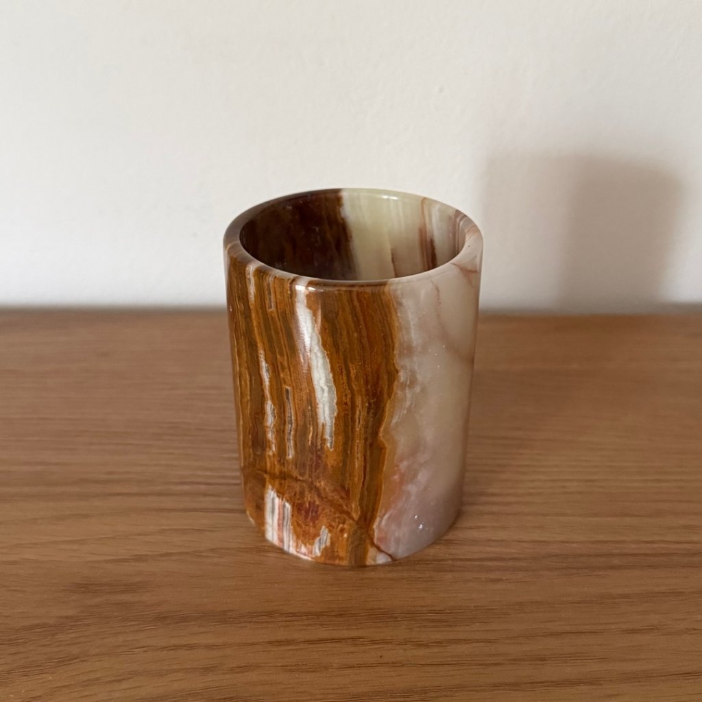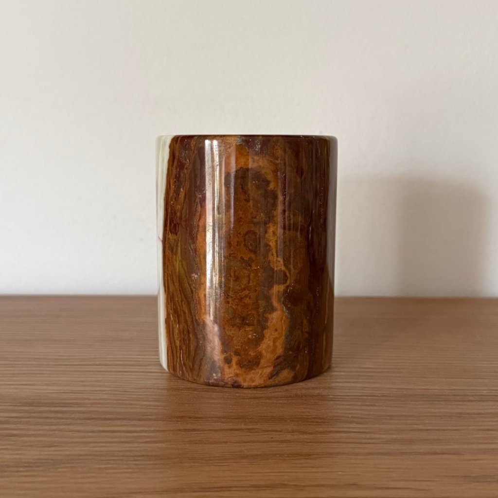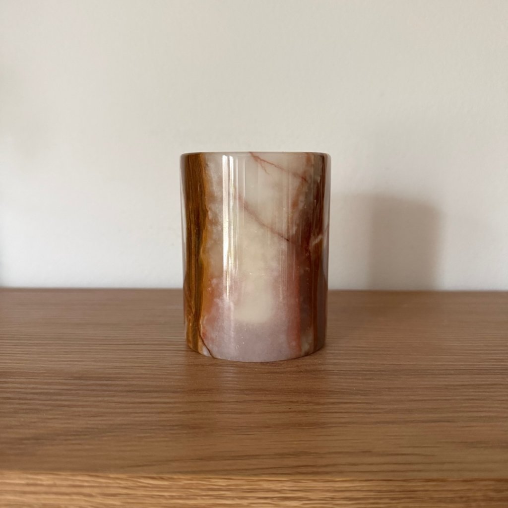 Svícen je vyroben z přírodního aragonitu, známého také jako pákistánský onyx. Tento kámen vyniká pevností, jemným leskem a přirozenou kresbou, která vznikala po tisíce let. Kupujete přesně ten svícen, který vidíte na fotografiích, žádný náhodný výběr, ale konkrétní originální kus.