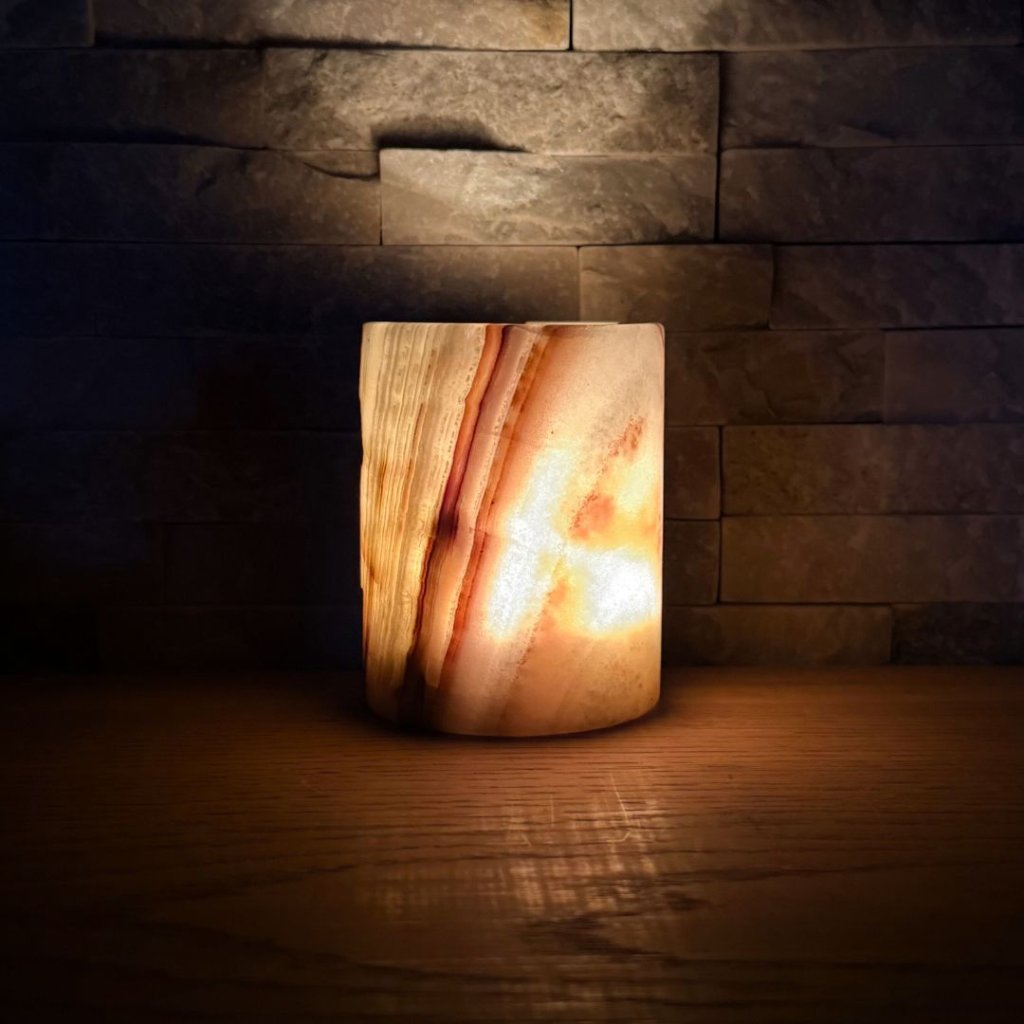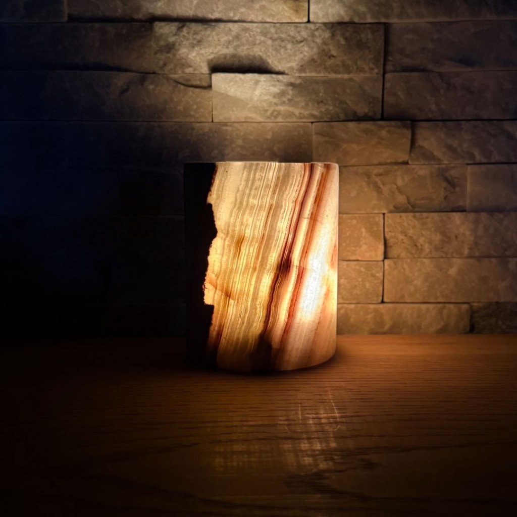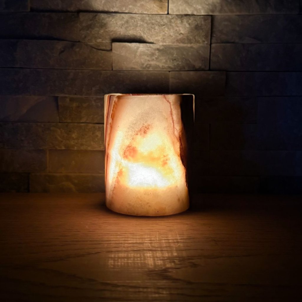 Svícen je vyroben z přírodního aragonitu, známého také jako pákistánský onyx. Tento kámen vyniká pevností, jemným leskem a přirozenou kresbou, která vznikala po tisíce let. Kupujete přesně ten svícen, který vidíte na fotografiích, žádný náhodný výběr, ale konkrétní originální kus.