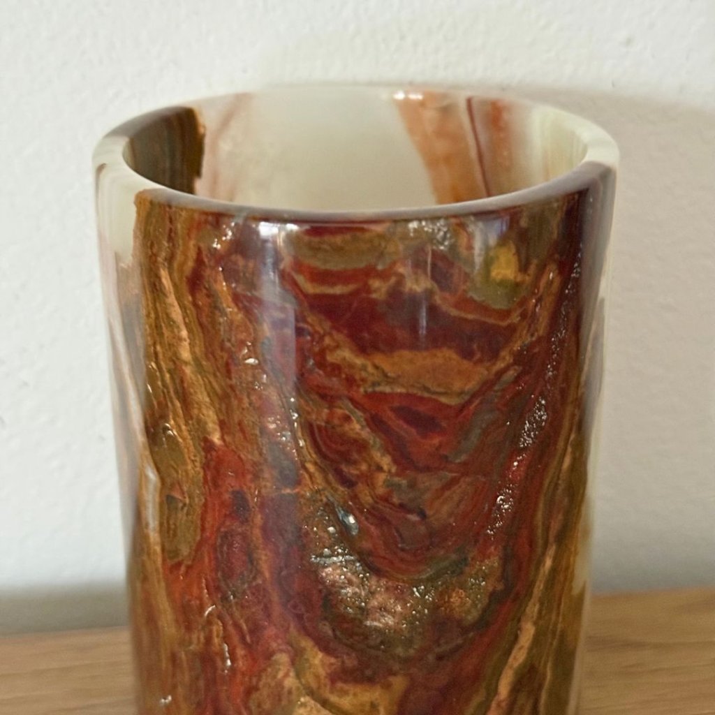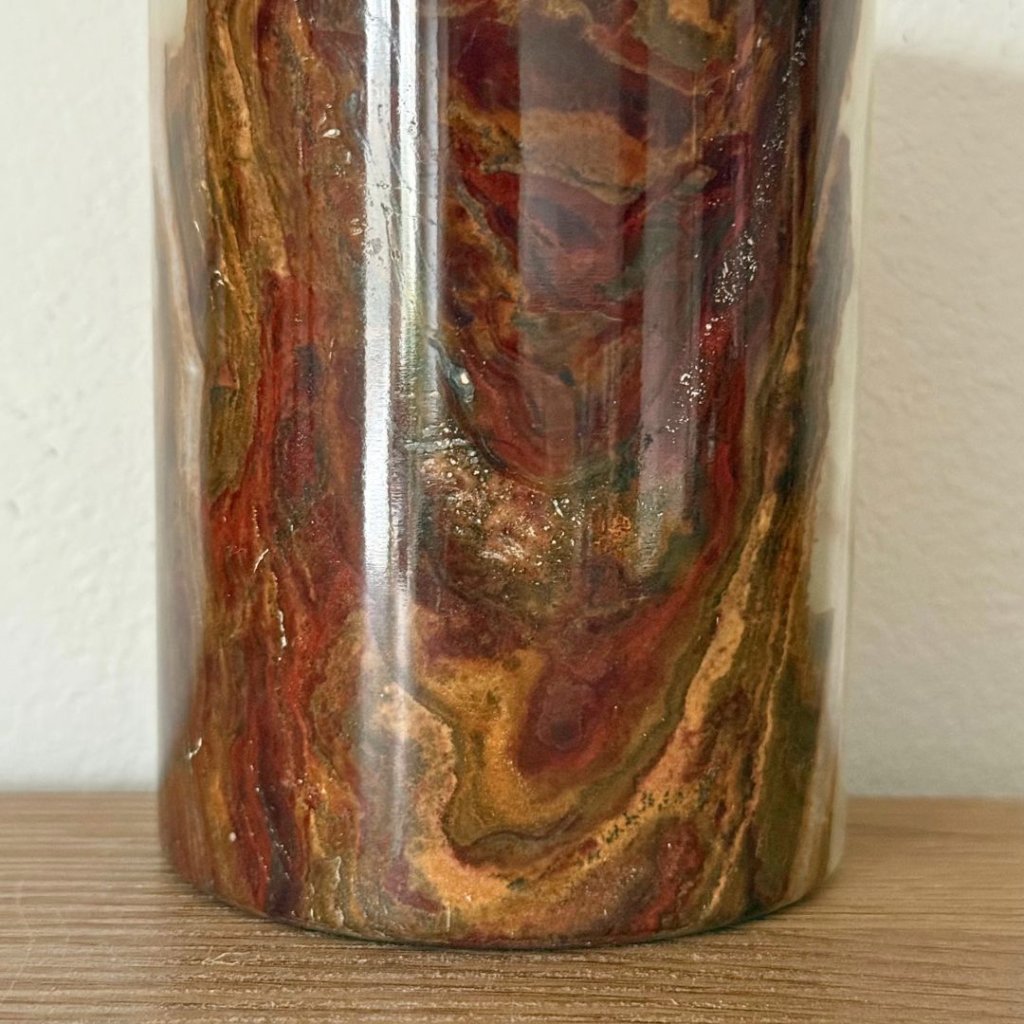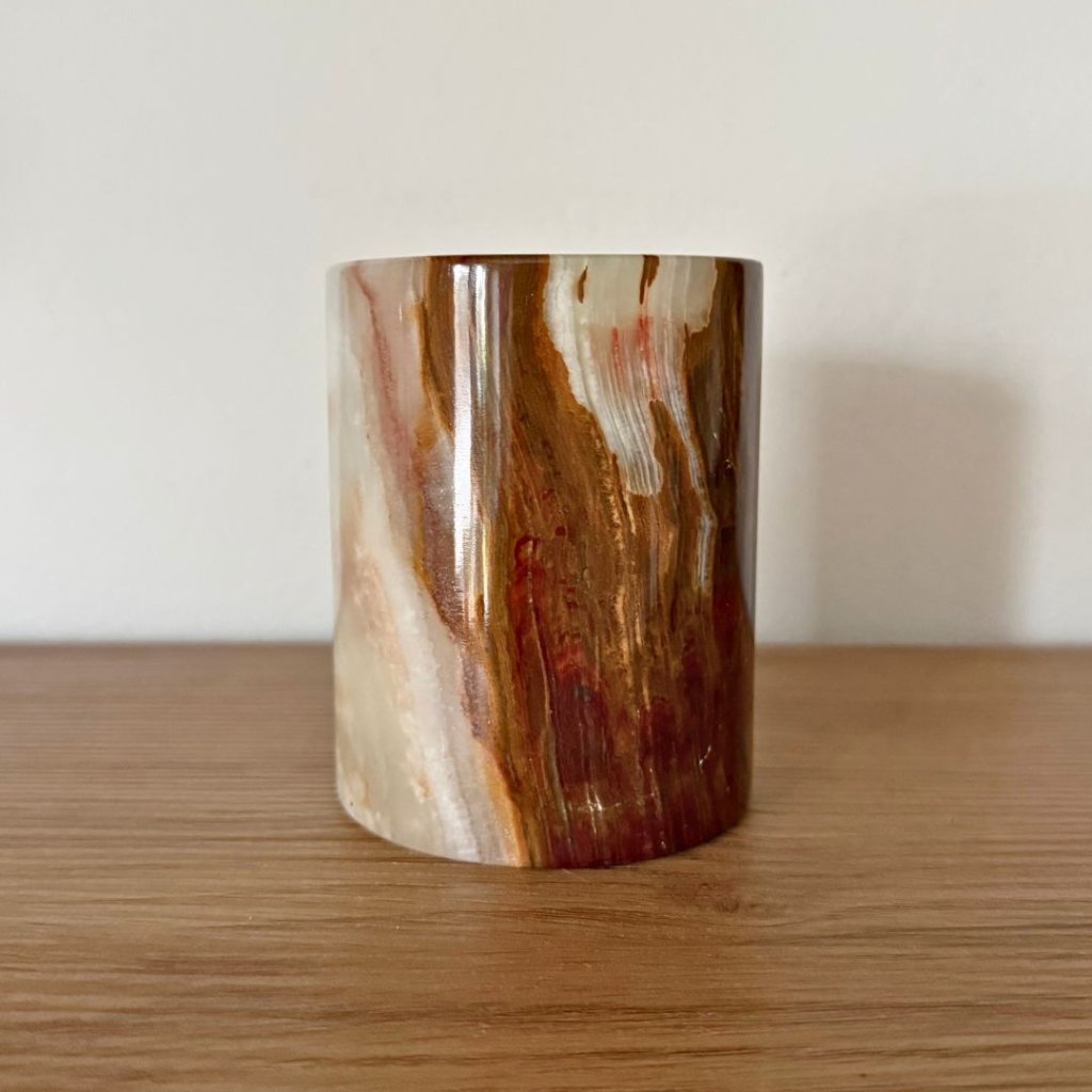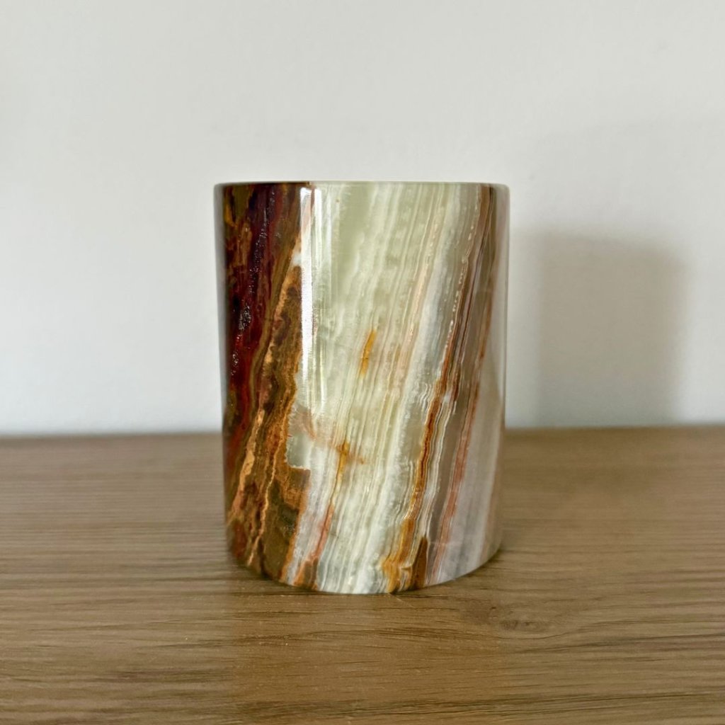 Svícen je vyroben z přírodního aragonitu, známého také jako pákistánský onyx. Tento kámen vyniká pevností, jemným leskem a přirozenou kresbou, která vznikala po tisíce let. Kupujete přesně ten svícen, který vidíte na fotografiích, žádný náhodný výběr, ale konkrétní originální kus.