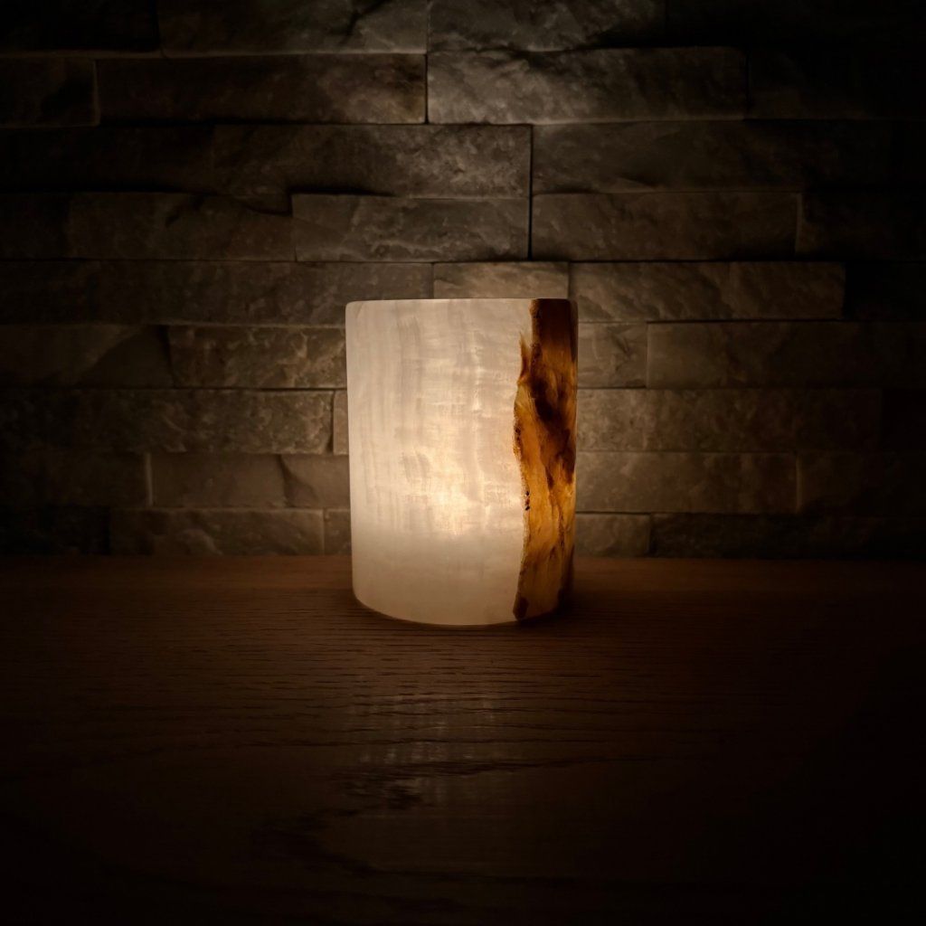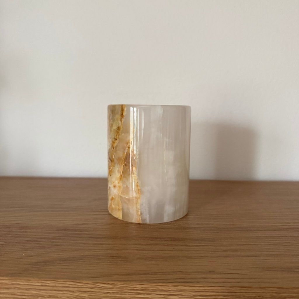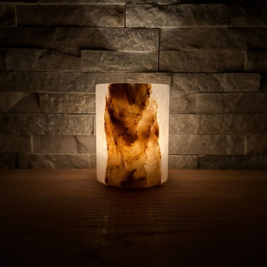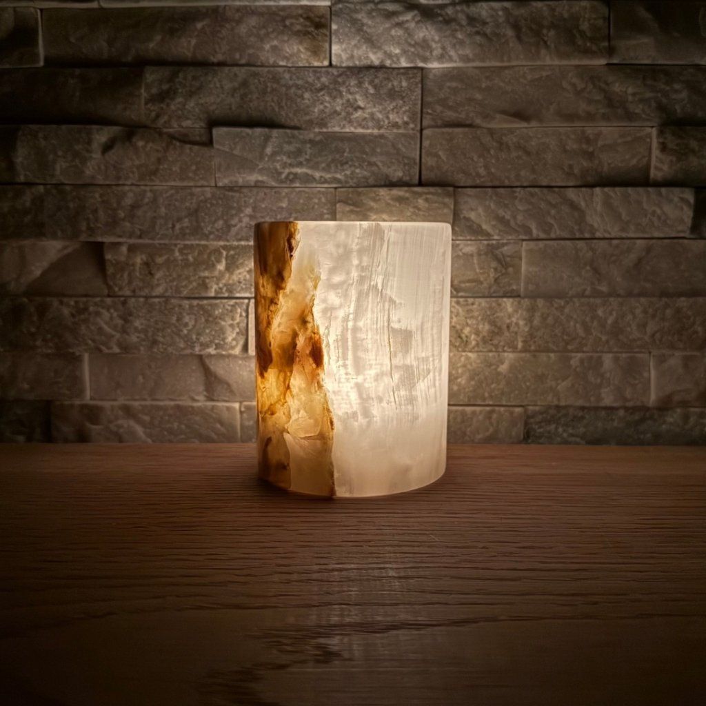 Svícen je vyroben z přírodního aragonitu, známého také jako pákistánský onyx. Tento kámen vyniká pevností, jemným leskem a přirozenou kresbou, která vznikala po tisíce let. Kupujete přesně ten svícen, který vidíte na fotografiích, žádný náhodný výběr, ale konkrétní originální kus.