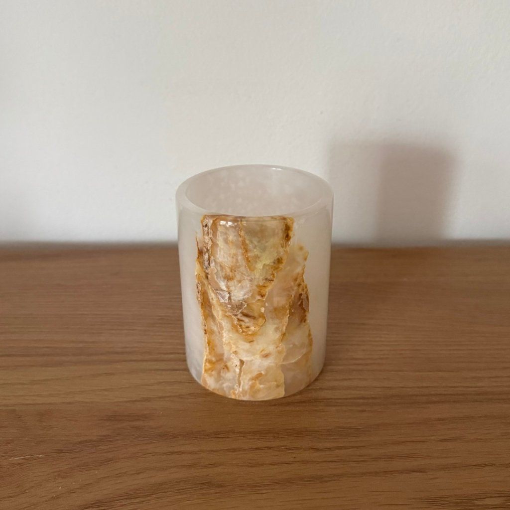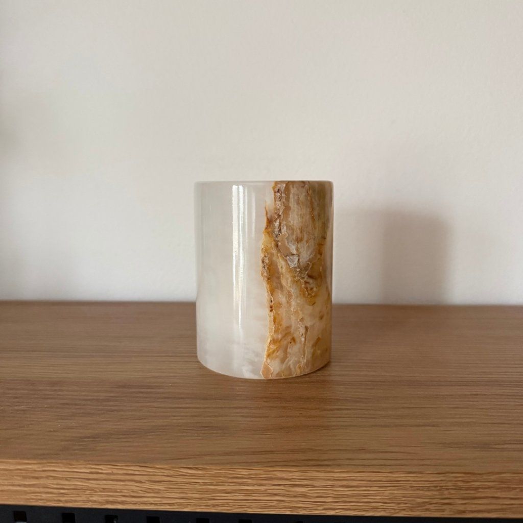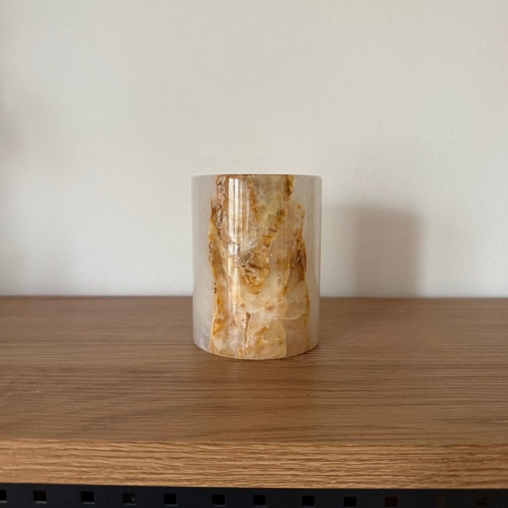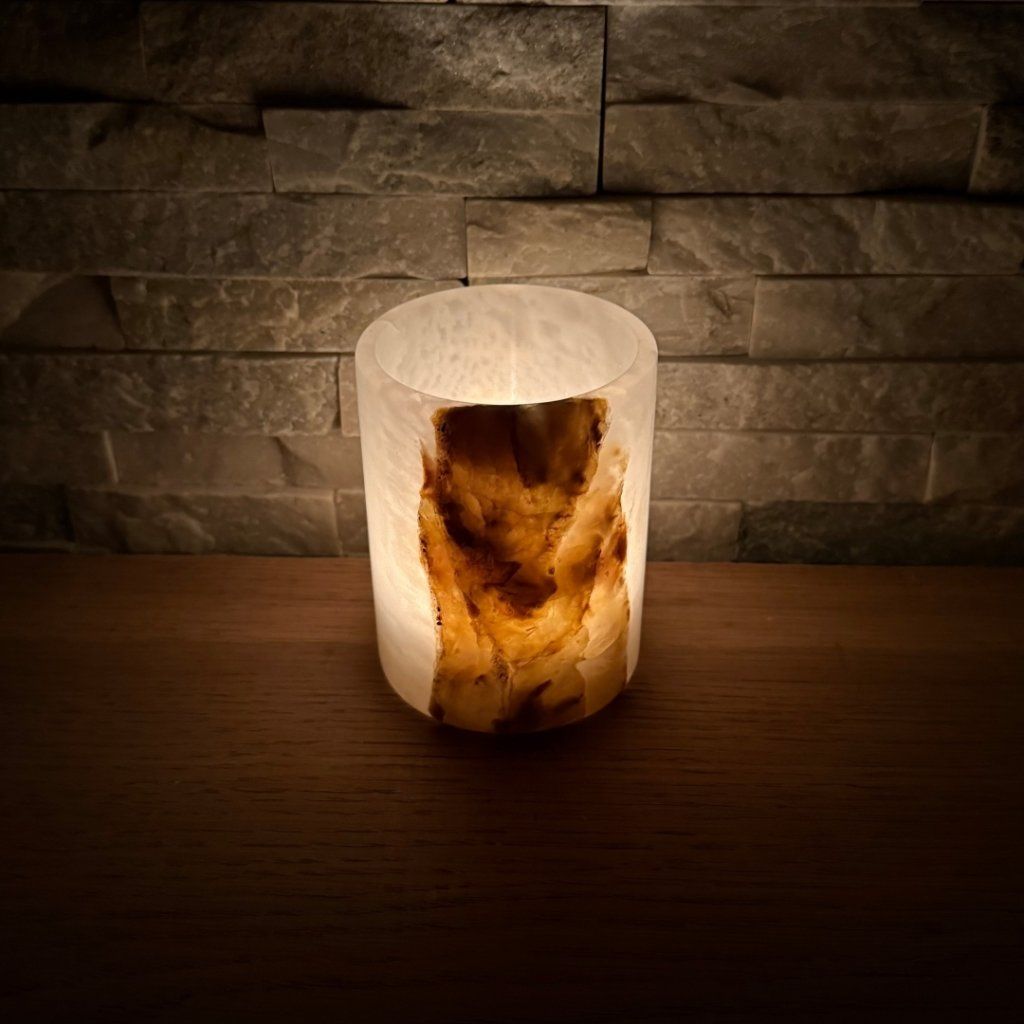 Svícen je vyroben z přírodního aragonitu, známého také jako pákistánský onyx. Tento kámen vyniká pevností, jemným leskem a přirozenou kresbou, která vznikala po tisíce let. Kupujete přesně ten svícen, který vidíte na fotografiích, žádný náhodný výběr, ale konkrétní originální kus.
