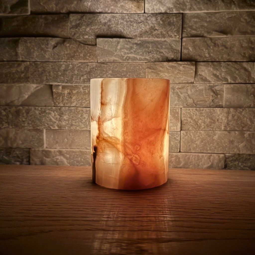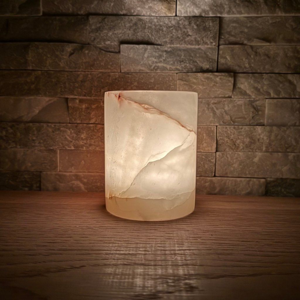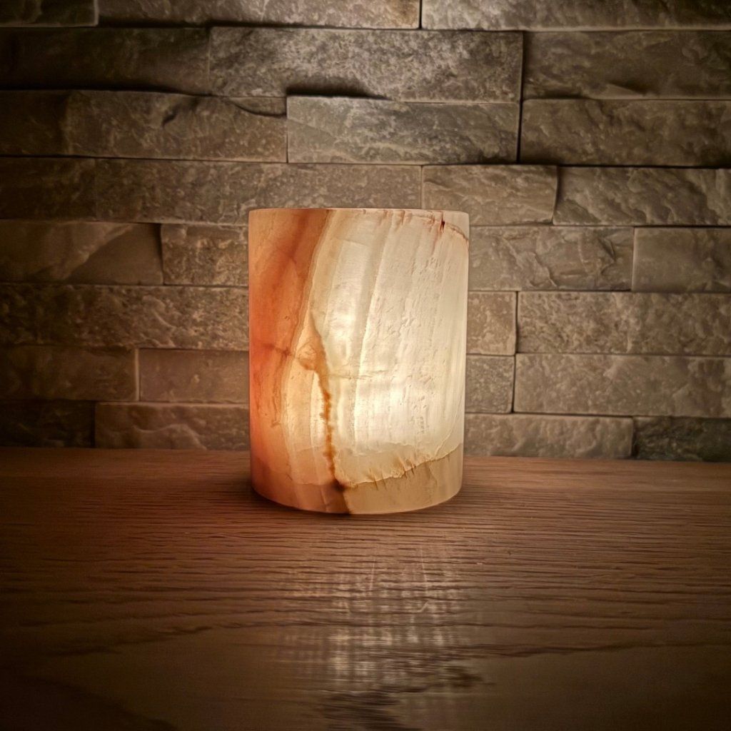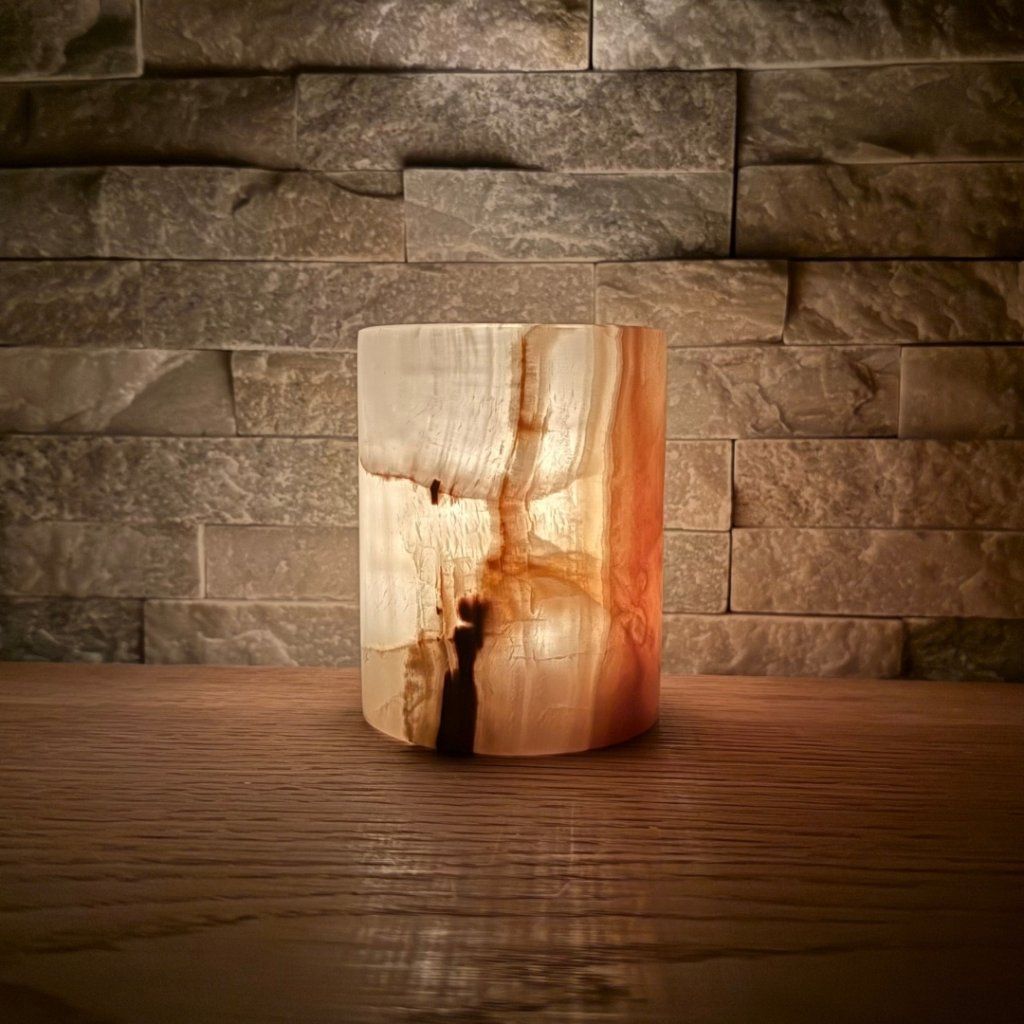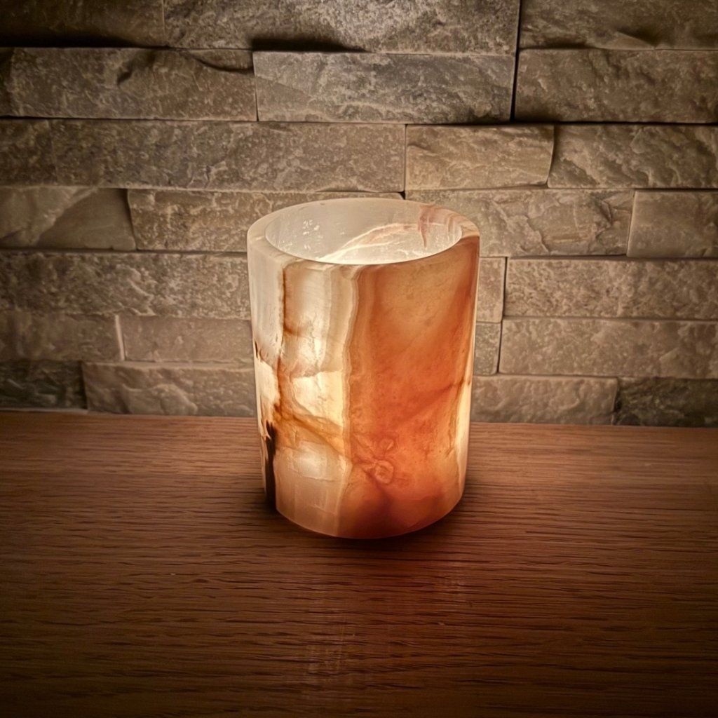 Svícen je vyroben z přírodního aragonitu, známého také jako pákistánský onyx. Tento kámen vyniká pevností, jemným leskem a přirozenou kresbou, která vznikala po tisíce let. Kupujete přesně ten svícen, který vidíte na fotografiích, žádný náhodný výběr, ale konkrétní originální kus.