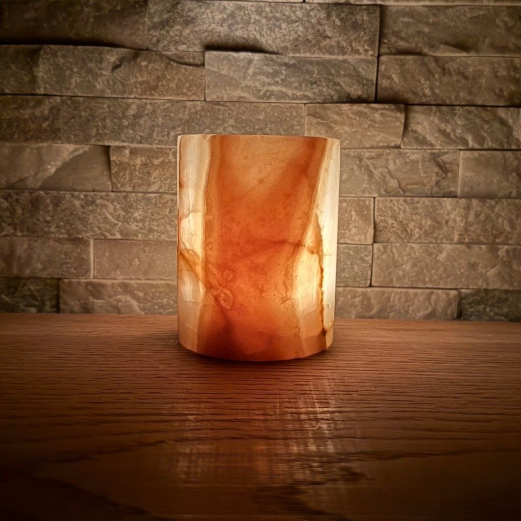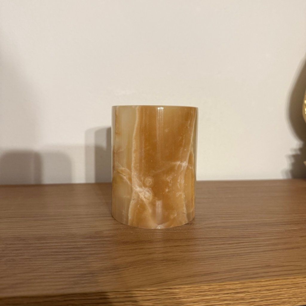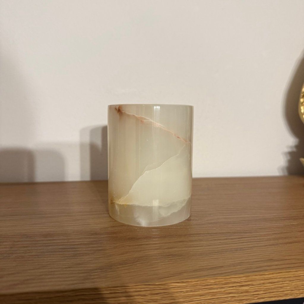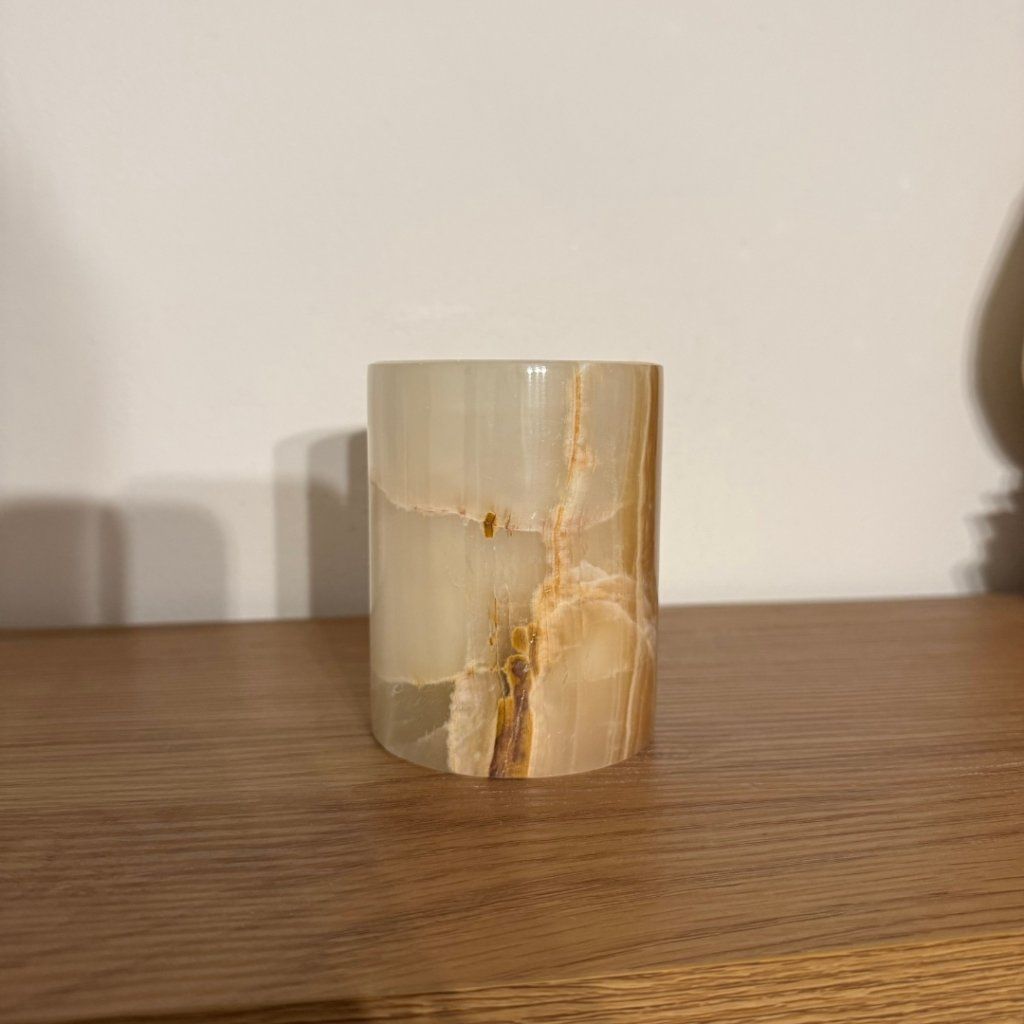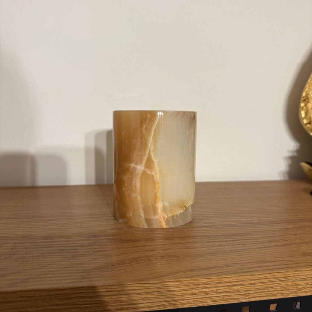 Svícen je vyroben z přírodního aragonitu, známého také jako pákistánský onyx. Tento kámen vyniká pevností, jemným leskem a přirozenou kresbou, která vznikala po tisíce let. Kupujete přesně ten svícen, který vidíte na fotografiích, žádný náhodný výběr, ale konkrétní originální kus.