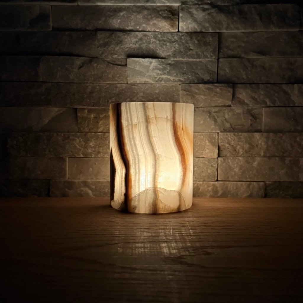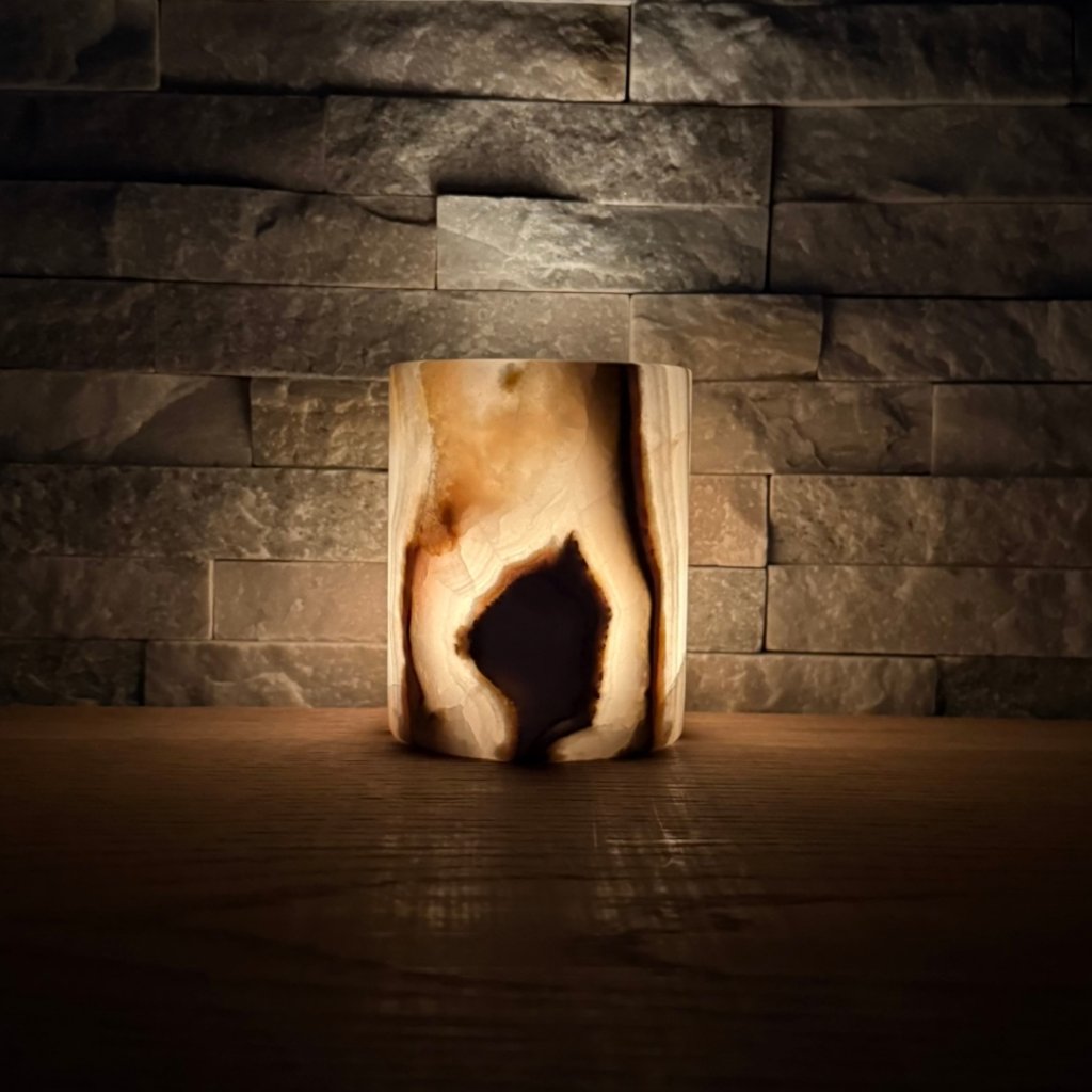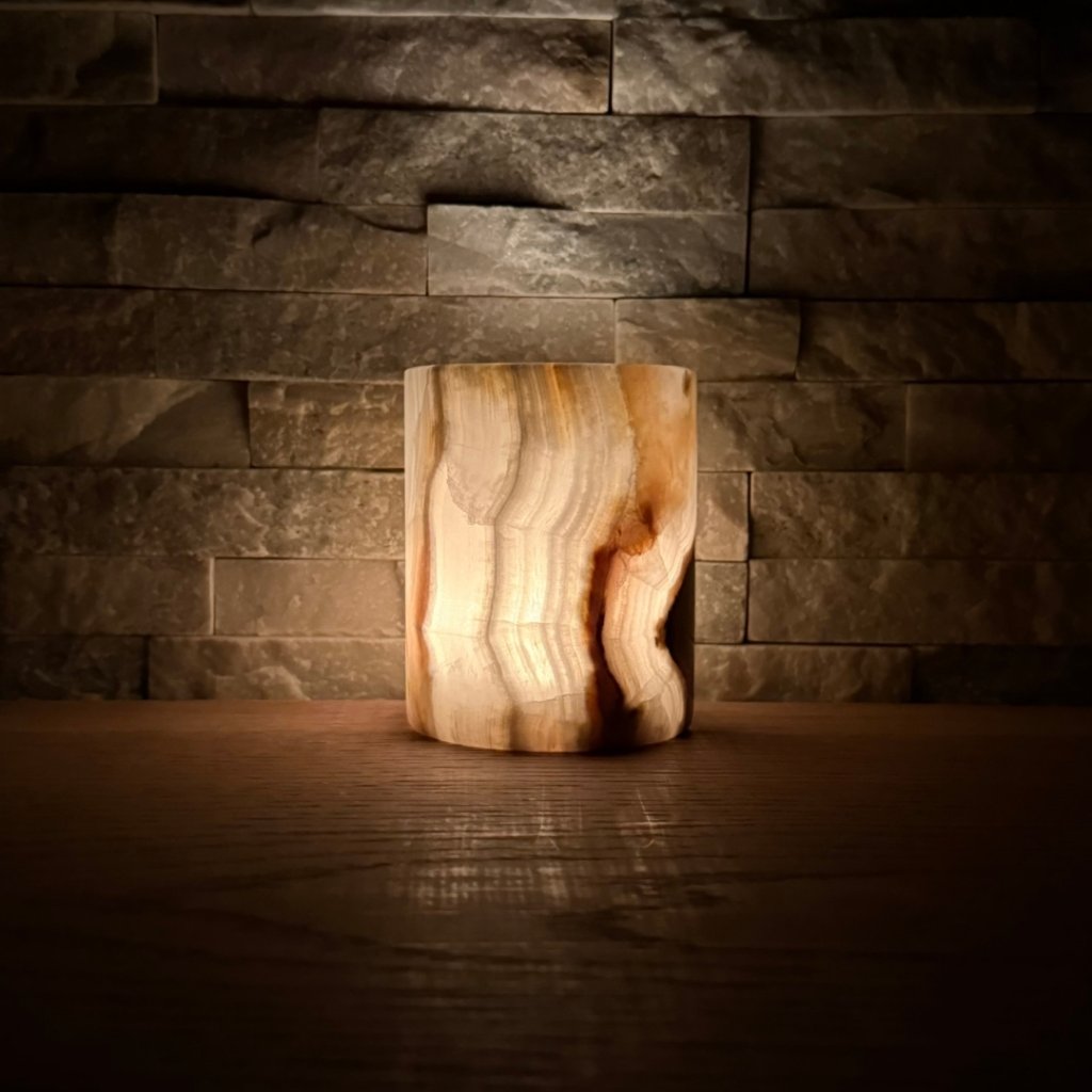 Svícen je vyroben z přírodního aragonitu, známého také jako pákistánský onyx. Tento kámen vyniká pevností, jemným leskem a přirozenou kresbou, která vznikala po tisíce let. Kupujete přesně ten svícen, který vidíte na fotografiích, žádný náhodný výběr, ale konkrétní originální kus.