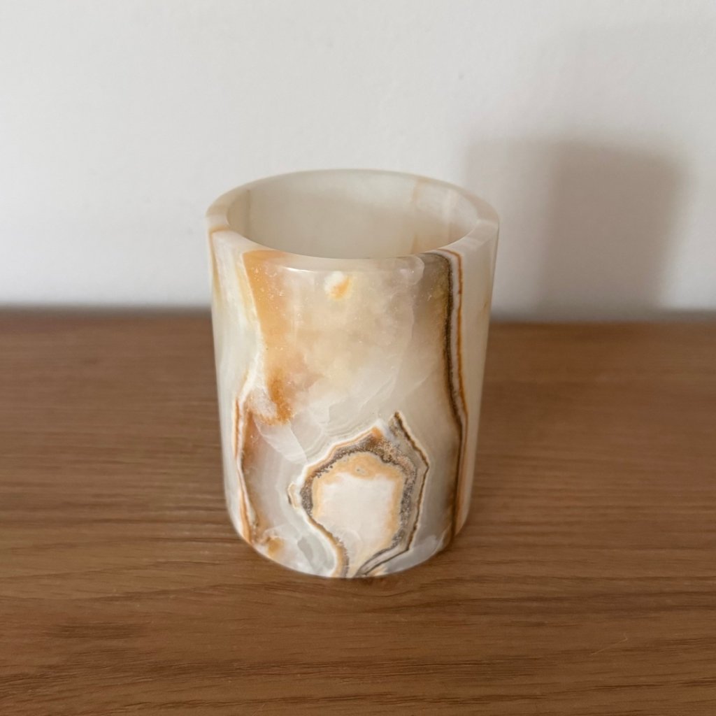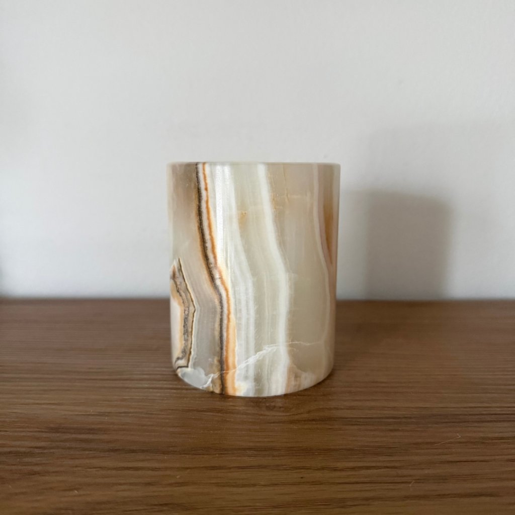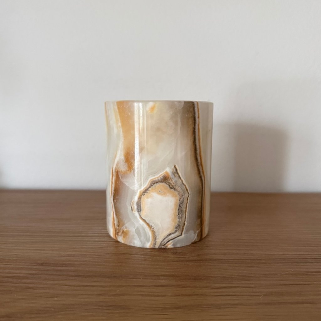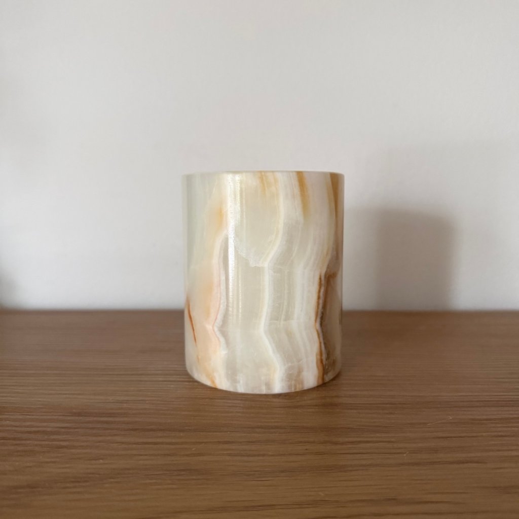 Svícen je vyroben z přírodního aragonitu, známého také jako pákistánský onyx. Tento kámen vyniká pevností, jemným leskem a přirozenou kresbou, která vznikala po tisíce let. Kupujete přesně ten svícen, který vidíte na fotografiích, žádný náhodný výběr, ale konkrétní originální kus.
