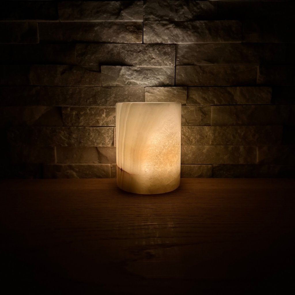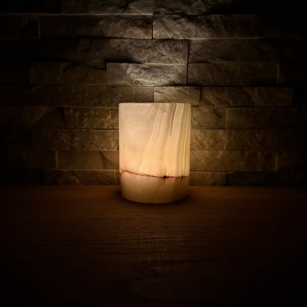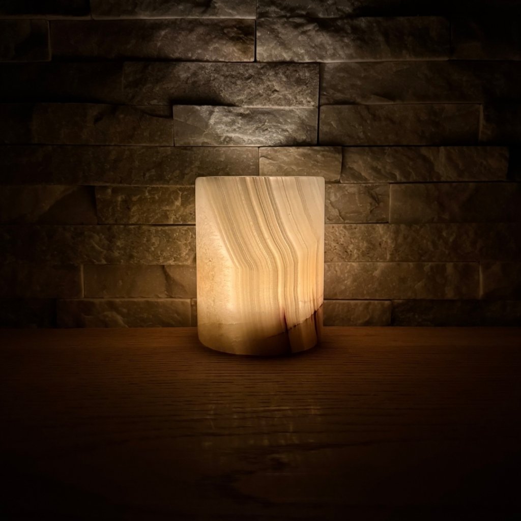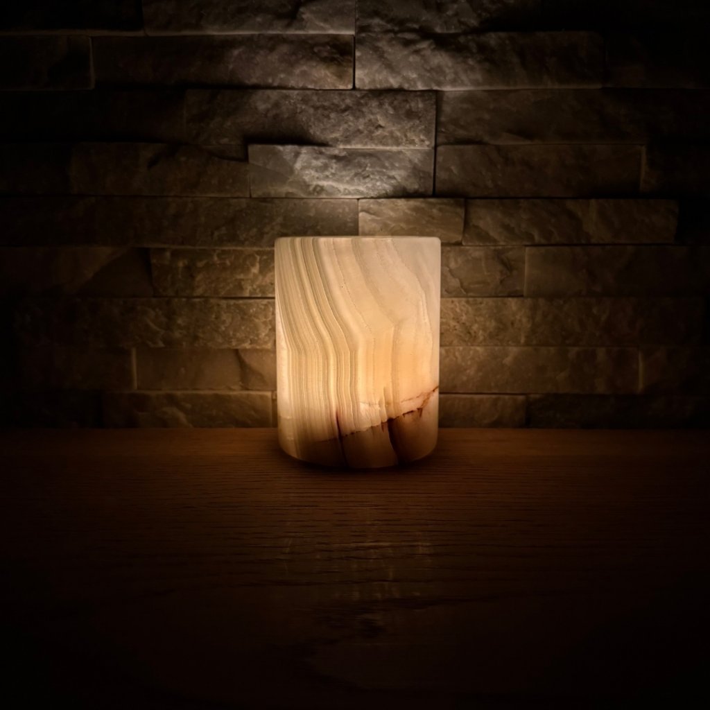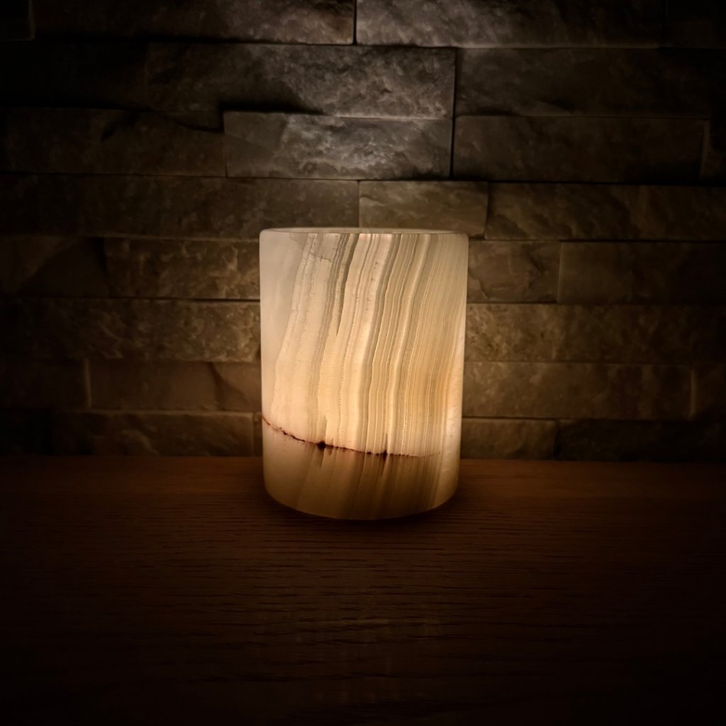 Svícen je vyroben z přírodního aragonitu, známého také jako pákistánský onyx. Tento kámen vyniká pevností, jemným leskem a přirozenou kresbou, která vznikala po tisíce let. Kupujete přesně ten svícen, který vidíte na fotografiích, žádný náhodný výběr, ale konkrétní originální kus.