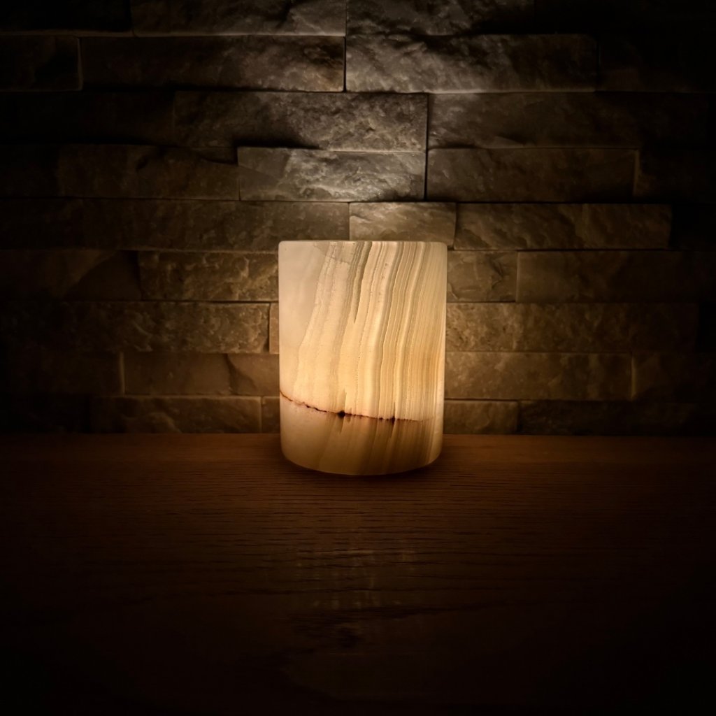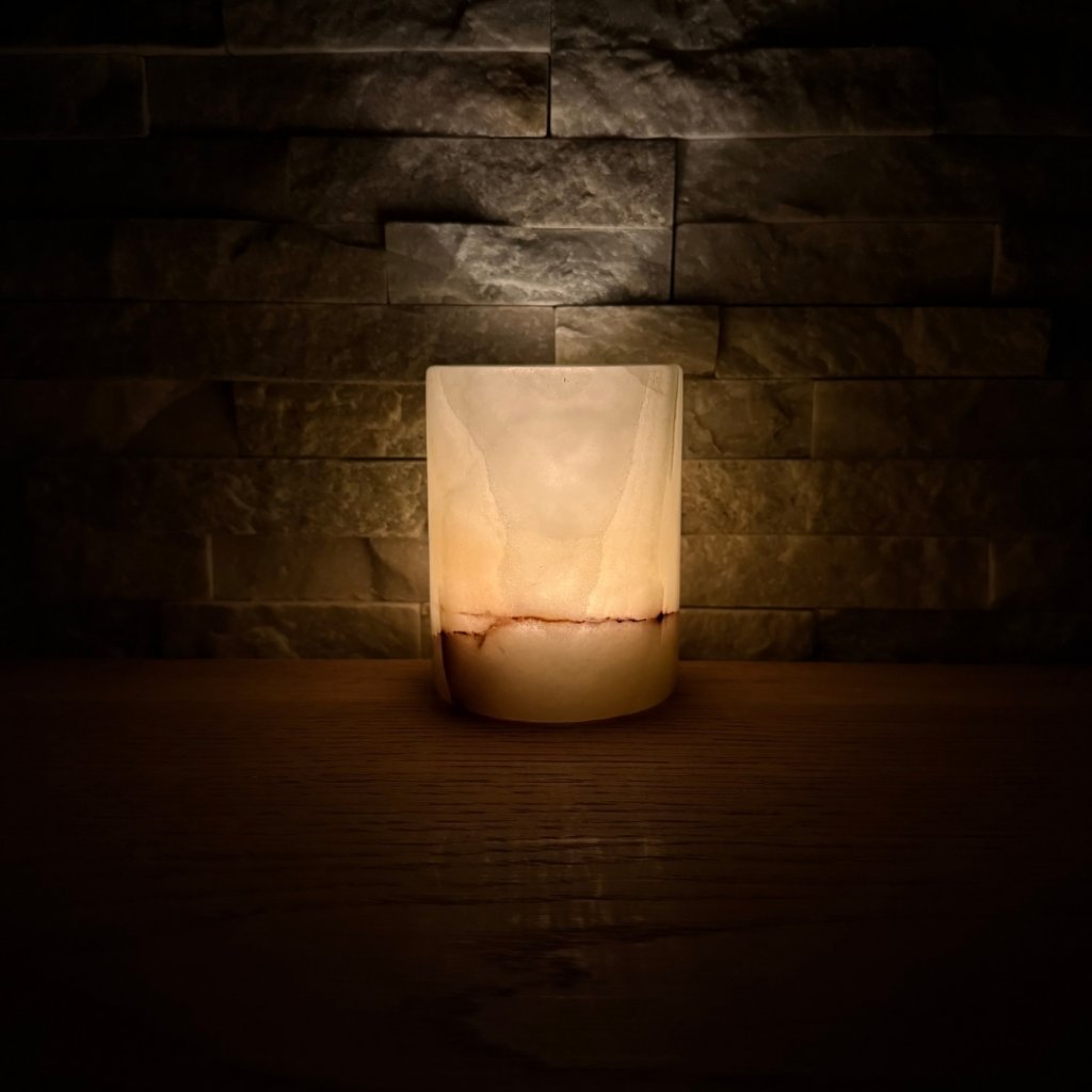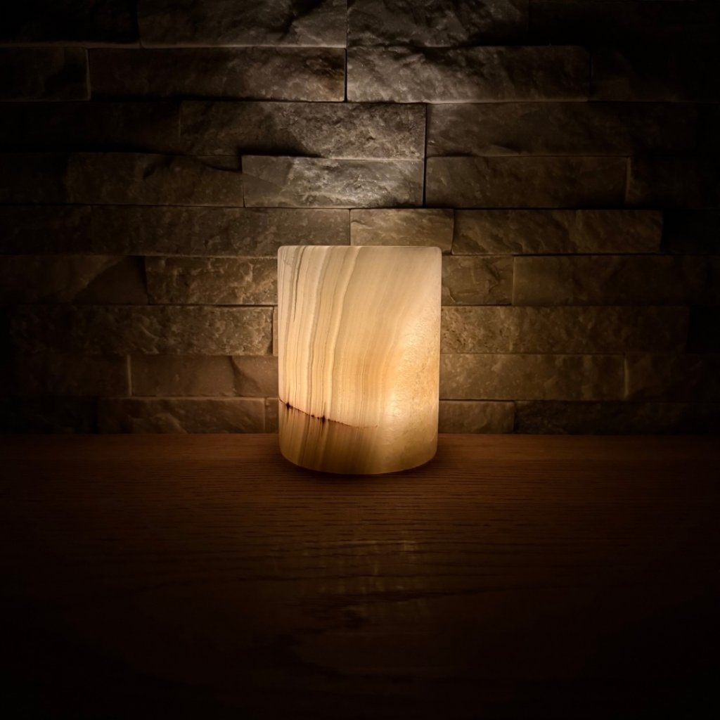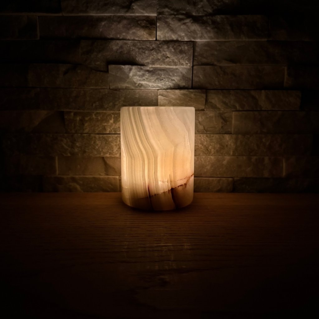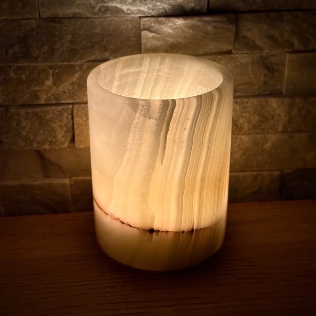 Svícen je vyroben z přírodního aragonitu, známého také jako pákistánský onyx. Tento kámen vyniká pevností, jemným leskem a přirozenou kresbou, která vznikala po tisíce let. Kupujete přesně ten svícen, který vidíte na fotografiích, žádný náhodný výběr, ale konkrétní originální kus.