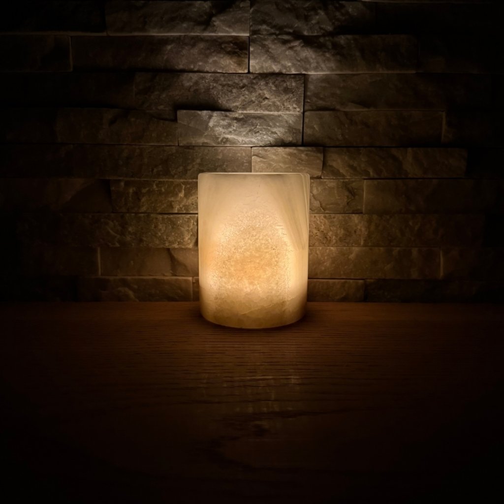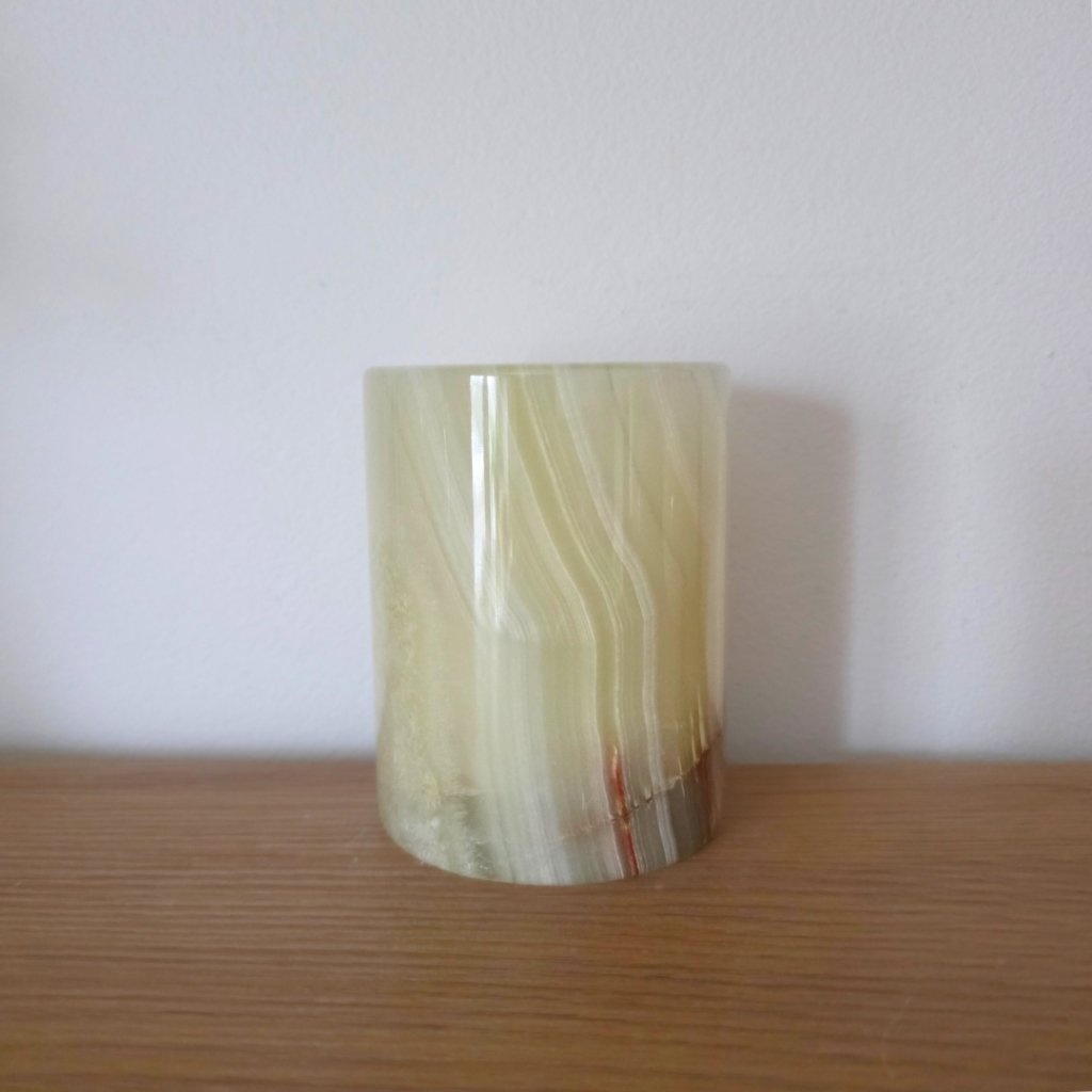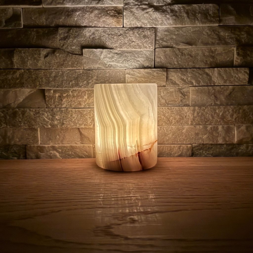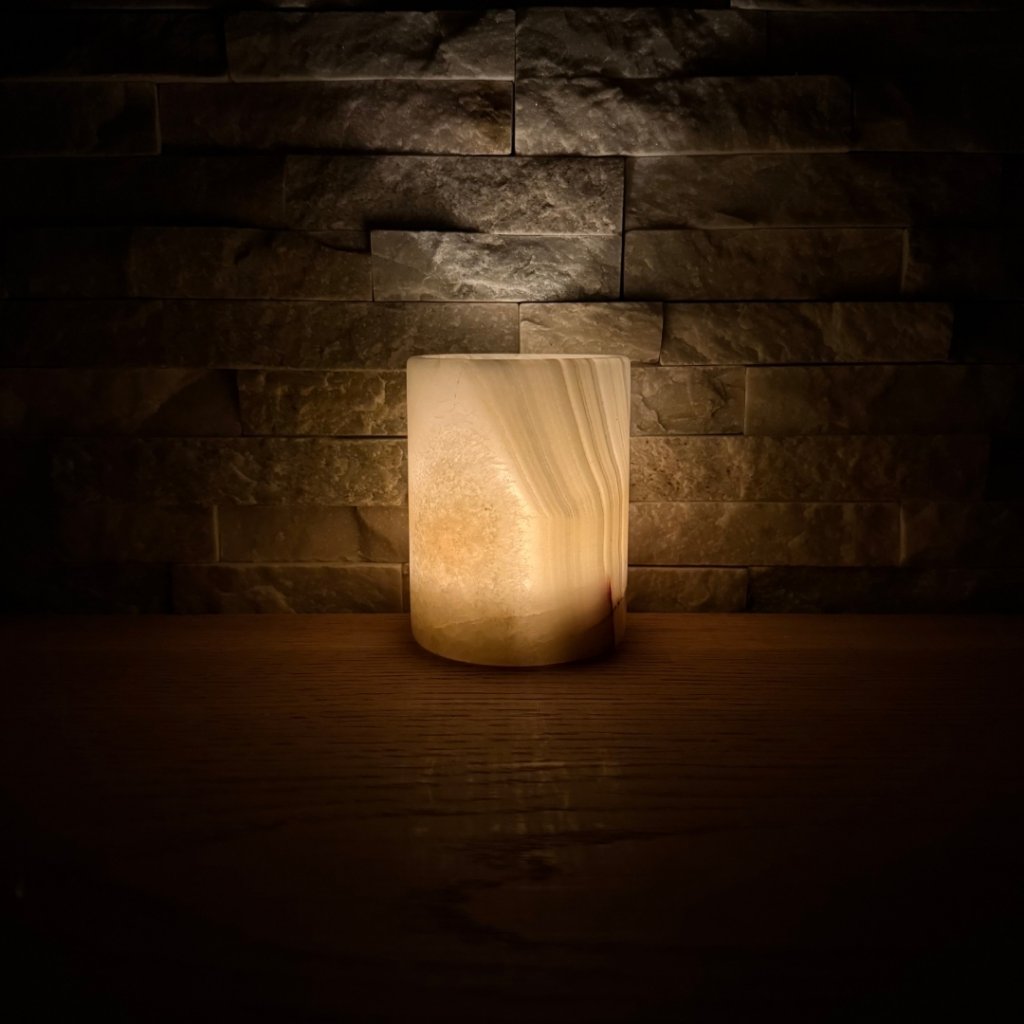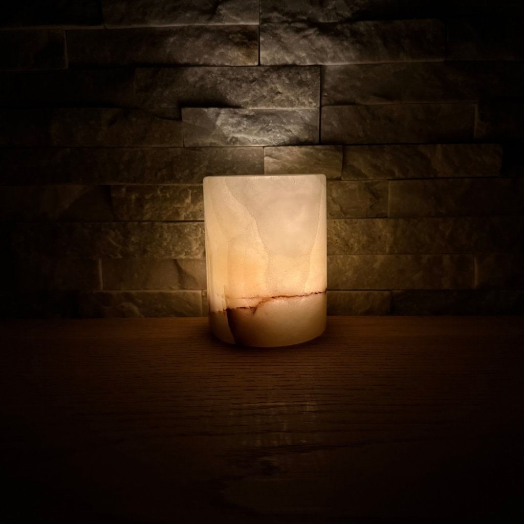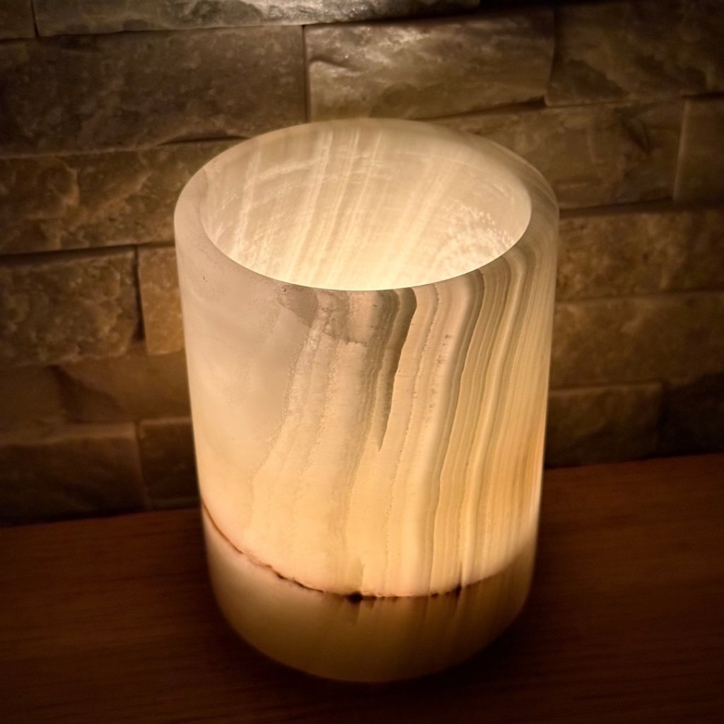 Svícen je vyroben z přírodního aragonitu, známého také jako pákistánský onyx. Tento kámen vyniká pevností, jemným leskem a přirozenou kresbou, která vznikala po tisíce let. Kupujete přesně ten svícen, který vidíte na fotografiích, žádný náhodný výběr, ale konkrétní originální kus.