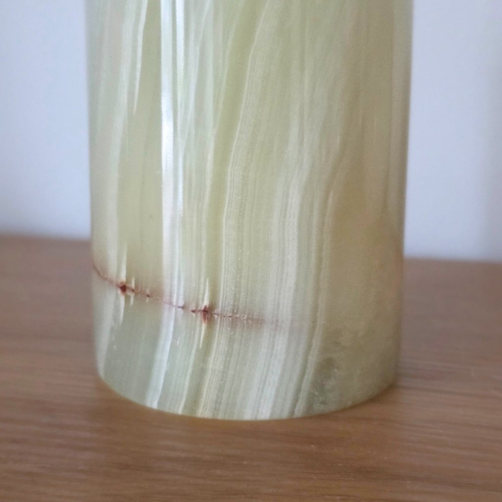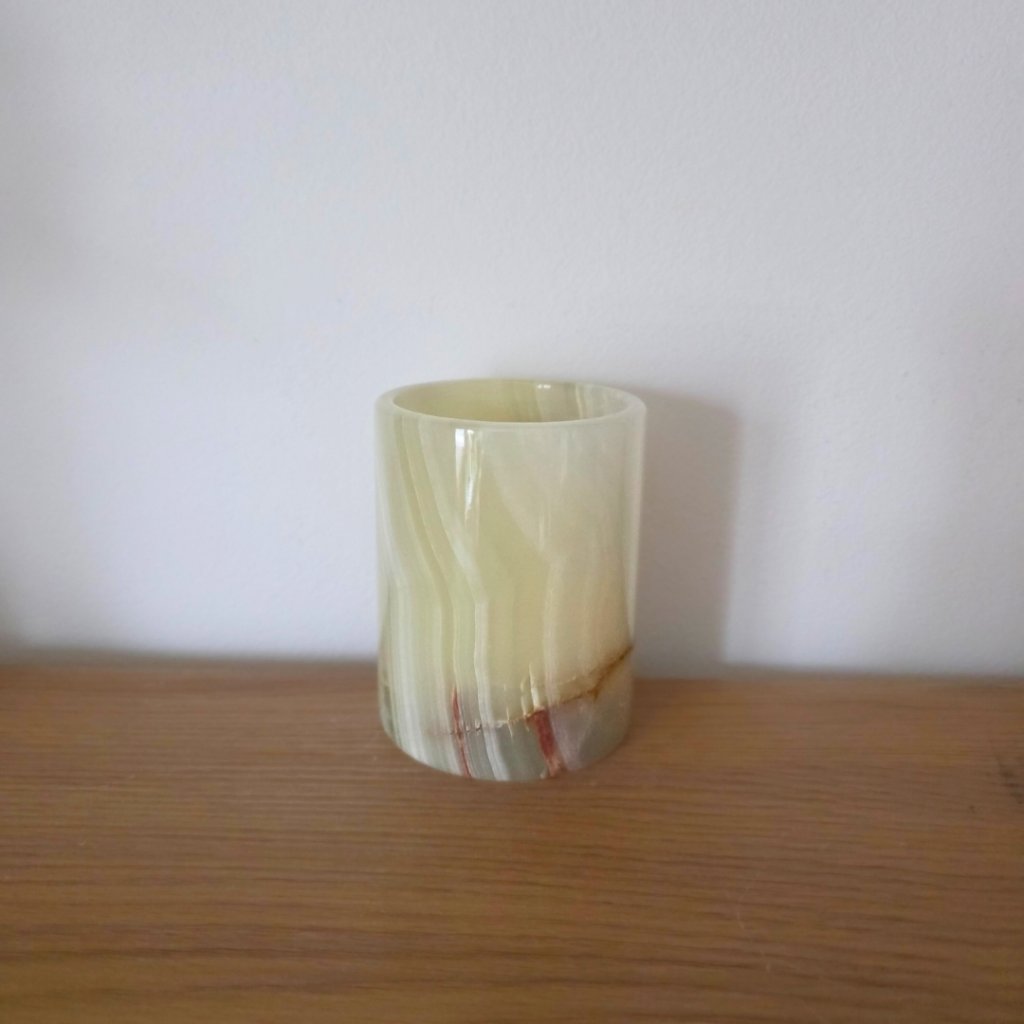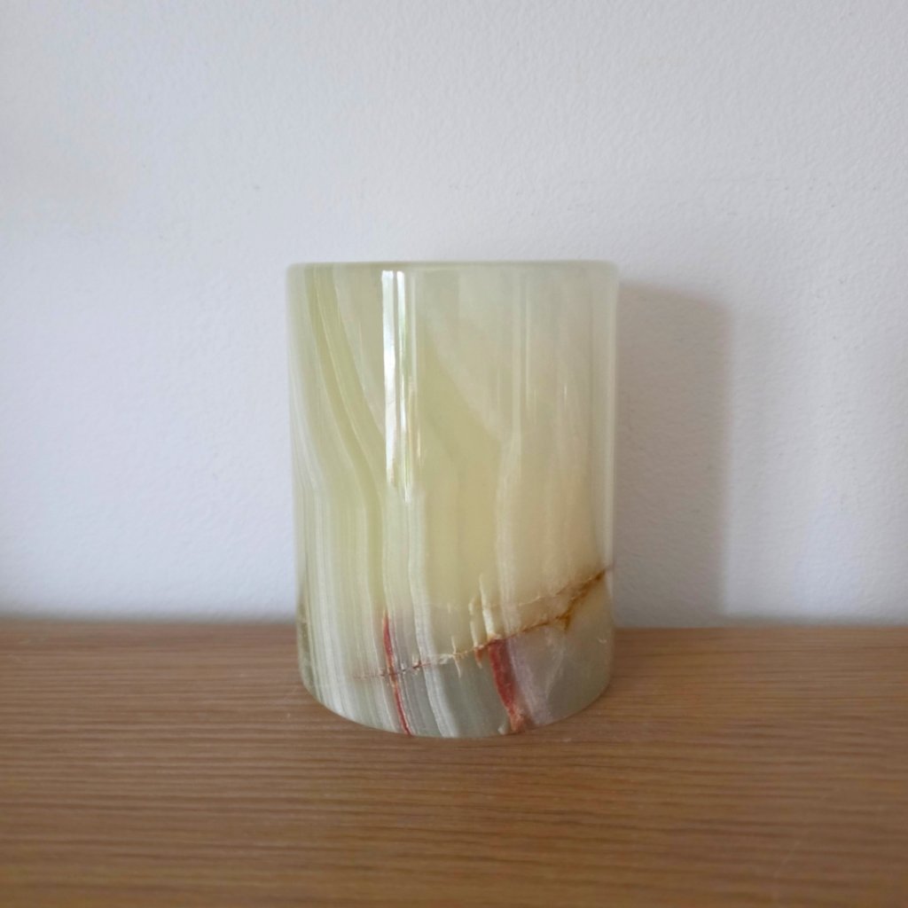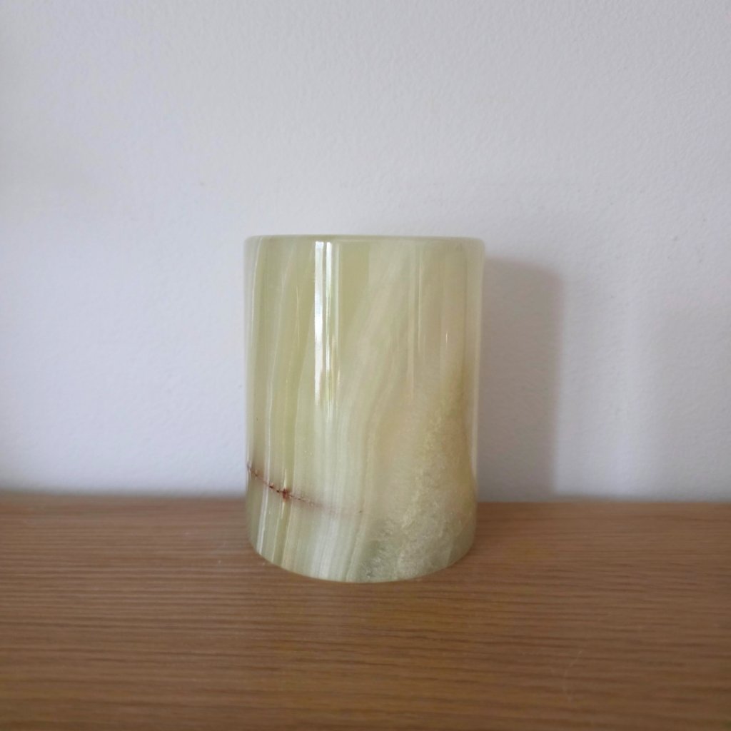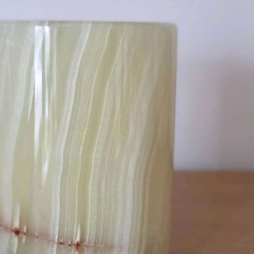 Svícen je vyroben z přírodního aragonitu, známého také jako pákistánský onyx. Tento kámen vyniká pevností, jemným leskem a přirozenou kresbou, která vznikala po tisíce let. Kupujete přesně ten svícen, který vidíte na fotografiích, žádný náhodný výběr, ale konkrétní originální kus.