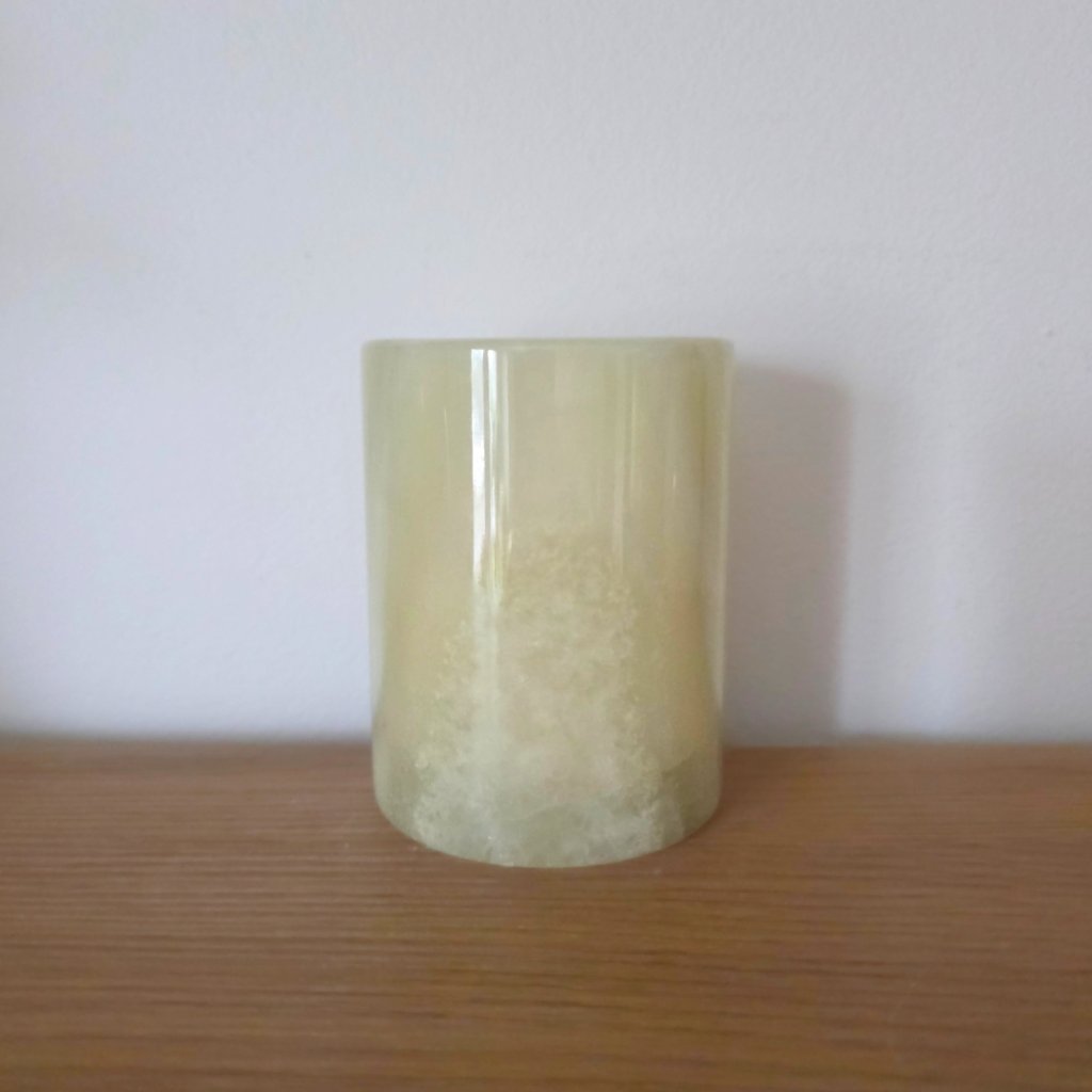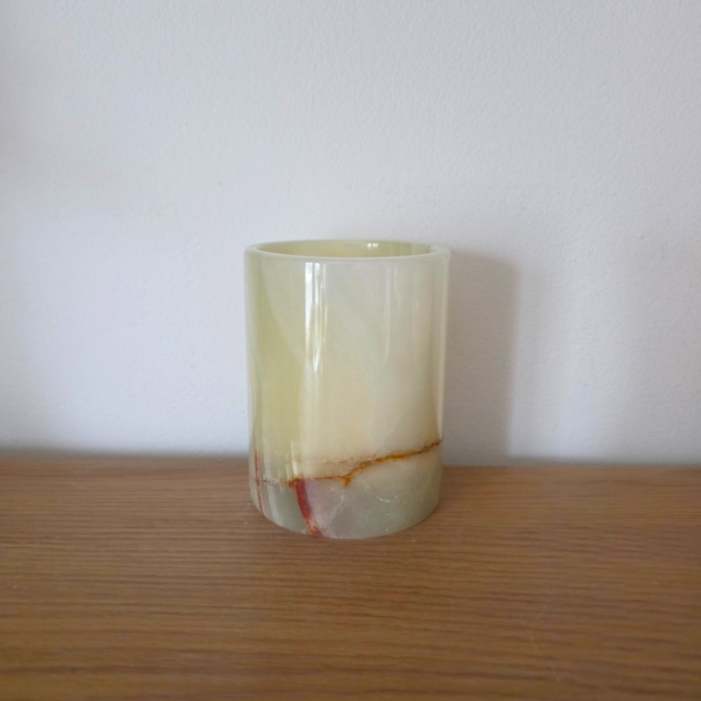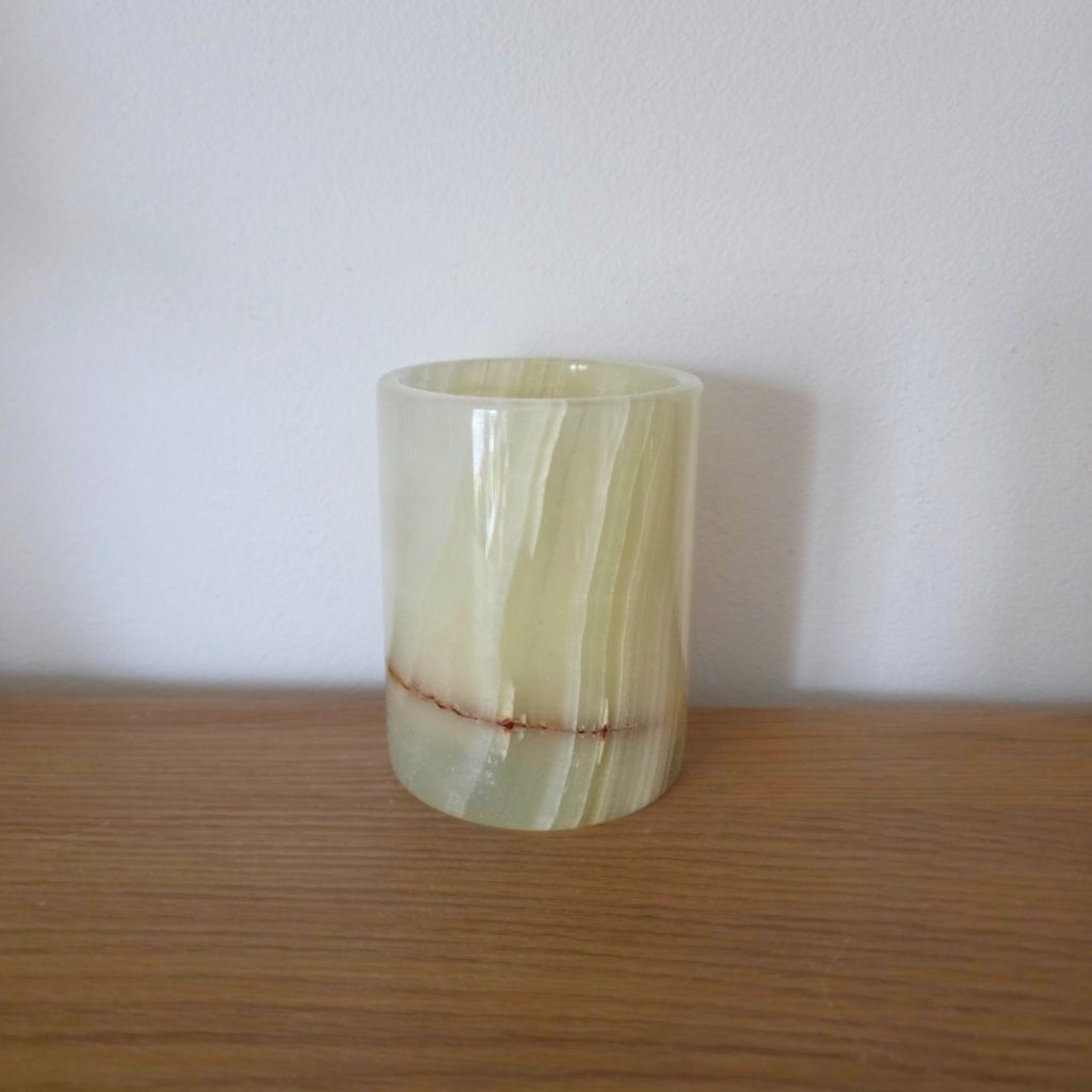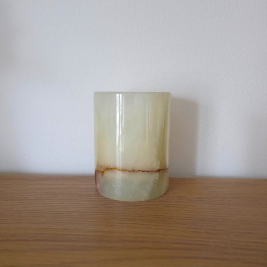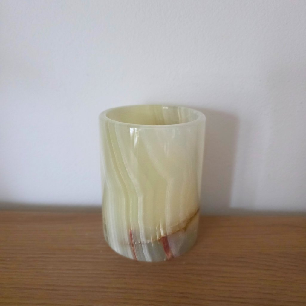 Svícen je vyroben z přírodního aragonitu, známého také jako pákistánský onyx. Tento kámen vyniká pevností, jemným leskem a přirozenou kresbou, která vznikala po tisíce let. Kupujete přesně ten svícen, který vidíte na fotografiích, žádný náhodný výběr, ale konkrétní originální kus.