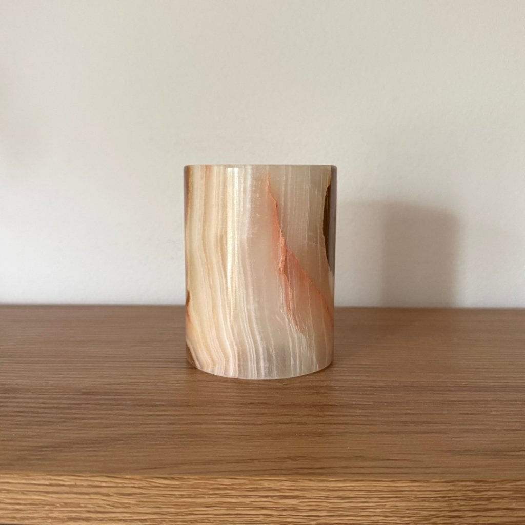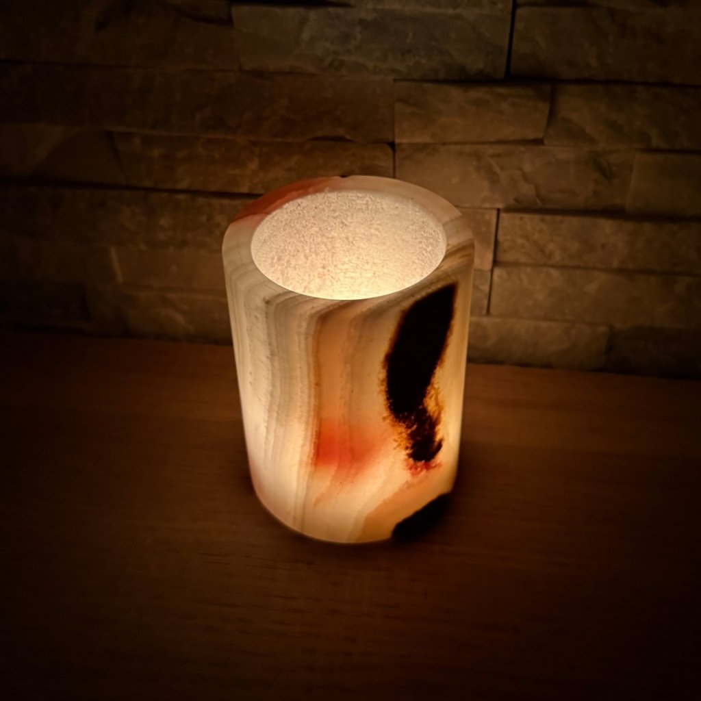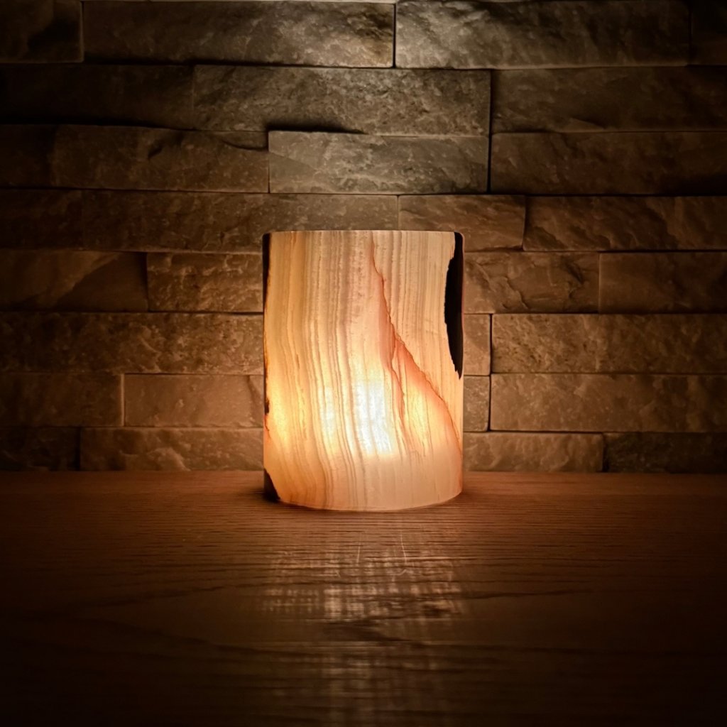 Svícen je vyroben z přírodního aragonitu, známého také jako pákistánský onyx. Tento kámen vyniká pevností, jemným leskem a přirozenou kresbou, která vznikala po tisíce let. Kupujete přesně ten svícen, který vidíte na fotografiích, žádný náhodný výběr, ale konkrétní originální kus.