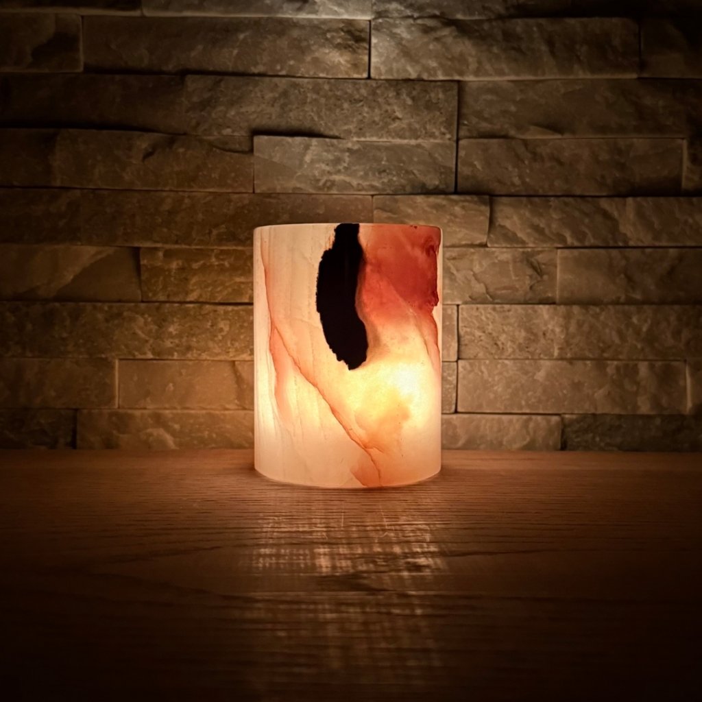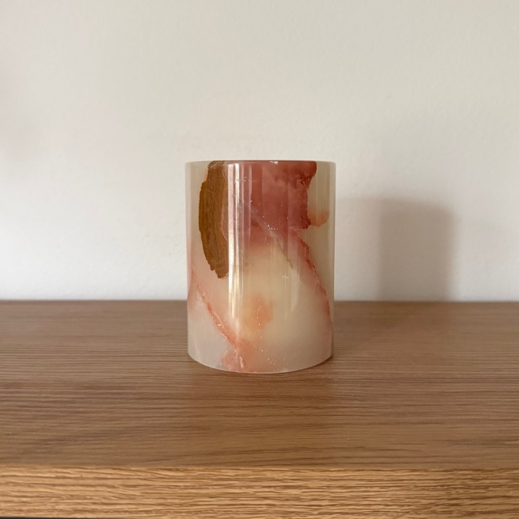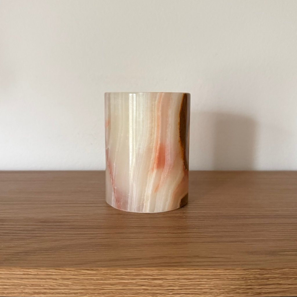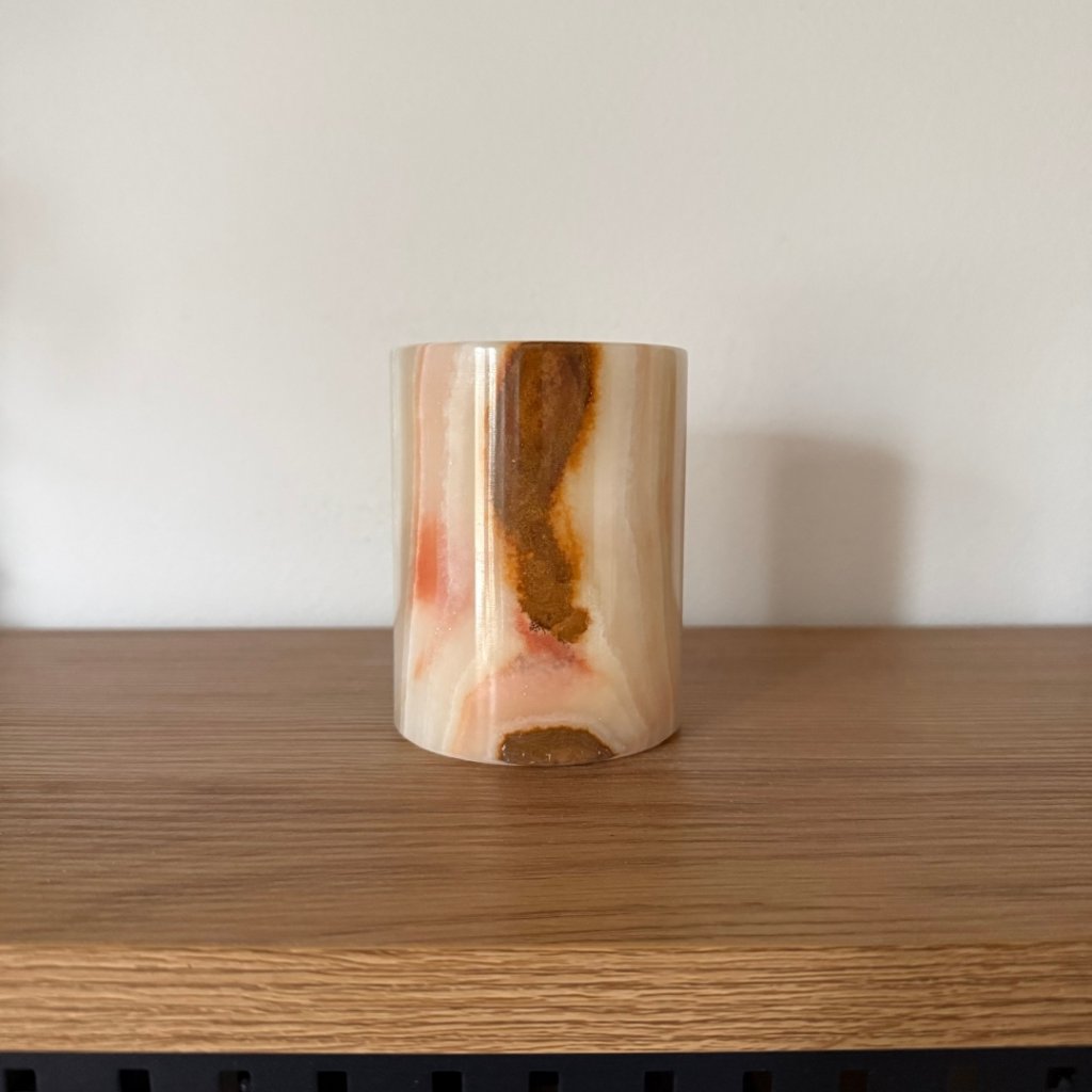 Svícen je vyroben z přírodního aragonitu, známého také jako pákistánský onyx. Tento kámen vyniká pevností, jemným leskem a přirozenou kresbou, která vznikala po tisíce let. Kupujete přesně ten svícen, který vidíte na fotografiích, žádný náhodný výběr, ale konkrétní originální kus.