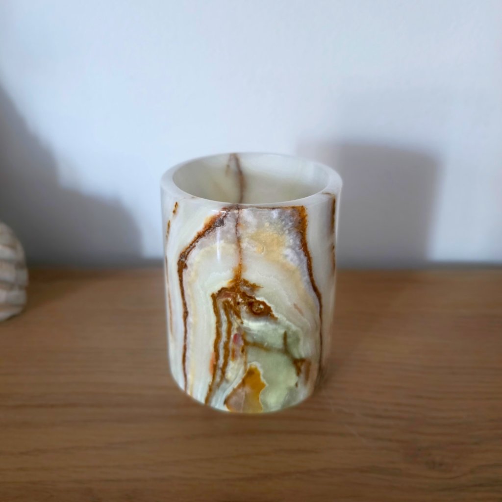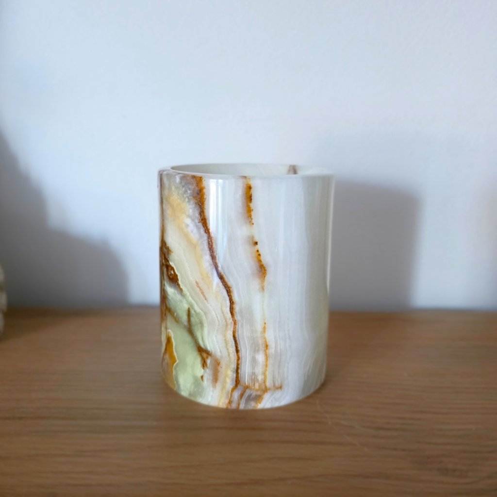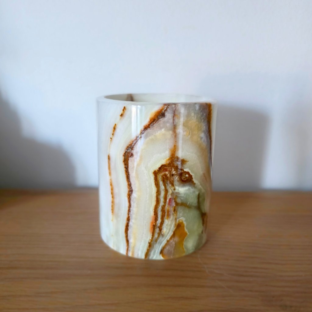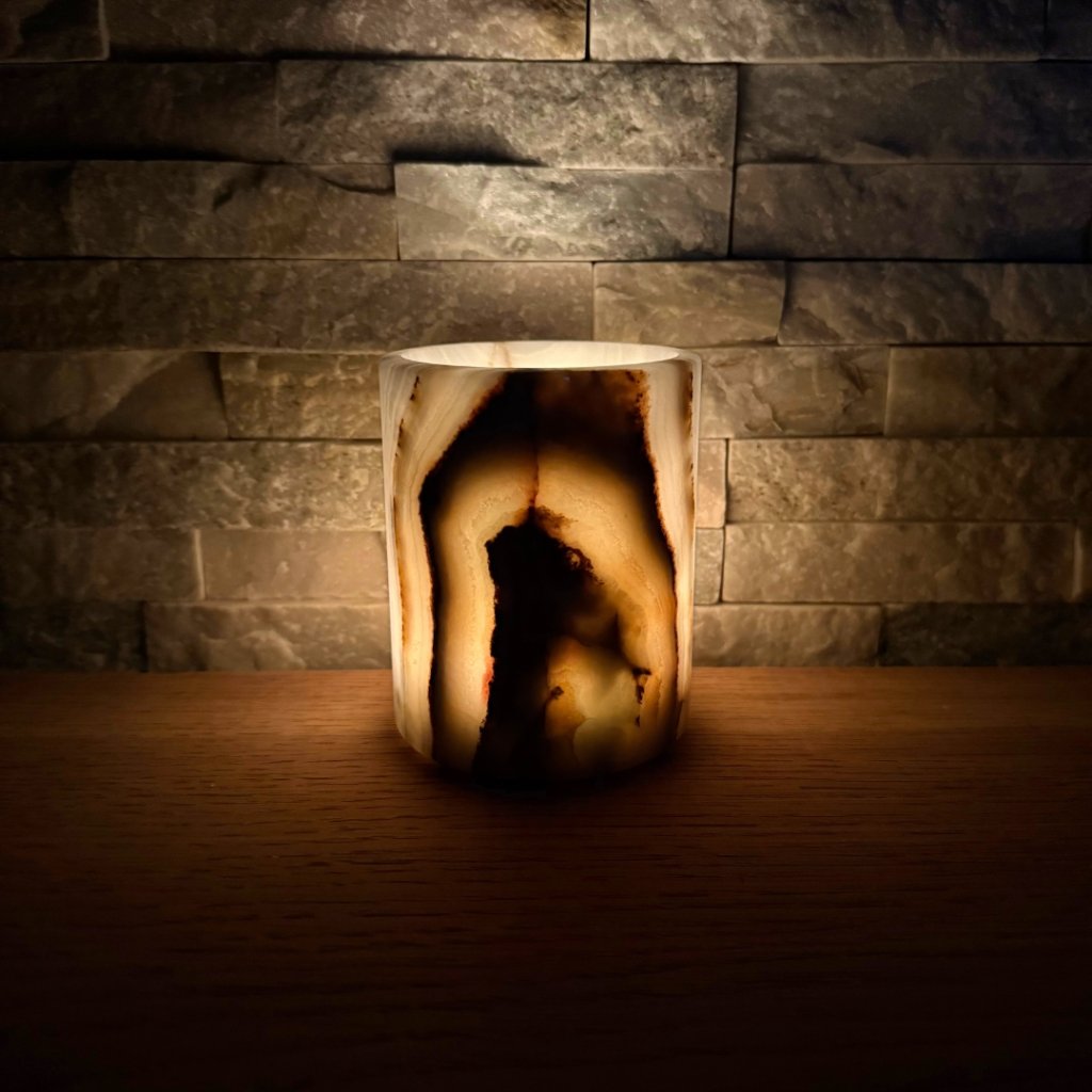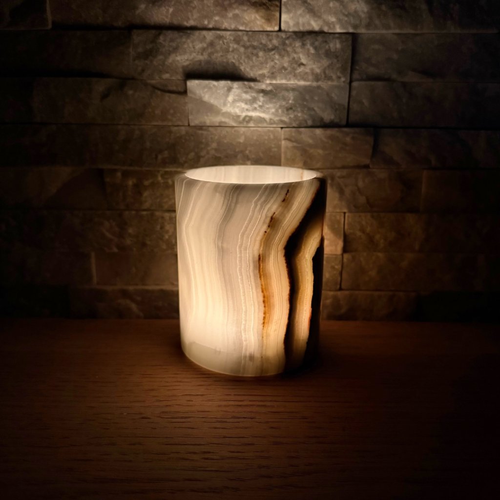 Svícen je vyroben z přírodního aragonitu, známého také jako pákistánský onyx. Tento kámen vyniká pevností, jemným leskem a přirozenou kresbou, která vznikala po tisíce let. Kupujete přesně ten svícen, který vidíte na fotografiích, žádný náhodný výběr, ale konkrétní originální kus.